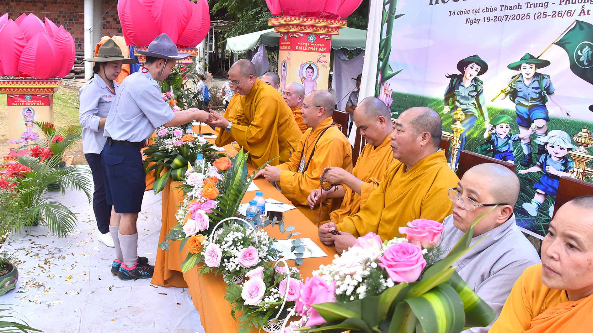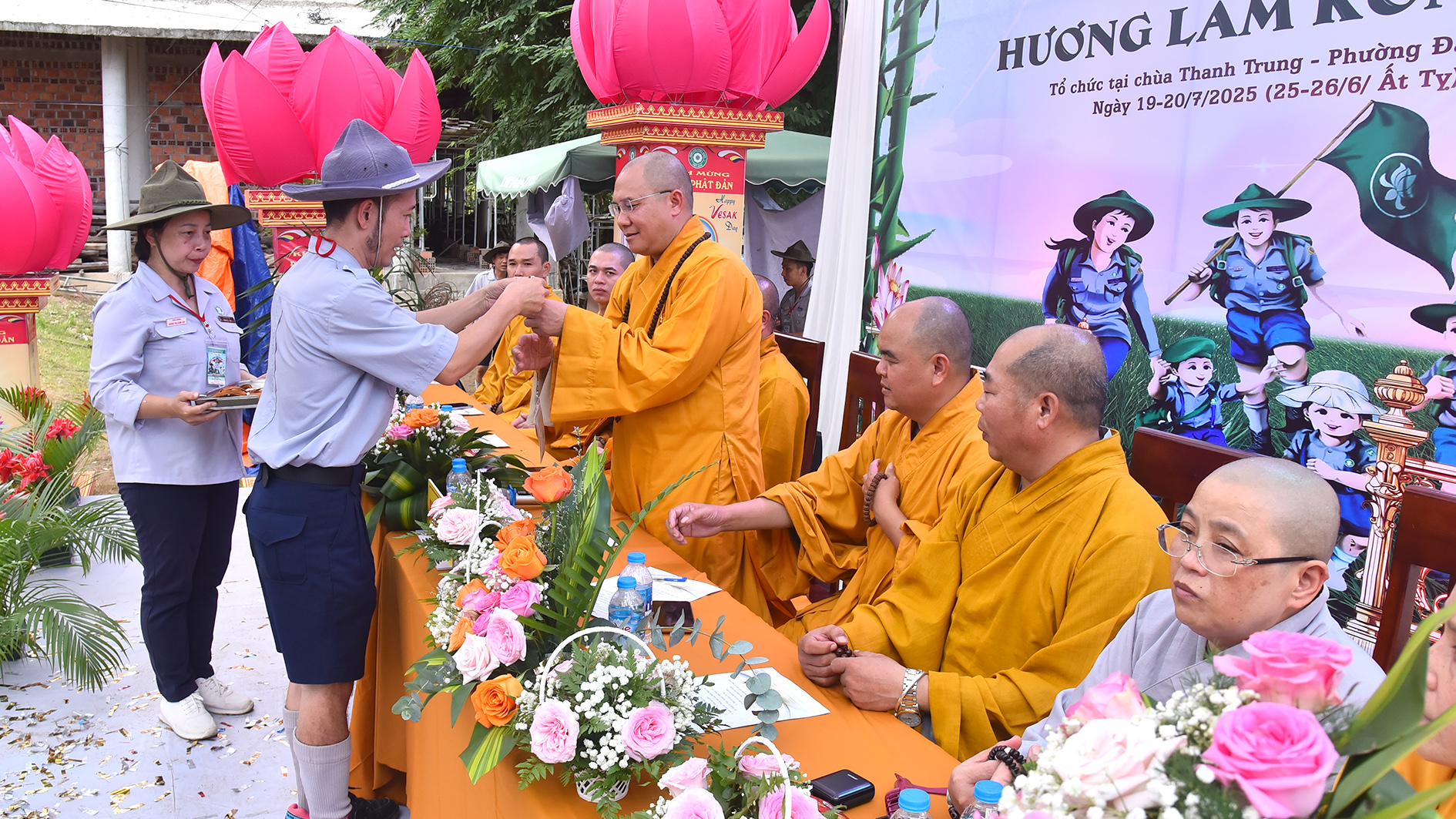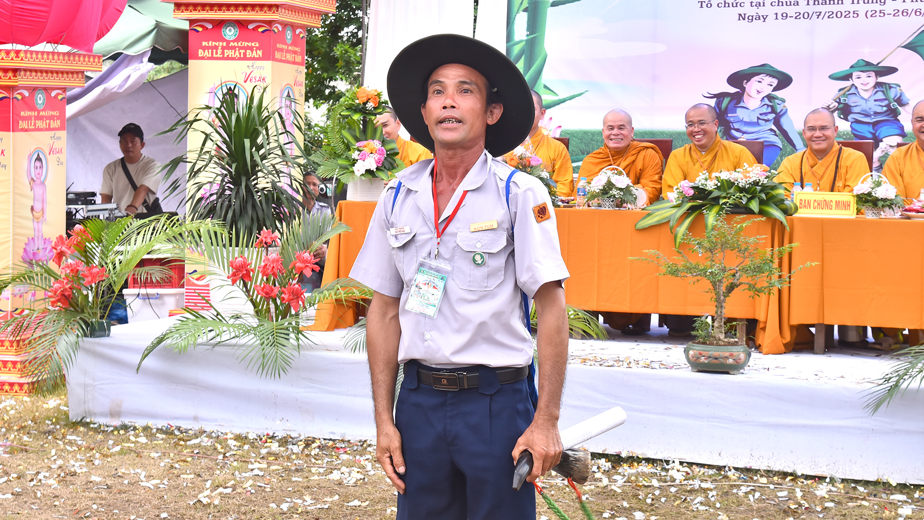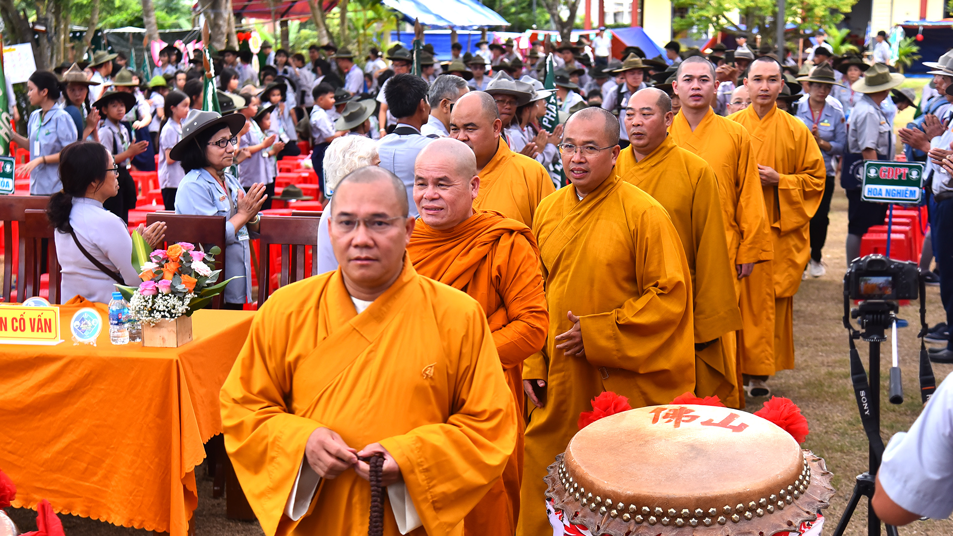 Cuối buổi lễ, TT. Thích Vạn Nhơn, đã ban lời đạo từ đầy xúc động: Thầy rất hoan hỷ khi thấy màu áo lam hội tụ về đây, cùng chung niềm vui, cùng thắp sáng ngọn lửa yêu thương và phụng sự. Trại họp bạn không chỉ là nơi giao lưu, chia sẻ mà còn là môi trường để các con học hạnh khiêm cung, nuôi dưỡng tâm từ bi và tinh thần trách nhiệm. Mong các Huynh trưởng lấy tình lam mà dìu dắt đàn em, mong các em Đoàn sinh lấy niềm tin Phật pháp mà vững bước trong đời. Mỗi sinh hoạt, mỗi bài ca, mỗi nụ cười trong trại này đều là hạt giống tốt gieo vào tâm hồn, để mai này khi rời trại, chúng ta mang theo hành trang đạo đức và tình thân quý giá, cùng nhau xây dựng GĐPT tỉnh nhà ngày càng vững mạnh.”