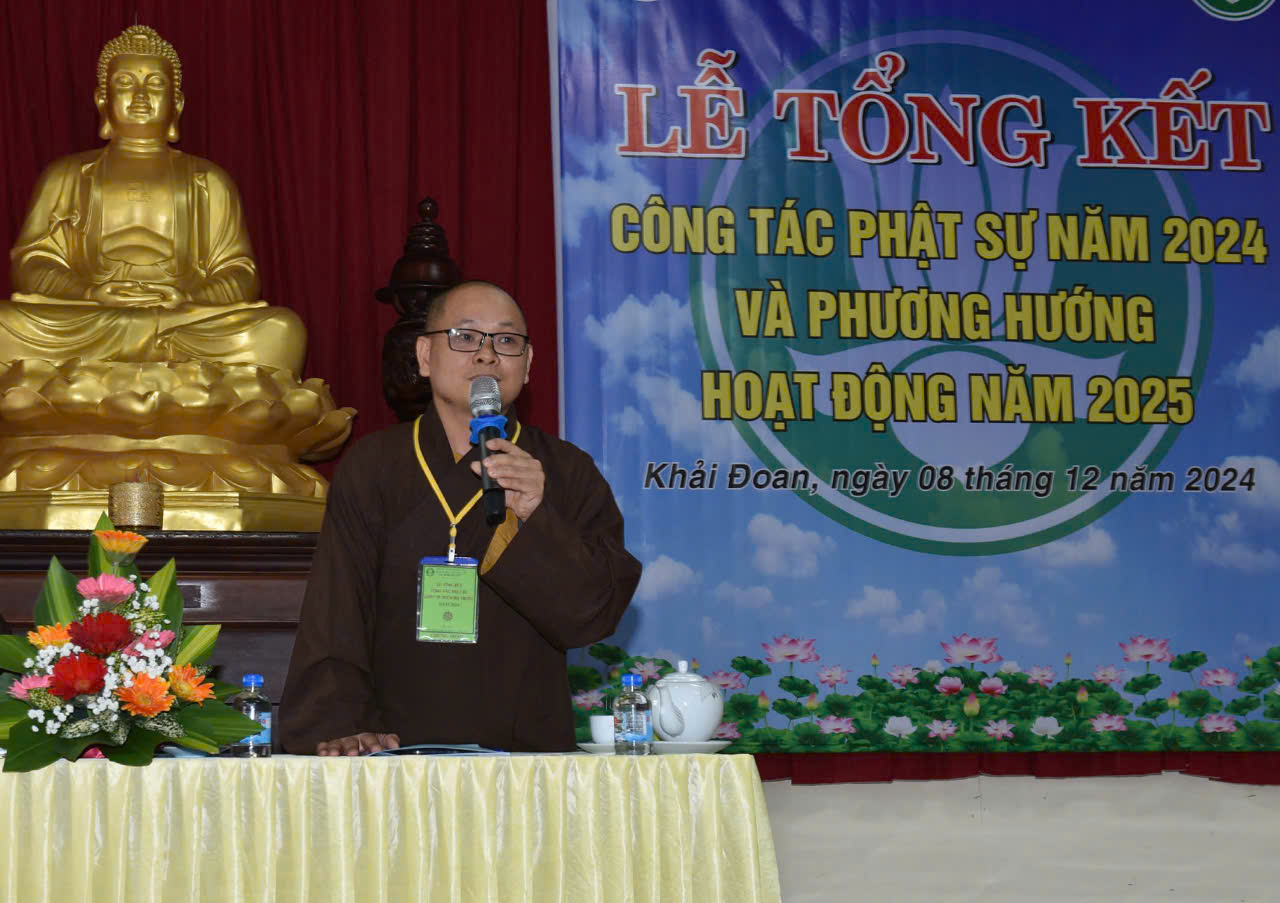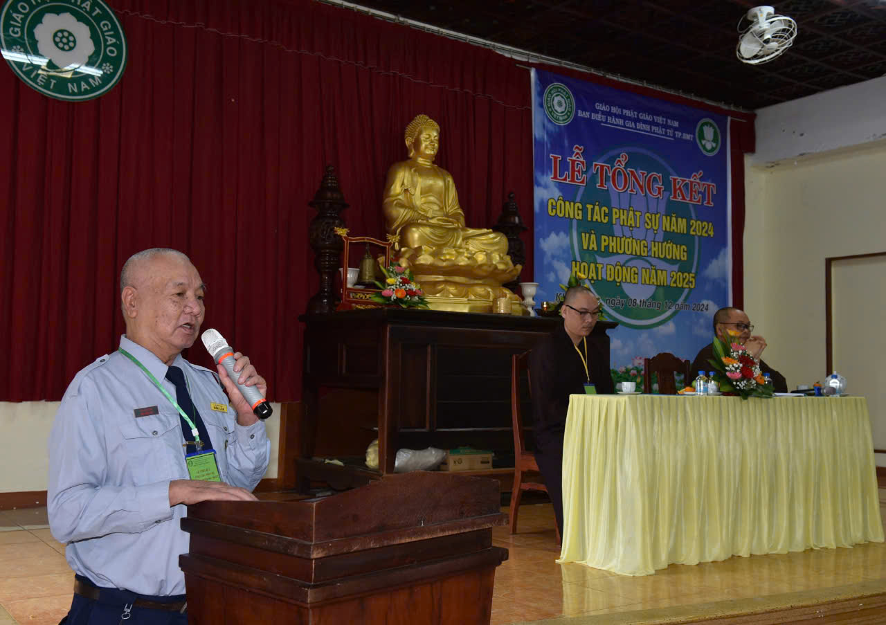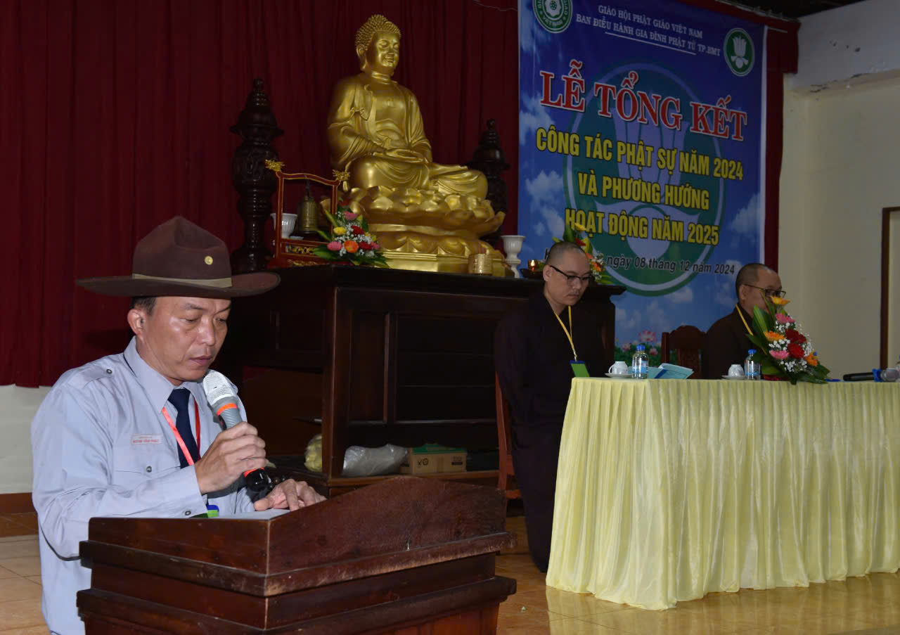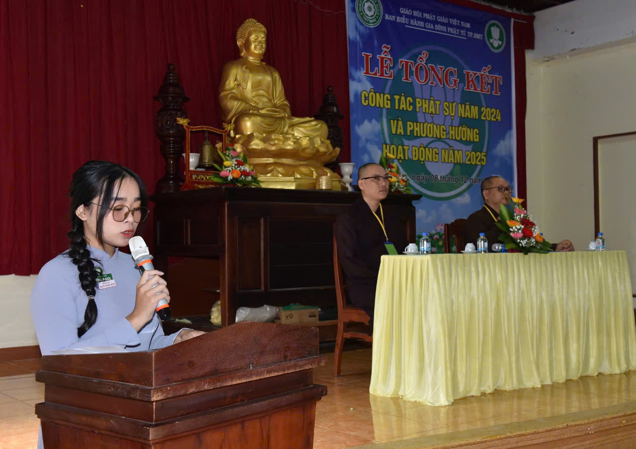 Huynh trưởng cấp Tấn Quãng Nguyện Phan Nhật Ánh phó ban ĐH đọc bảng báo cáo tổng kết công tác Phật sự năm 2024. Trong toàn Thành Phố có 19 đơn vị GĐPT, trên 200 HTr và có1028 đoàn sinh các nghành, có sút giảm nhưng không đáng kể. Những hoạt động khác ban Điều Hành đã kịp thời triển khai và thực hiện tốt công tác do Ban Trị Sự và Phân Ban GĐPT giao phó. Một số đơn vị cơ sở đã làm tốt công tác từ thiện và quyên góp giúp đỡ với tổng giá trị 441.218.000 đồng. Tuy nhiên bên cạnh những thành tựu đạt được vẫn còn nhiều vấn đề hạn chế trong sinh hoạt tu tập chưa đều đặn và đồng bộ. Kế hoạch và phương hướng hoạt động cho năm 2025 cũng được thông qua, hội nghị đã nhất trí.