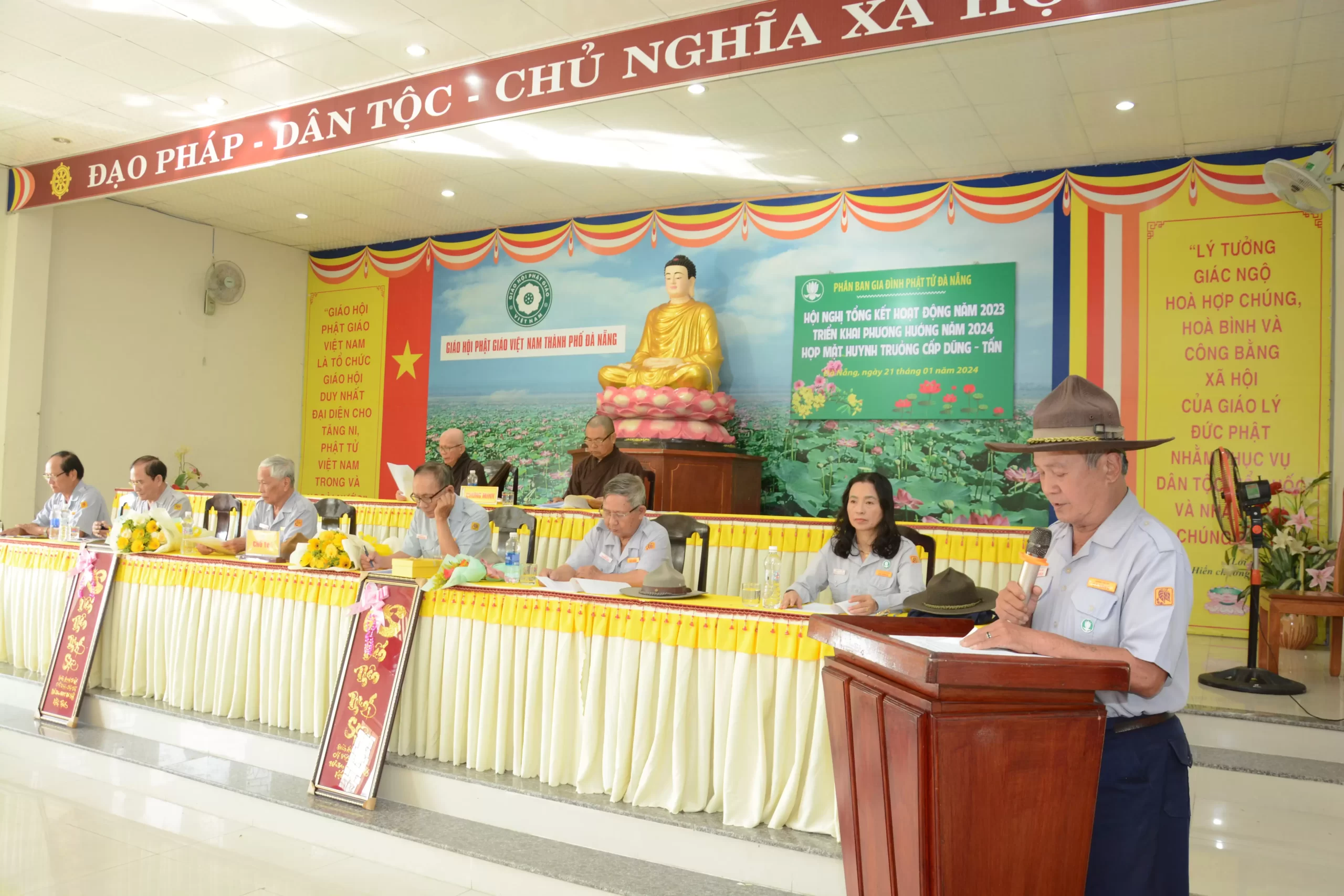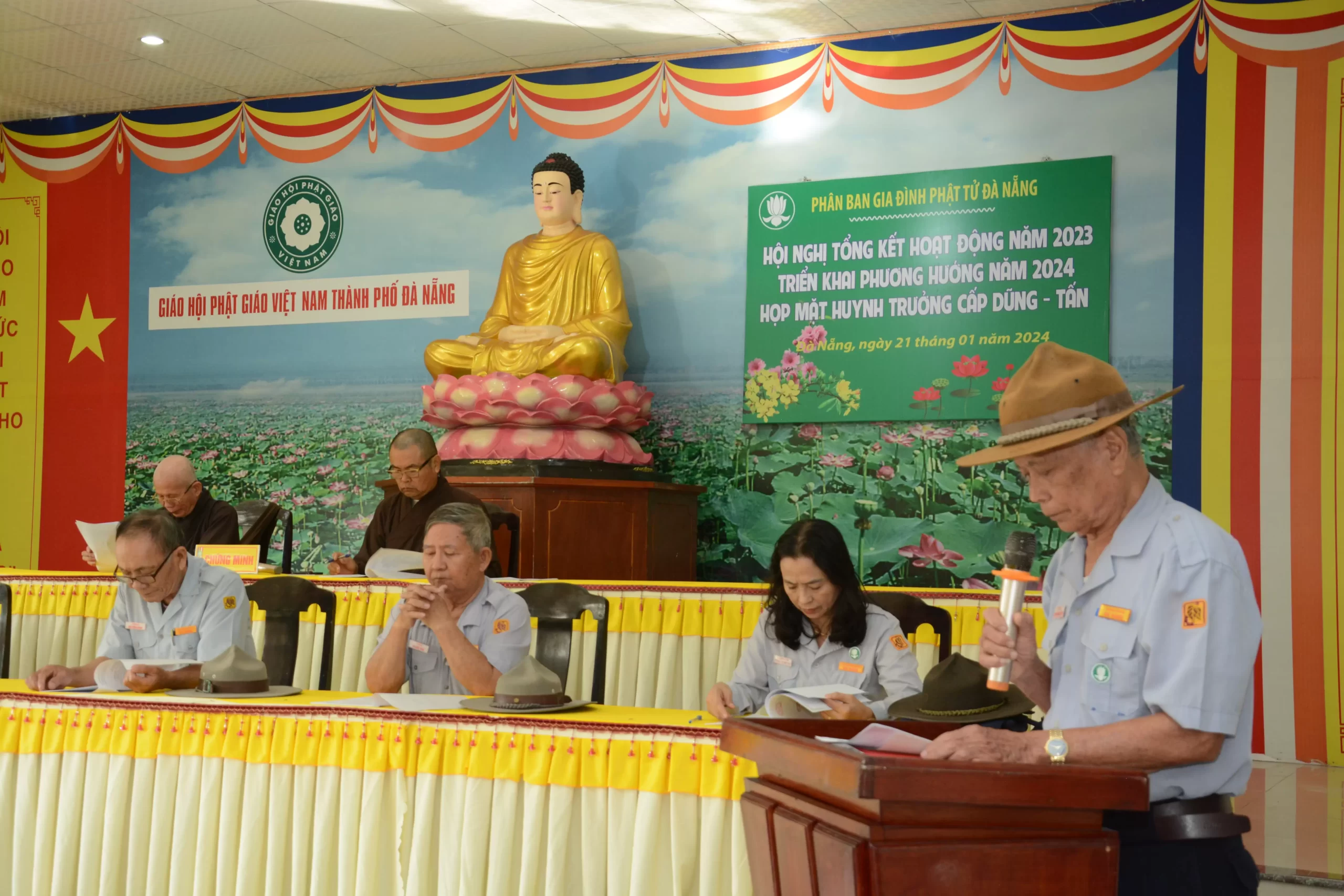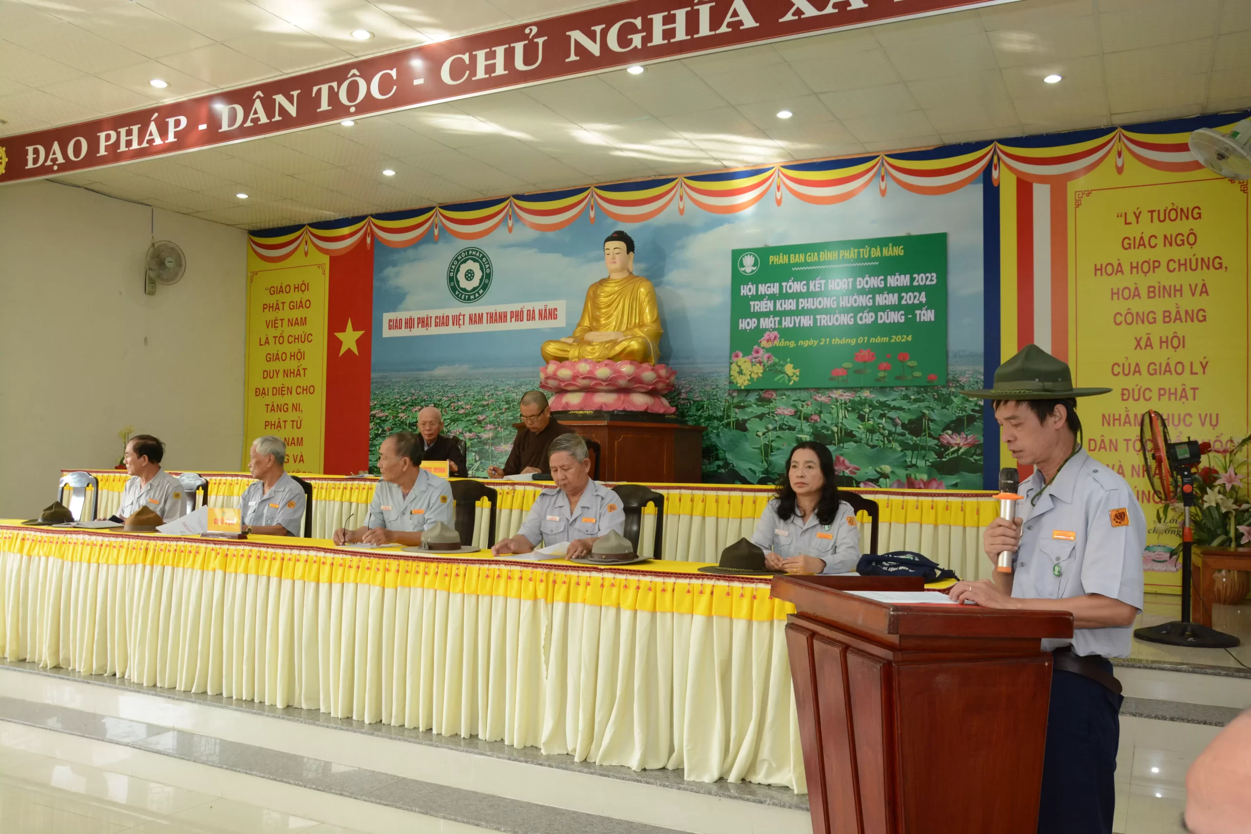 Huynh trưởng cấp Tấn Quảng Lương Ông Văn Lai – Chánh thư ký Phân ban Gia đình Phật tử Đà Nẵng đã đọc báo cáo các hoạt động Phật sự năm 2023, theo báo cáo Phân ban Gia đình Phật tử Đà Nẵng nhiệm kỳ VI (2022 – 2027) gồm 40 thành viên được Ban Trị sự GHPGVN Tp Đà Nẵng công nhận theo quyết định số 035/QĐ – BTS ngày 29 tháng 4 năm 2023. Hiện nay có 54 đơn vị sinh hoạt tại 7 quận huyện với tổng số 937 huynh trưởng và 4.308 đoàn sinh.