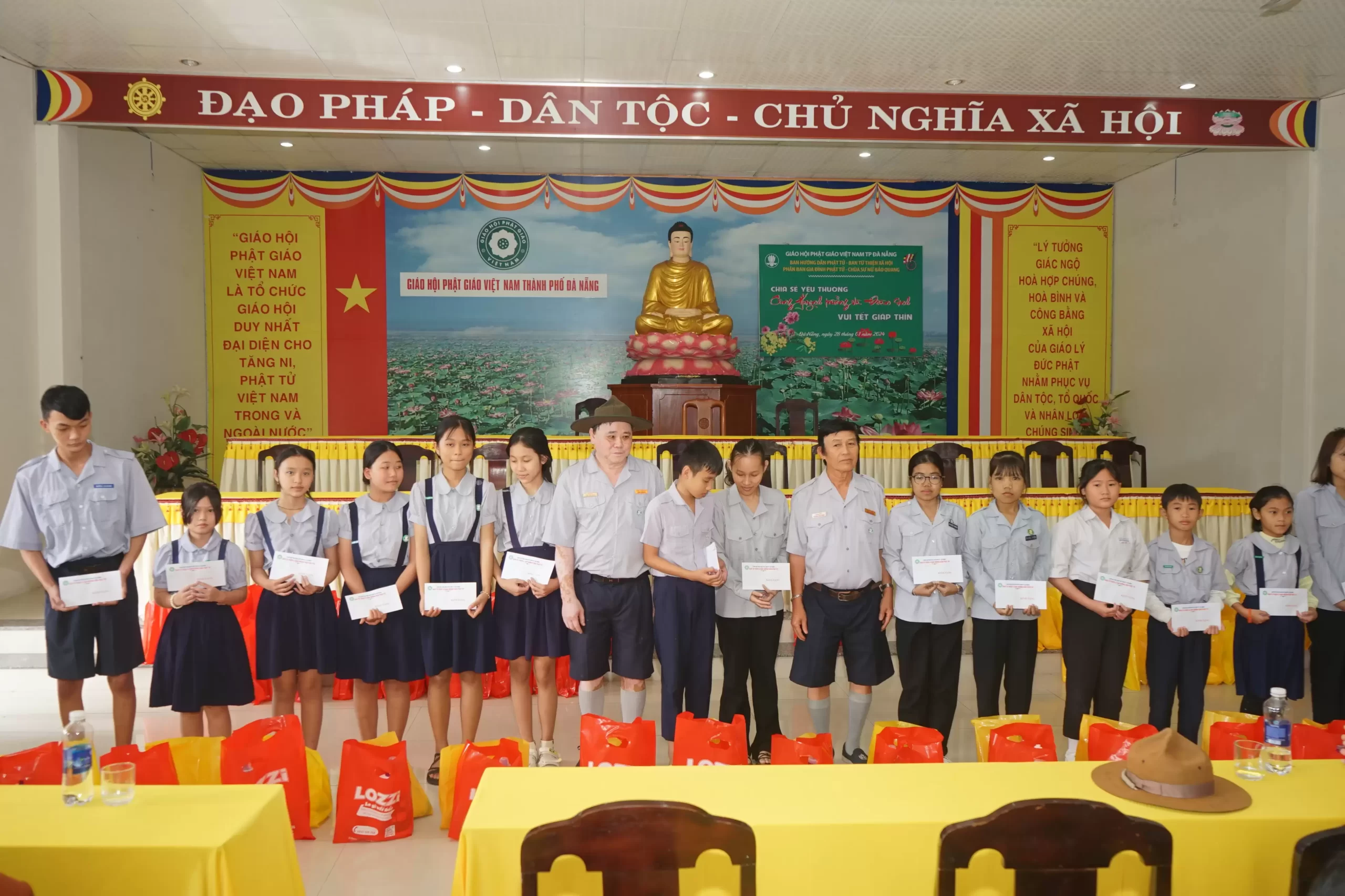 Nhân dịp tết Nguyên đán Giáp Thìn 2024, nhằm chia sẻ và động viên các đoàn sinh Gia đình Phật tử đang sinh hoạt tại các đơn vị trên địa bàn thành phố có hoàn cảnh khó khăn, sáng ngày 28 tháng 01 năm 2024, tại hội trường Ban Trị sự GHPGVN Tp Đà Nẵng (chùa Pháp Lâm – 574 Ông Ích Khiêm, phường Nam Dương, quận Hải Châu, Tp Đà Nẵng), Ban Hướng dẫn Phân ban Gia đình Phật tử Đà Nẵng đã tổ chức trao tặng quà tết cho các em.