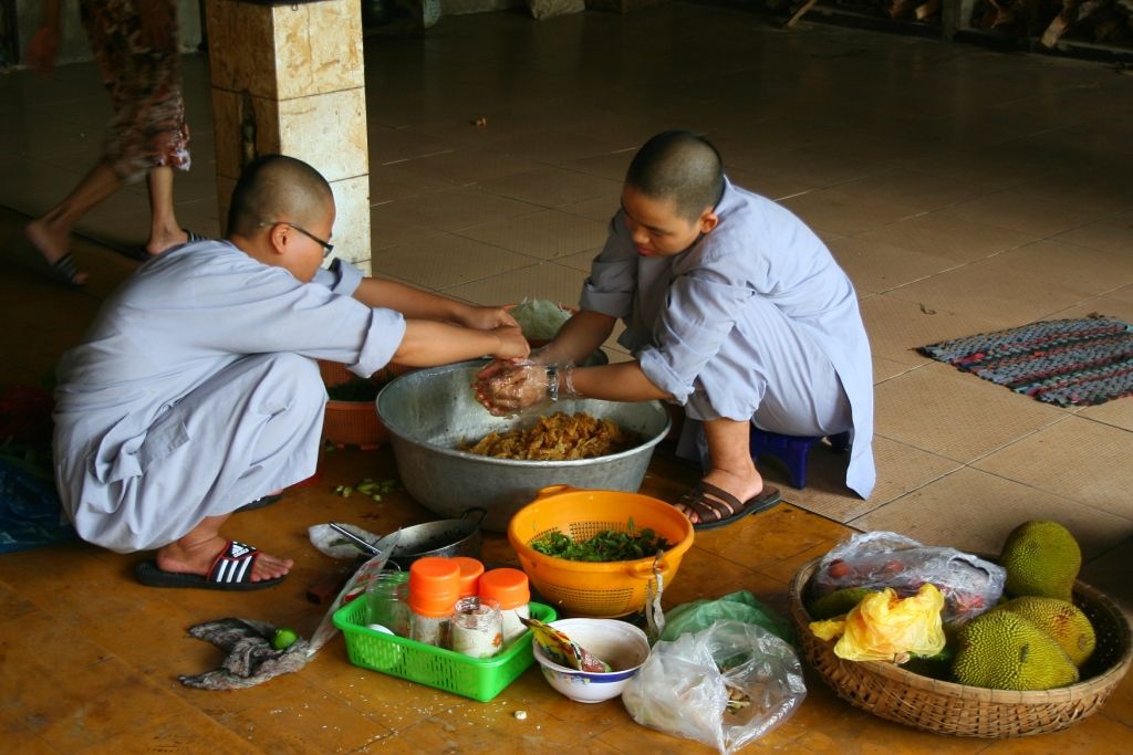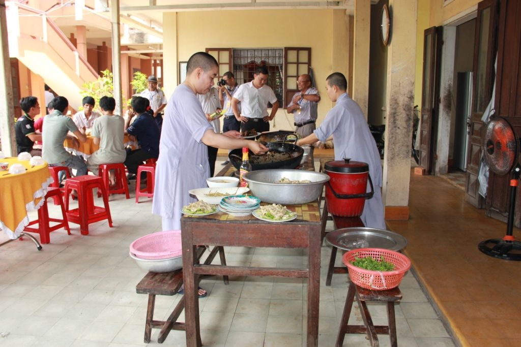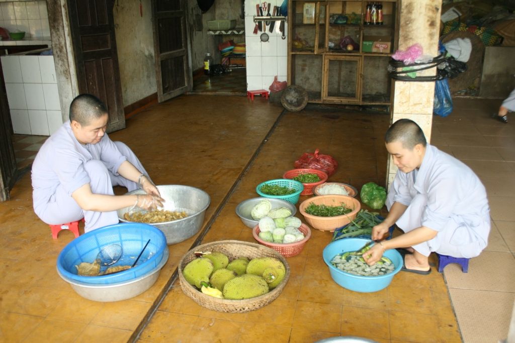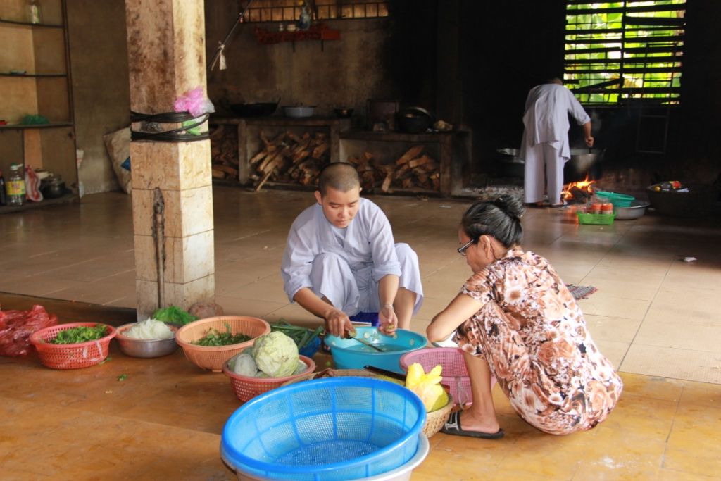 Các sư cô và đạo hữu chùa Mỹ Khê chuẩn bị bữa ăn cho thí sinh đang lưu trú tại chùa