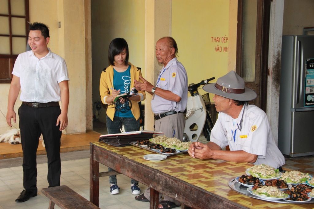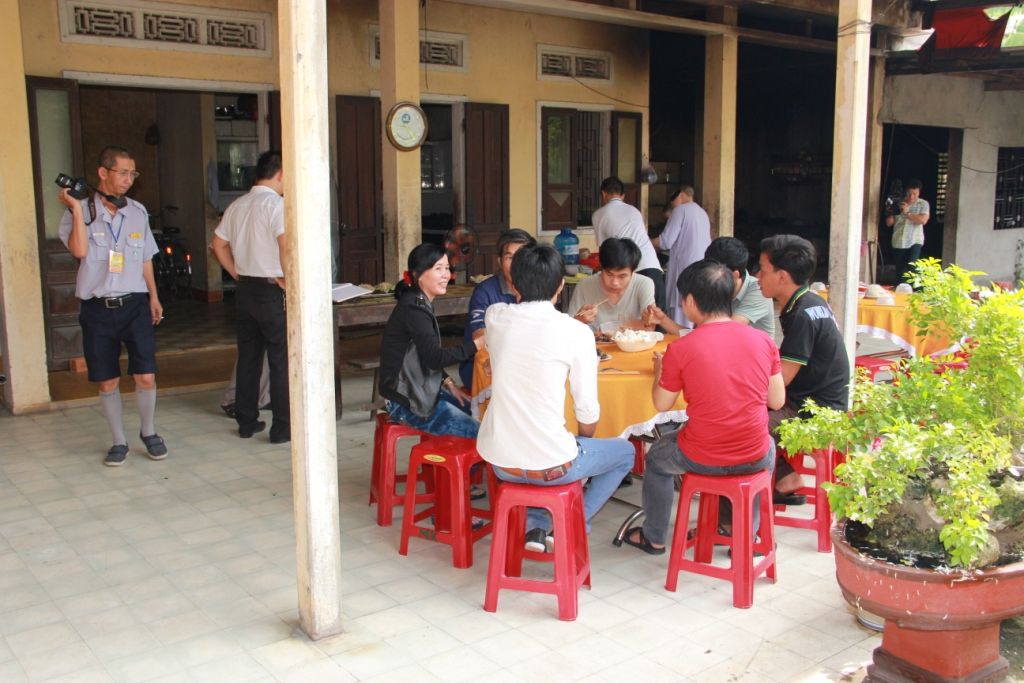 Các thí sinh và người nhà dùng điểm tâm tại chùa Mỹ Khê