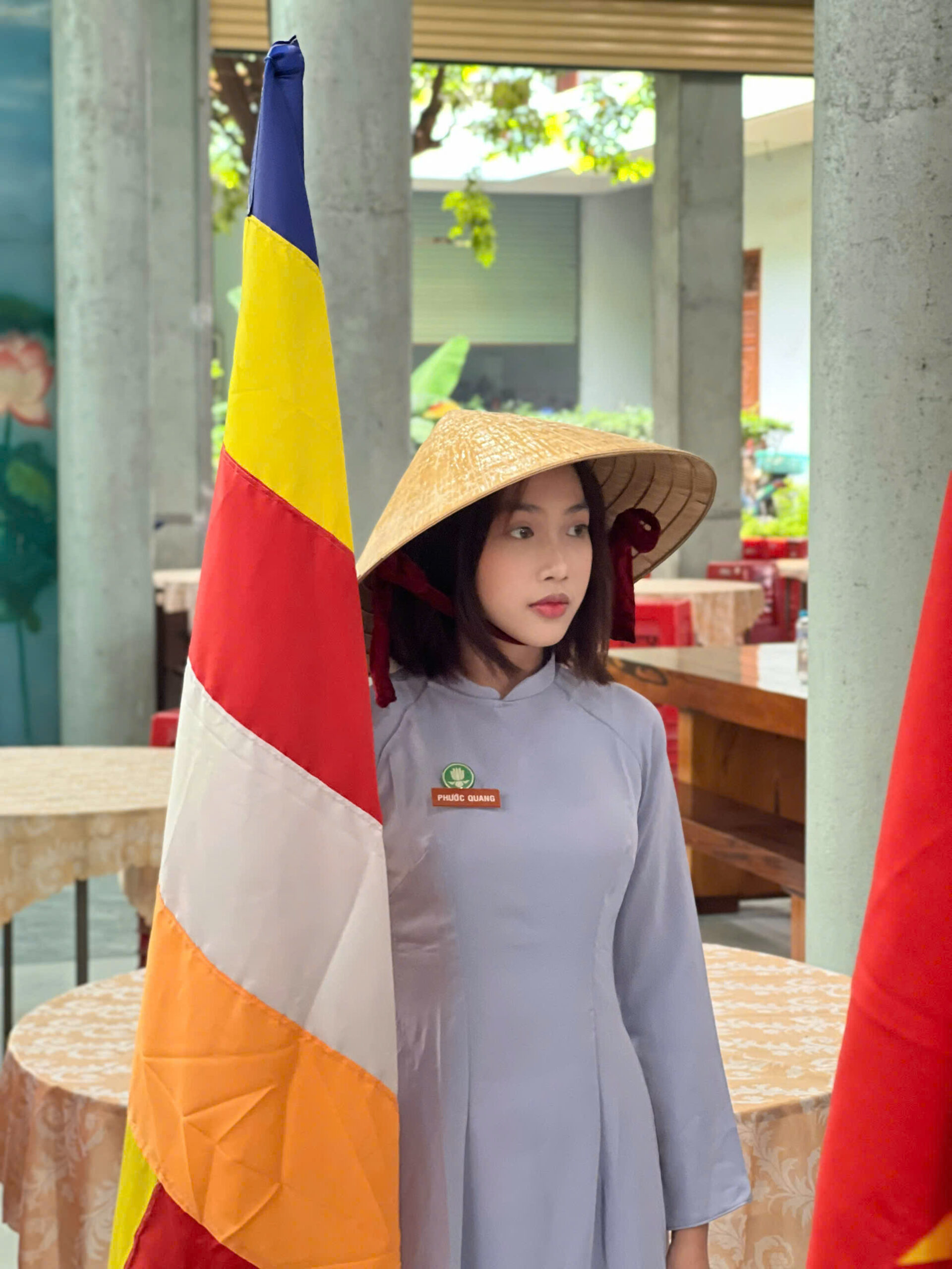 Đoàn sinh Thanh nữ đơn vị Gia đình Phật tử Phước Quang trang nghiêm trước Đạo kỳ chuẩn bị hành lễ.