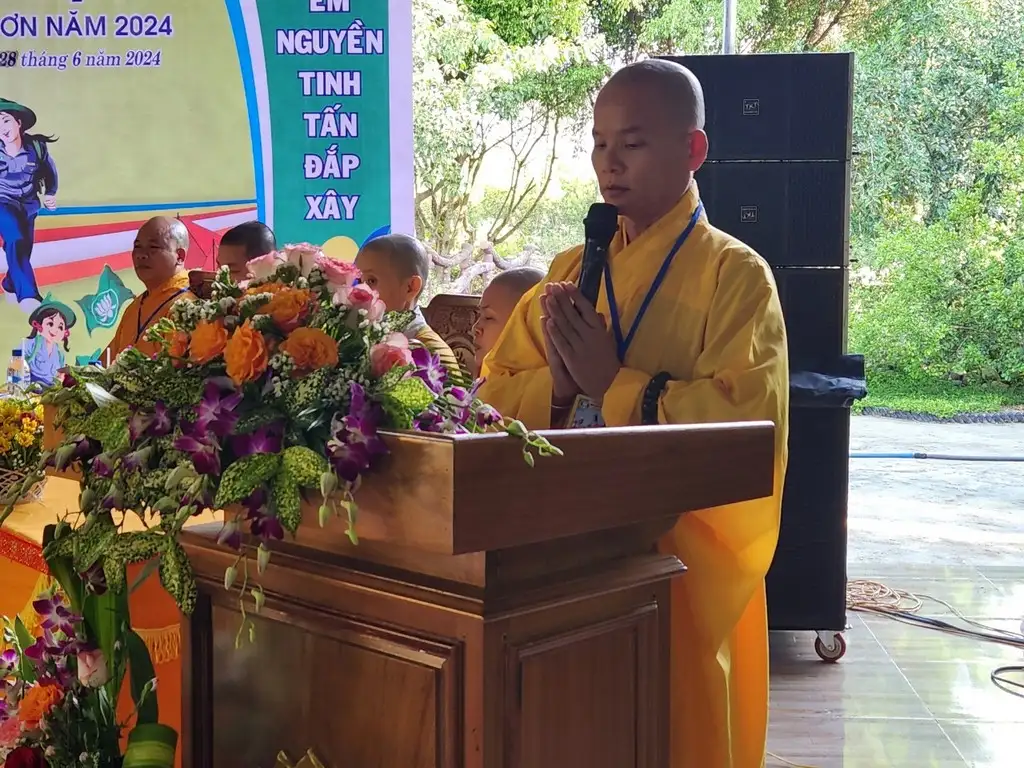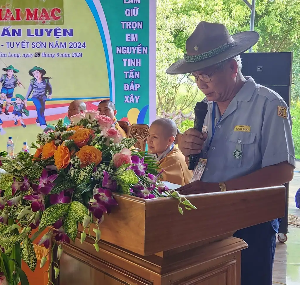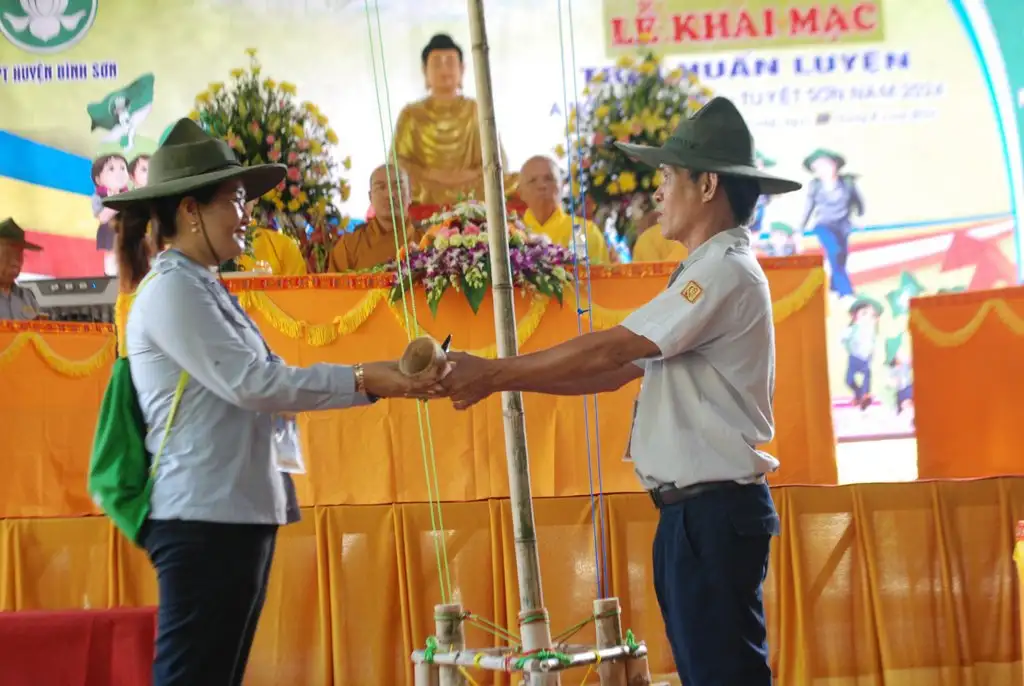 Lễ khai mạc trại long trọng diễn ra vào lúc 15 giờ 00, ngày 28/6/2024. Về tham dự và chứng minh buổi lễ có Hòa thượng Thích Viên Đạo – Ủy viên ban Thường trực BTS GHPGVN tỉnh Quảng Ngãi, Chứng minh BTS GHPGVN huyện Bình Sơn; THượng tọa Thích Hạnh Pháp – Phó Trụ trì chùa Minh Đức; Đại đức Thích Hạnh Từ – Phó Trưởng ban BTS, Chánh Thư ký BTS GHPGVN huyện Bình Sơn, Trụ trì chùa Kim Long; Đại đức Thích Đồng Phú – UV BHDPT tỉnh Quảng Ngãi, Trưởng BHD Phật tử huyện Bình Sơn cùng các Chư Tăng, Ni Cố vấn Giáo hạnh GĐPT đang trú xứ các chùa trong huyện. Các anh chị cựu Huynh trưởng Đoàn sinh, các Ban hộ tự và các vị ân nhân hiện diện tại buổi lễ.