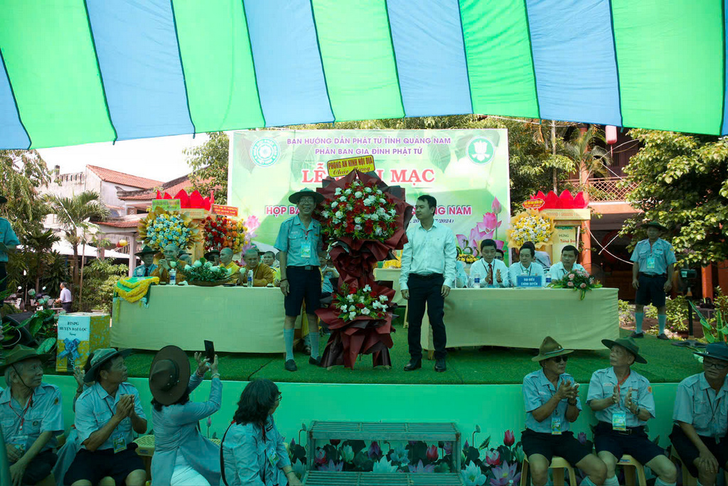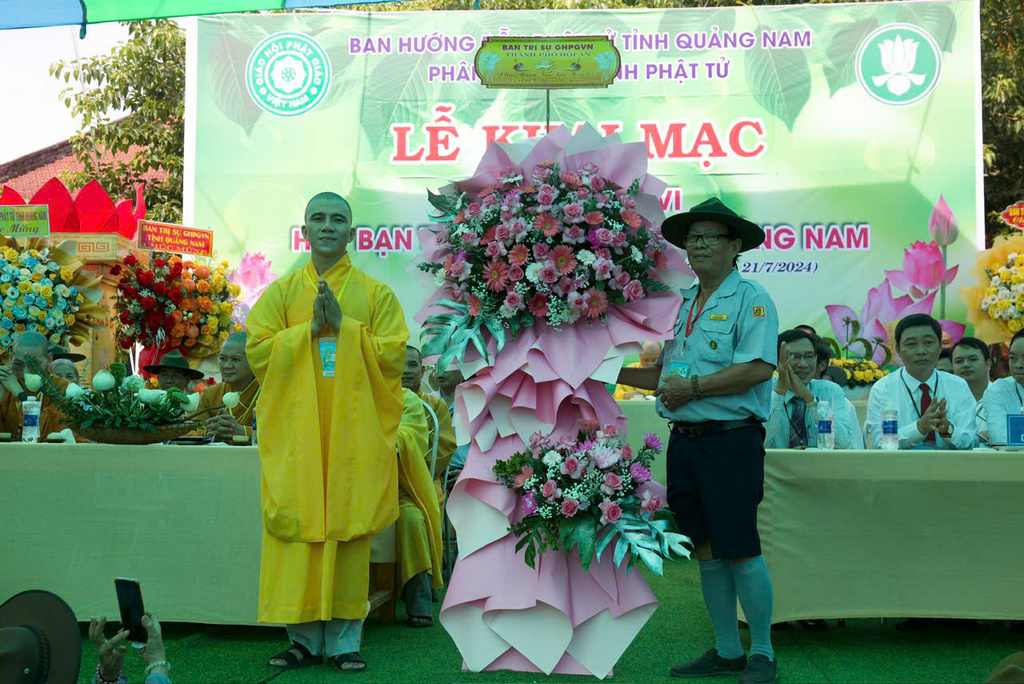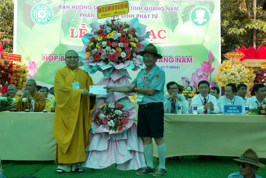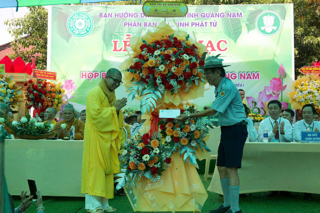 Buổi lễ vinh dự đón nhận những lẵng hoa tươi thắm, những phần quà gửi đến chúc mừng hội trại từ BTS GHPGVN tỉnh Quảng Nam, Ban Hướng dẫn Phật tử tỉnh, Ban Trị sự và Ban hướng dẫn Phật tử các huyện thị thành phố trên toàn tỉnh và chính quyền địa phương tỉnh Quảng Nam và huyện Duy Xuyên.