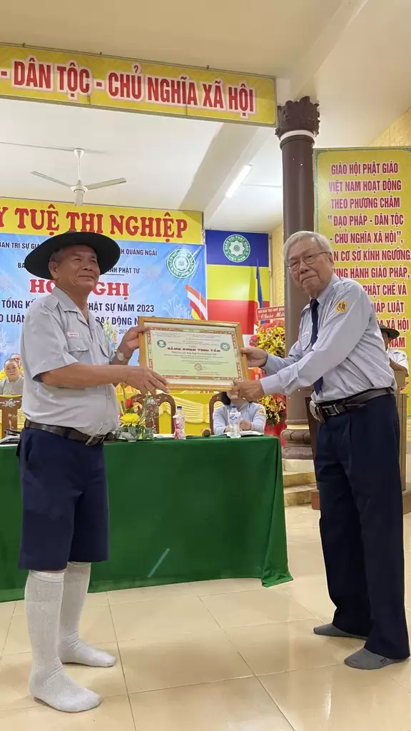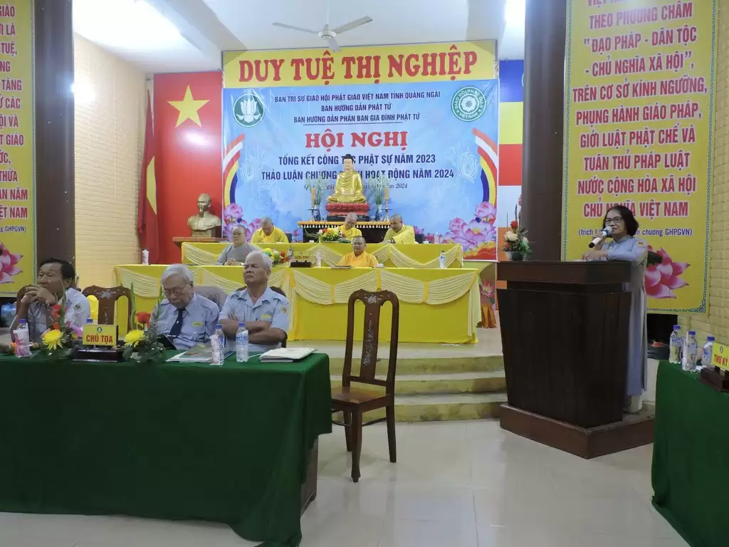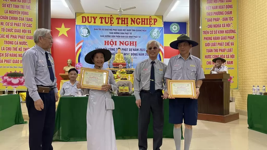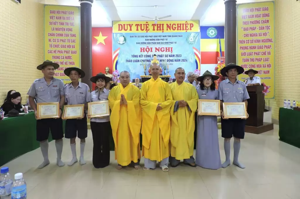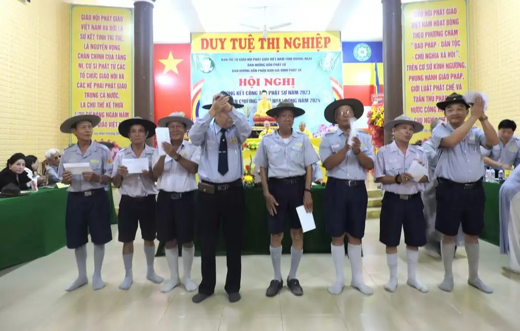 Hội nghị đã tặng Bằng khen Tinh tấn cho 5 đơn vị đạt danh hiệu GĐPT xuất sắc cấp tỉnh năm 2023: GĐPT Quang Hiển – huyện Mộ Đức; GĐPT Tịnh Nghiêm – TP Quảng Ngãi; GĐPT Minh Phước – huyện Sơn Tịnh; GĐPT Chơn Thiện và GĐPT Hải Quang – huyện Bình Sơn, và Htr cấp Tập Tâm Ngọc Hồ Thị Tuyết Nhung – Liên Đoàn phó GĐPT Quang Hiển, huyện Mộ Đức; Htr cấp Tín Tâm Nguyên Hồ Thị NHung – Liên Đoàn trưởng GĐPT Bảo Sơn, huyện Bình Sơn đã có nhiều thành tích xây dựng và phát triển đơn vị cơ sở.