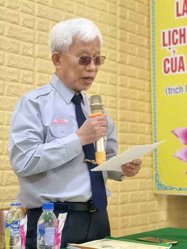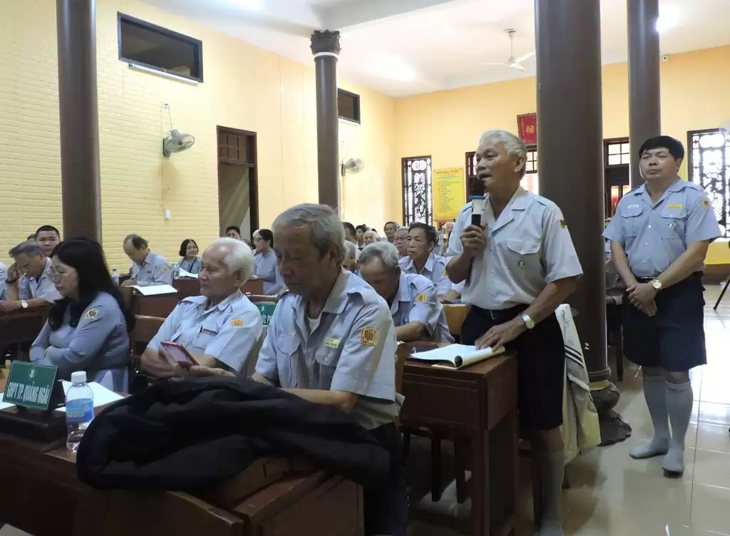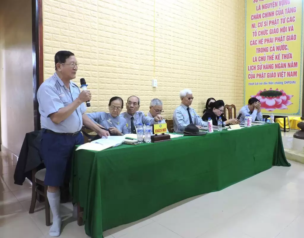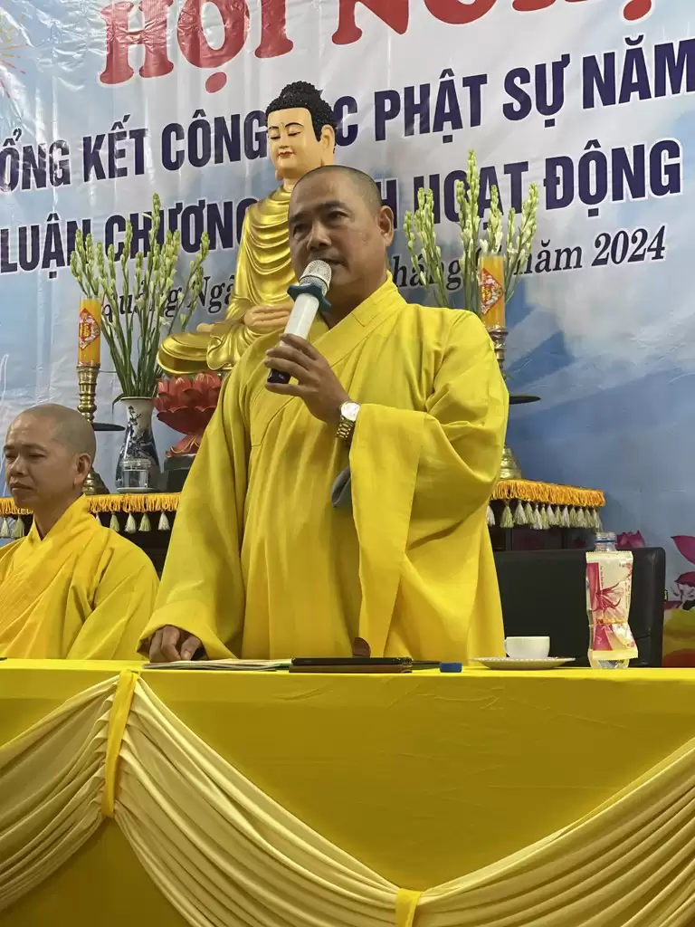 Htr Như Xuân Chế Văn Tân – Chánh thư ký trình bày bảng báo cáo tổng kết, điểm lại những thành tựu nổi bật gặt hái được sau một năm nổ lực thực hiện như: Các khóa tu dành cho Huynh trưởng Đoàn sinh GĐPT; duy trì công tác công tác tu học huấn luyện; trại họp bạn GĐPT cấp huyện; tăng cường đẩy mạnh xây dựng đơn vị cơ sở vững mạnh; các hoạt động chào mừng các ngày lễ kỷ niệm truyền thống GĐPT; các hoạt động theo sự chỉ đạo của các cấp Giáo hội; các hoạt động cúng dường các ngày lễ vía, Tết Nguyên đán, cúng dường đại lễ Phật đản Vu lan Phật lịch 2567; các hoạt động xã hội bảo vệ môi trường sinh thái, công tác khuyến học, bếp ăn từ thiện dành cho bệnh nhân nghèo v.v…Bên cạch đó báo cáo cũng đã thẳng thắn nhìn nhận những hạn chế, yếu kém tồn đọng cần phải khắc phục trong thời gian đến.
