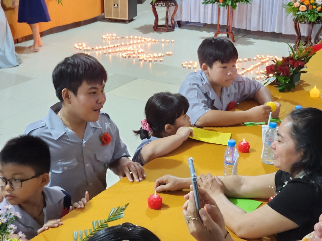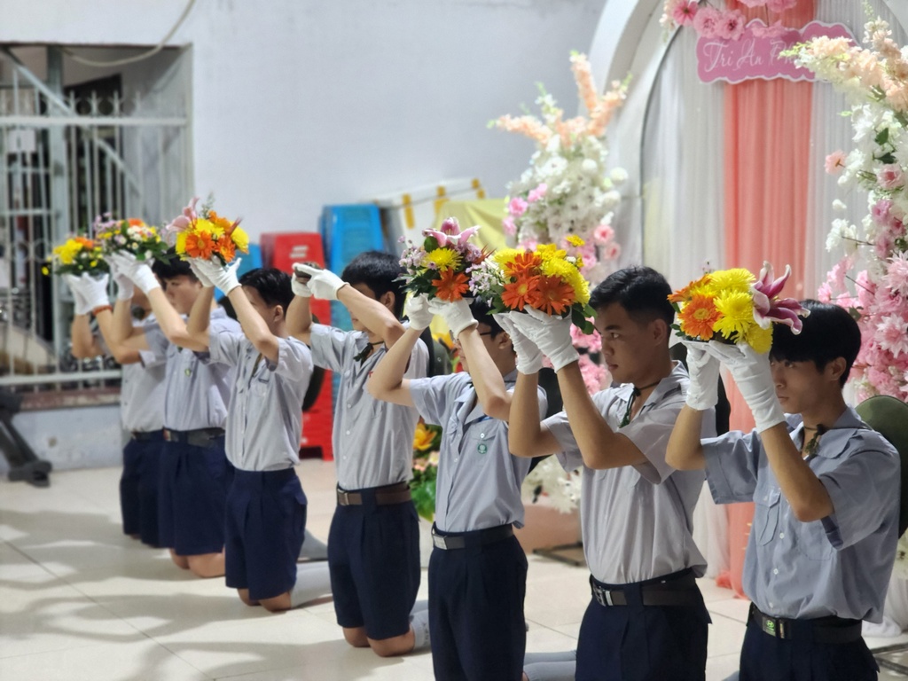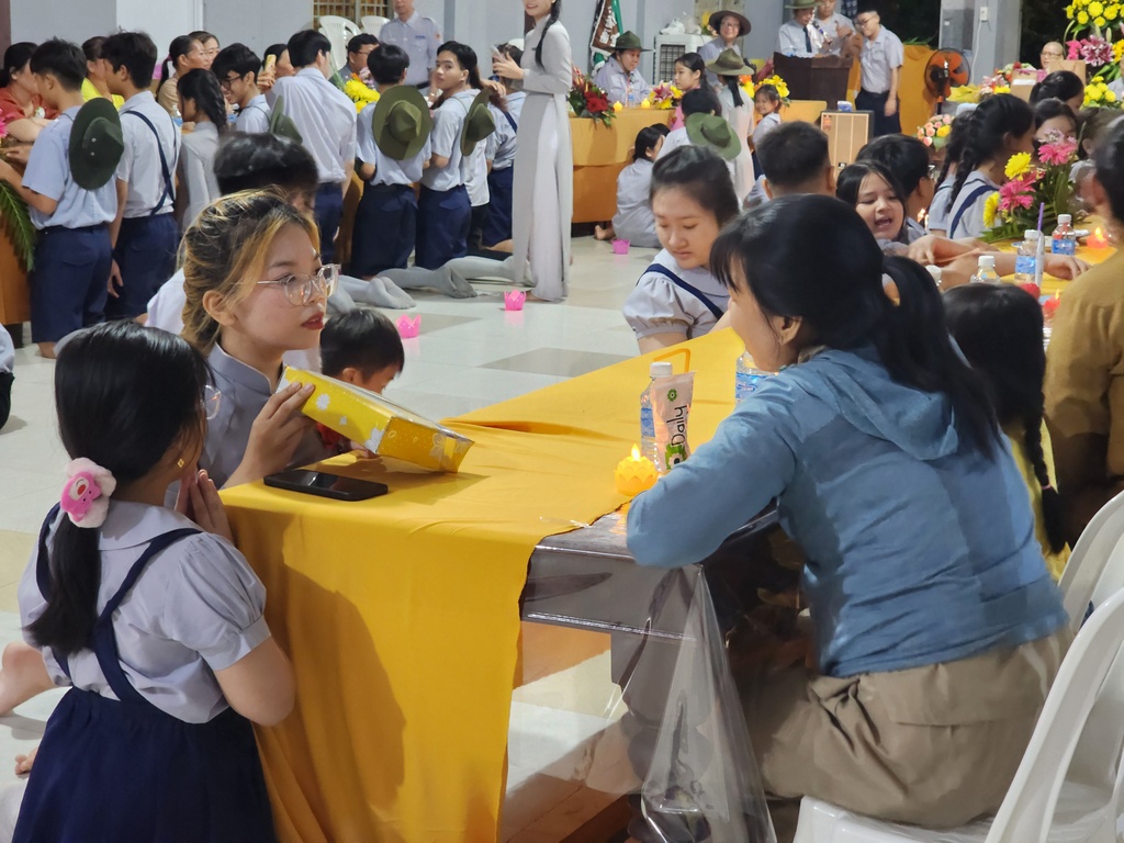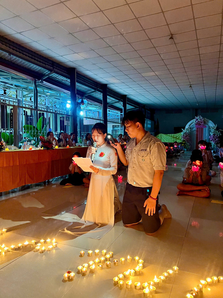 Chương trình thắp nến tri ân, hai em đoàn sinh thiếu nữ Phạm Thế Trân và Trương Thanh Thảo đã bồi hồi xúc động diễn đọc lời cảm niệm của mình dâng lên hai đấng sinh thành dưỡng dục, thể hiện lòng biết ơn và lòng hiếu thảo của mình. Trong ánh nến lung linh huyền ảo…, các em Đoàn sinh đồng loạt kính cẩn quỳ gối trước mặt ba mẹ của mình để trao lời yêu thương và tặng hoa, quà cho những người thân yêu nhất của mình.