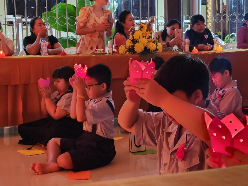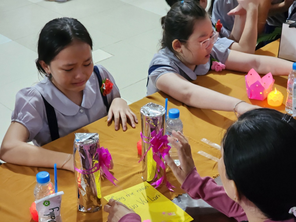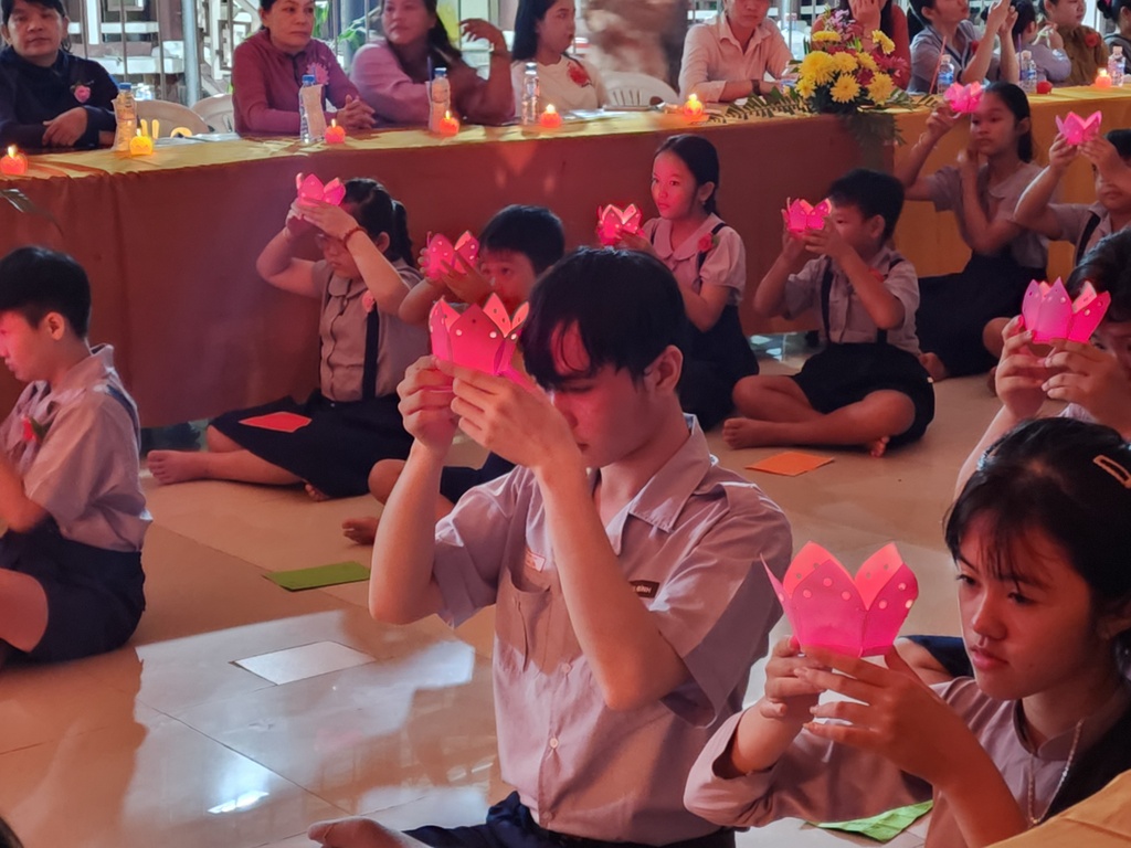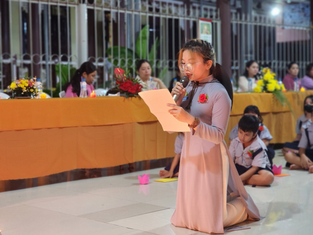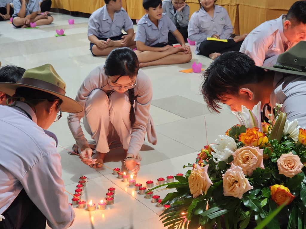 Chương trình thắp nến tri ân, hai em đoàn sinh thiếu nữ Phạm Thế Trân và Trương Thanh Thảo đã bồi hồi xúc động diễn đọc lời cảm niệm của mình dâng lên hai đấng sinh thành dưỡng dục, thể hiện lòng biết ơn và lòng hiếu thảo của mình. Trong ánh nến lung linh huyền ảo…, các em Đoàn sinh đồng loạt kính cẩn quỳ gối trước mặt ba mẹ của mình để trao lời yêu thương và tặng hoa, quà cho những người thân yêu nhất của mình.