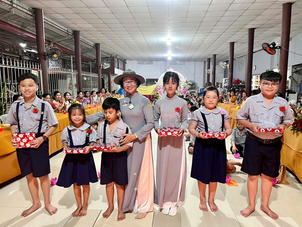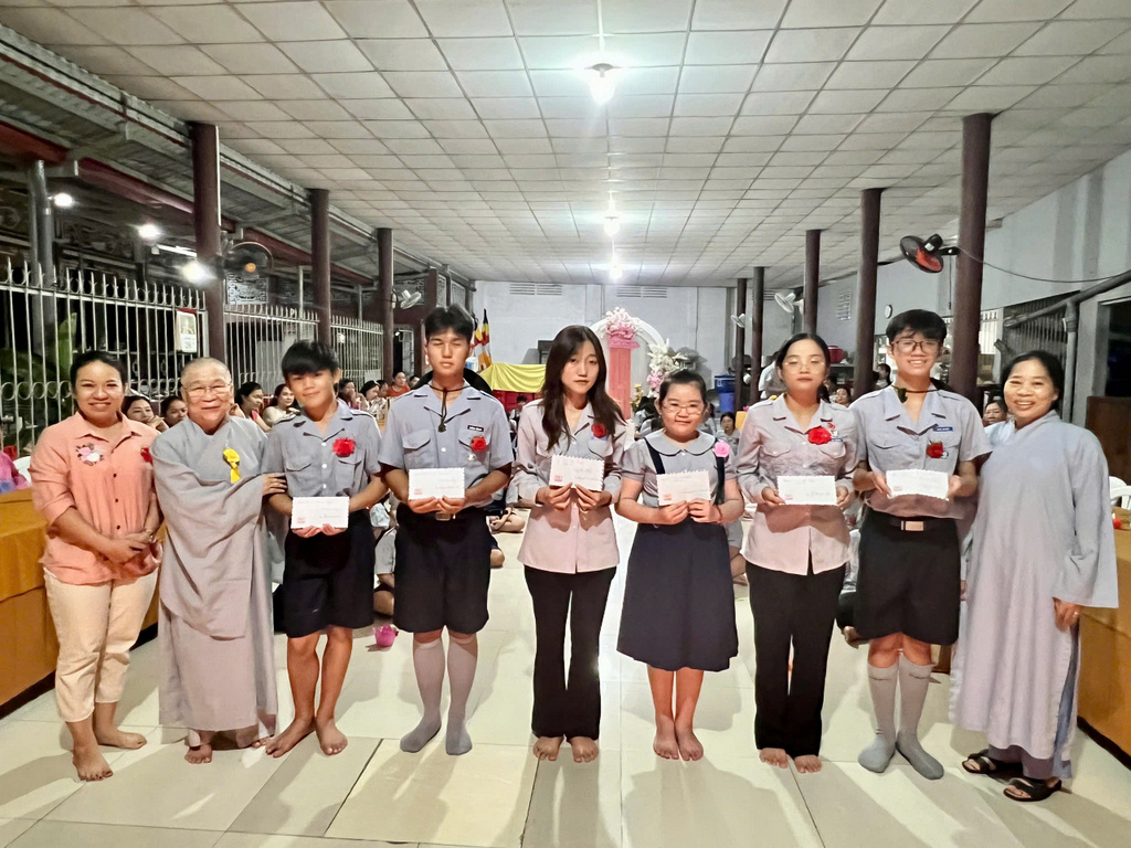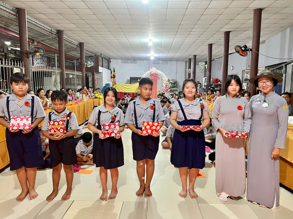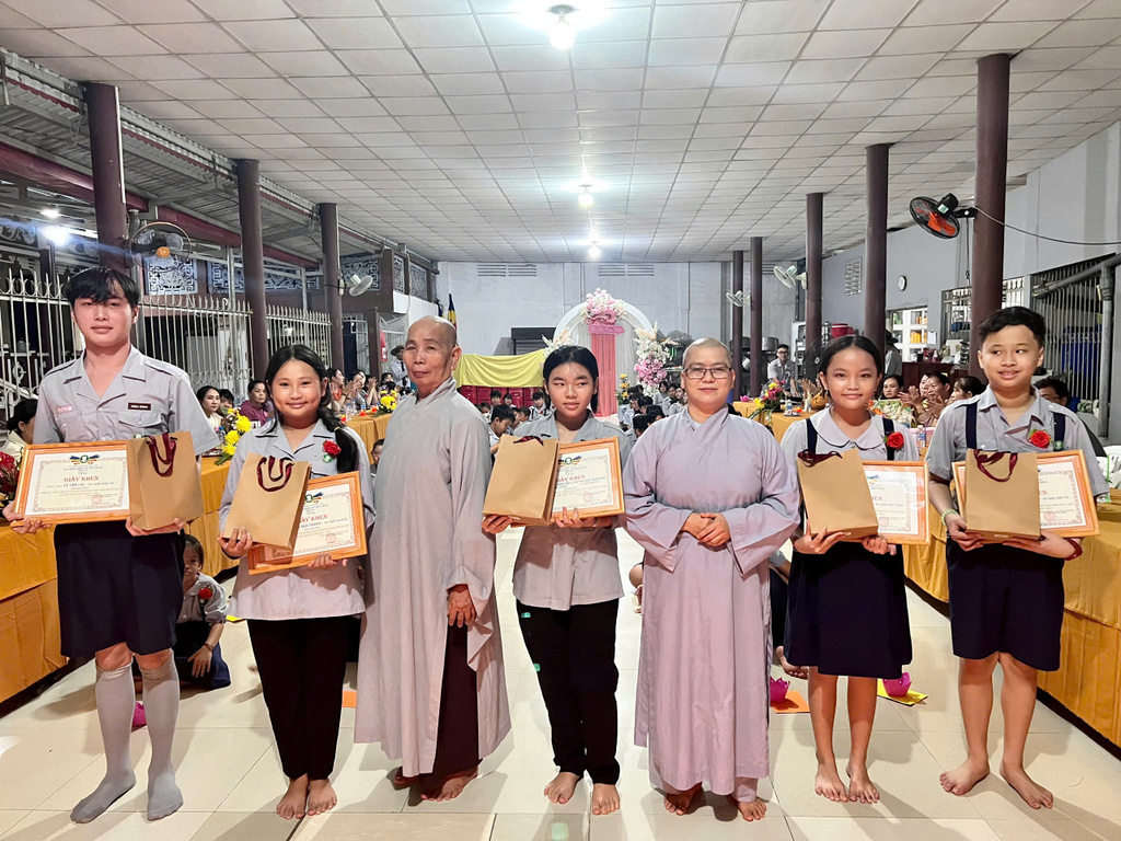 Kết thúc phần lễ, Ban Huynh trưởng GĐPT Hòa Bình cũng đã tặng thưởng cho 21 Đoàn sinh tu học sinh hoạt chuyên cần, đạt danh hiệu Học Sinh Xuất Sắc và Học Sinh Giỏi trong học tâp ở nhà trường năm học 2023 – 2024. 7 Đoàn sinh đã được nhận quà thưởng trong cuộc thi : ”Phật về bên con”, đã lập vườn Lâm Tì Ni (mô hình thu nhỏ) đẹp nhất trong mùa Phật Đản vừa qua, đồng thời trao học bổng cho 6 Đoàn sinh nghèo hiếu học, hoàn cảnh gia đình khó khăn. Mỗi học bổng trị giá 1 triệu đồng (tổng cộng 6 triệu đồng) do 2 vị trong ban Bảo Trợ: là Phật tử Nhật Diệu và Chị Phan Thị Phương Thảo trao tặng.