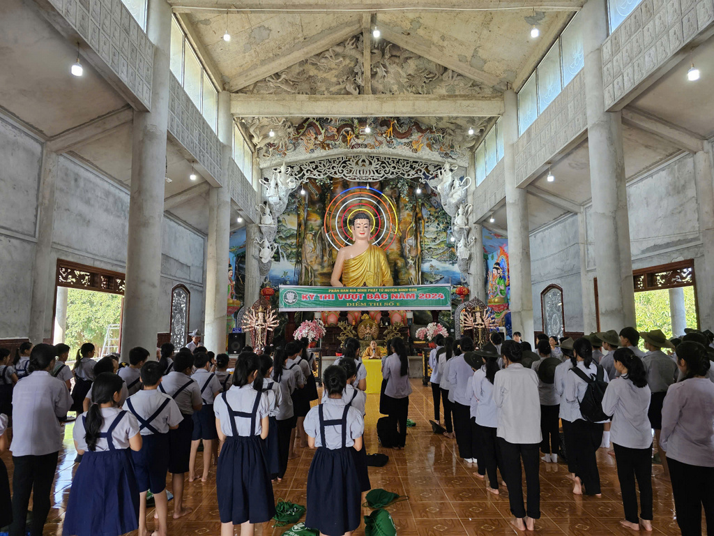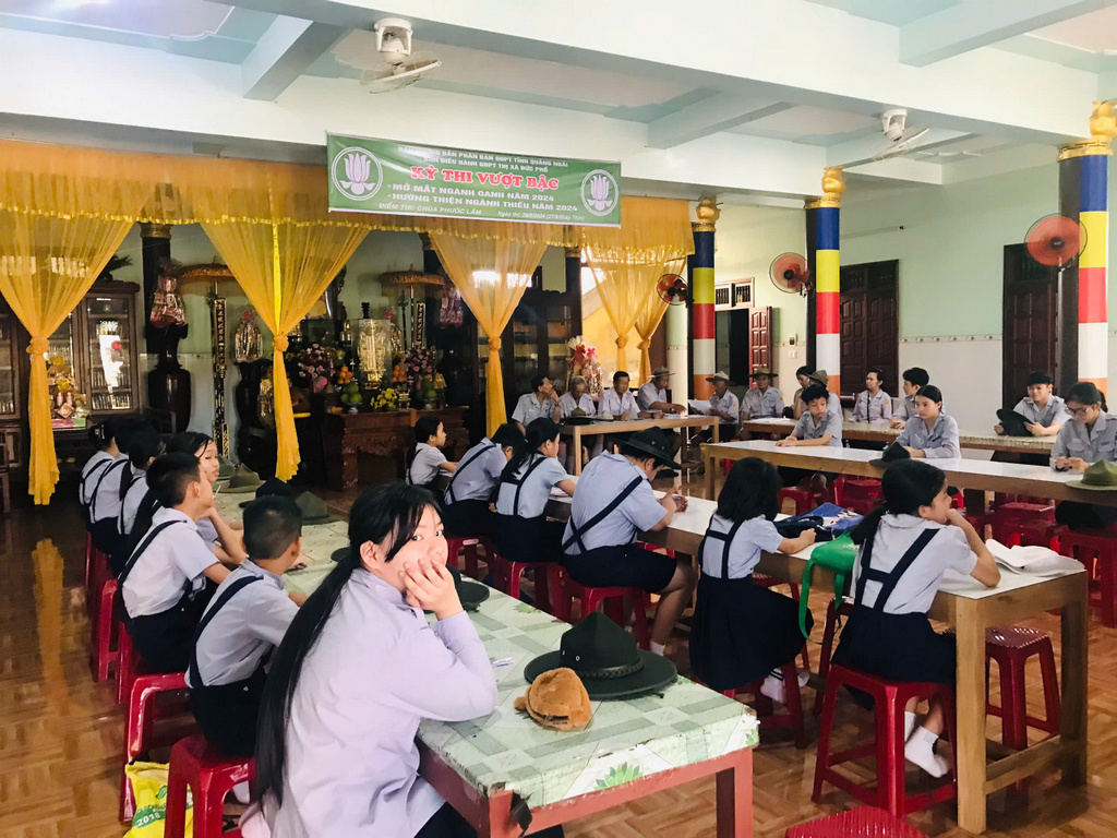 Kỳ thi vượt bậc năm nay diễn ra tại 8 địa điểm: Chùa Huyền Trang – GĐPT Lam Thiên Ấn (TP HCM), Chùa Phước Lâm (thị xã Đức Phổ), Chùa Bảo Quang (huyện Mộ Đức), Chùa Hưng Long (huyện Nghĩa Hành), Chùa Pháp Hóa (TP Quảng Ngãi), Chùa Châu Quang (huyện Sơn Tịnh), chùa Kim Long – Tây Bình Sơn, Chùa Phước Thiện – Đông Bình Sơn (huyện Bình Sơn) Tham gia kỳ thi có hơn 600 đoàn sinh các bậc học Hướng Thiện, Sơ Thiện, Trung Thiện, Chánh Thiện (ngành Thiếu), bậc Hòa (ngành Thanh), Mở mắt, Cánh mềm, Chân cứng, Tung bay (ngành Oanh) đến từ một số đơn vị GĐPT trong toàn tỉnh.