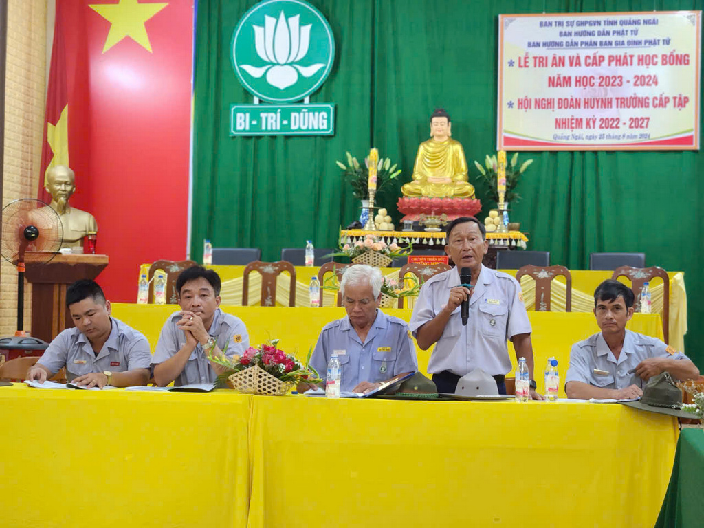 Đạo từ, của Hòa thượng Thích Thông Hội – UV HĐTS TW GHPGVN, Trưởng ban BTS GHPGVN tỉnh Quảng Ngãi , huấn từ của Đại đức Thích Đồng Quang – Phó Trương ban Thường trực BHDPT tỉnh, diễn từ của Htr cấp Dũng Tâm Giới và của vị đại diện Ban Bảo trợ đã có những lời chia sẻ đầy tâm huyết về tầm quan trọng của giáo dục GĐPT trong việc góp phần xây dựng một xã hội học tập tốt đẹp và nuôi dưỡng những mầm non tương lai. Quý Ngài cũng đã tán dương việc làm hết sức có ý nghĩa thiết thực của GĐPT tỉnh, đồng thời quý Ngài hứa khả sẽ đồng hành, trợ duyên giúp đỡ cùng GĐPT tỉnh nhà trong mọi công tác tu học sinh hoạt, hoạt động xã hội trong thời gian đến đồng thời bày tỏ niềm vui, niềm hạnh phúc khi được chung tay góp sức nhỏ bé trong việc nâng đỡ các em Đoàn sinh nghèo vượt khó, vươn lên trong học tập.