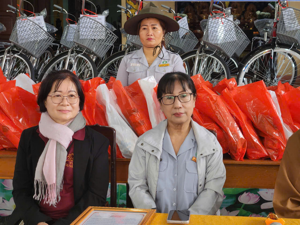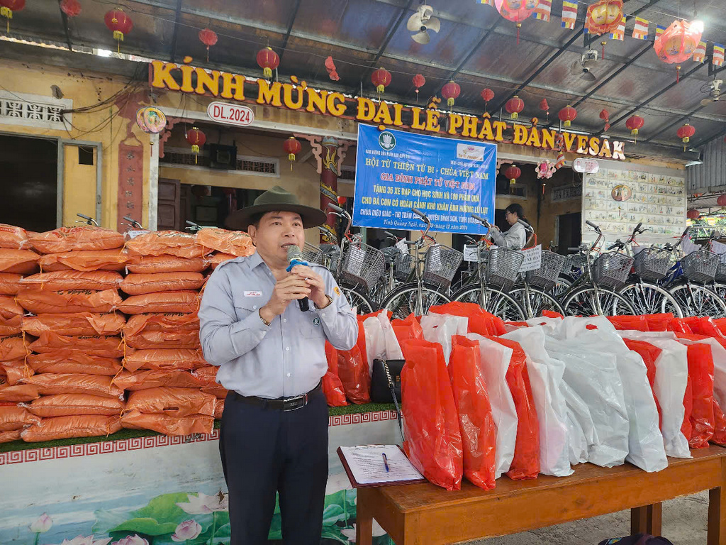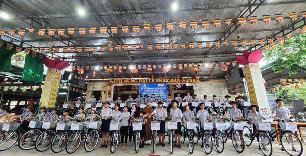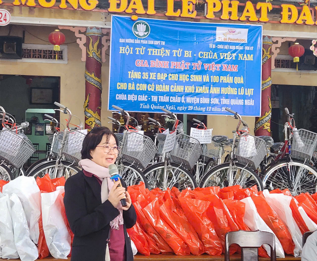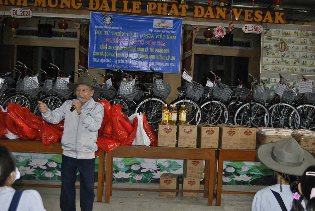 Nhờ sự trợ duyên, hỗ trợ giúp đỡ từ Hội Từ Bi chùa Việt Nam Houston TX Hoa Kỳ và Gia đình Phật tử Việt Nam tại Hoa Kỳ, sáng ngày 29/12/2024, tại Tổ đình Sắc Tứ Diệu Giác và thôn Trường Giang, xã Trà Tân, huyện Trà Bồng, tỉnh Quảng Ngãi, Gia đình Phật tử tỉnh Quảng Ngãi phối hợp với Tiểu ban Từ thiện Xã hội Ban Hướng dẫn Phân ban GĐPT TW đã tổ chức chương trình trao tặng xe đạp và quà cho học sinh và người dân có hoàn cảnh khó khăn.
