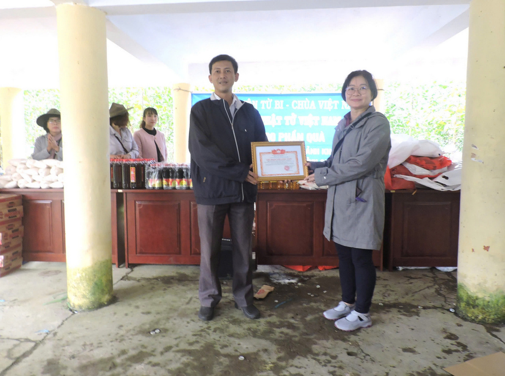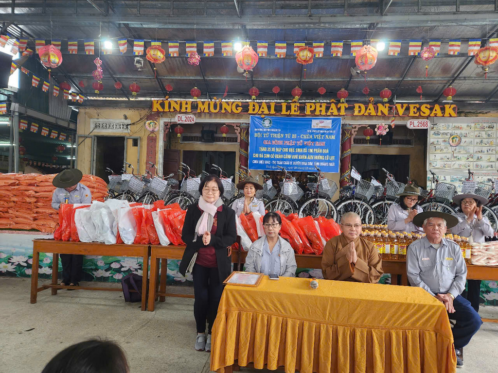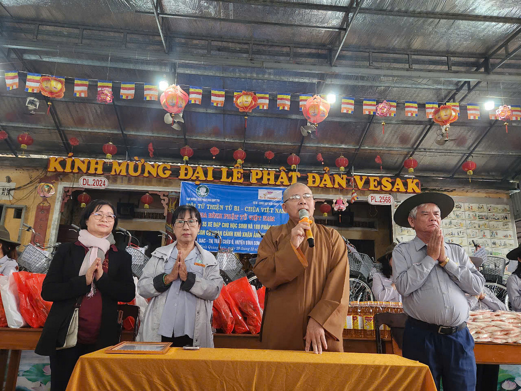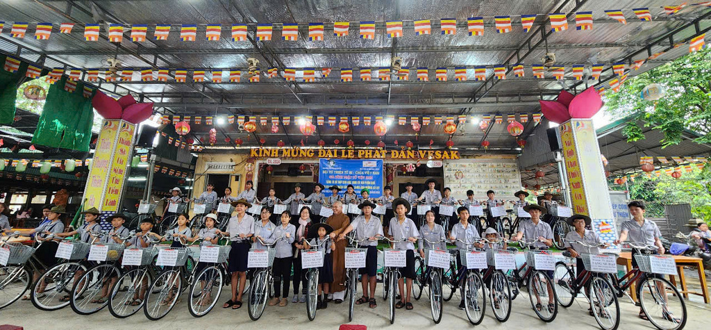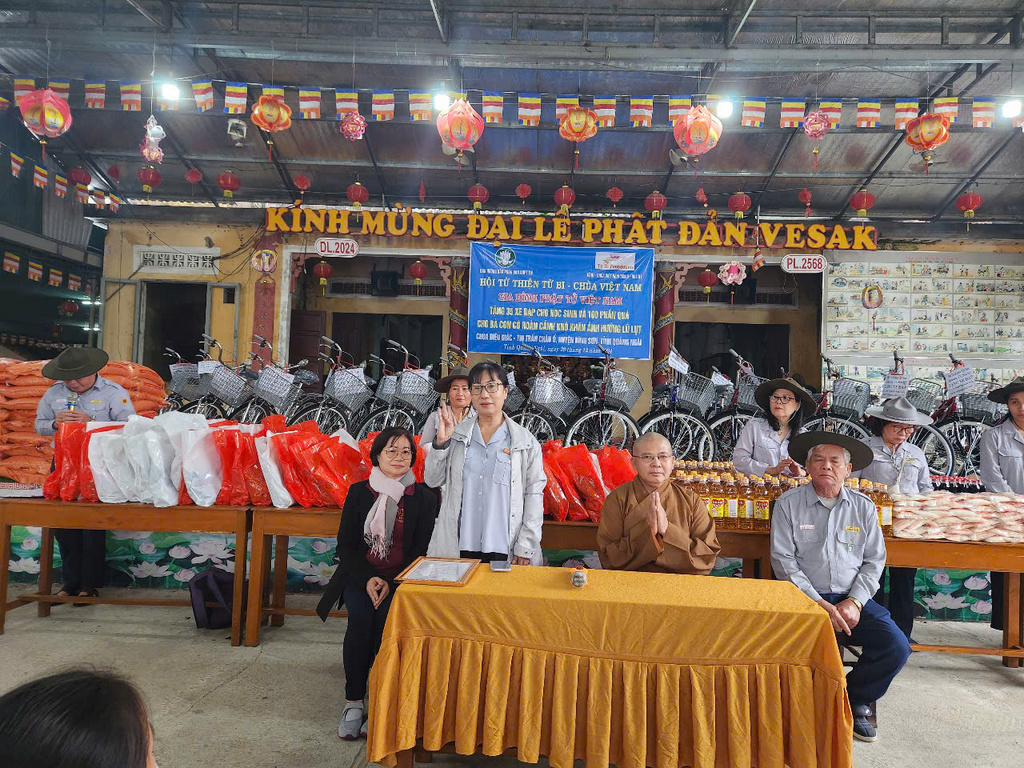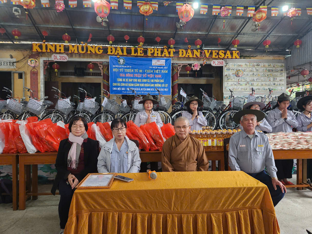Nhờ sự trợ duyên, hỗ trợ giúp đỡ từ Hội Từ Bi chùa Việt Nam Houston TX Hoa Kỳ và Gia đình Phật tử Việt Nam tại Hoa Kỳ, sáng ngày 29/12/2024, tại Tổ đình Sắc Tứ Diệu Giác và thôn Trường Giang, xã Trà Tân, huyện Trà Bồng, tỉnh Quảng Ngãi, Gia đình Phật tử tỉnh Quảng Ngãi phối hợp với Tiểu ban Từ thiện Xã hội Ban Hướng dẫn Phân ban GĐPT TW đã tổ chức chương trình trao tặng xe đạp và quà cho học sinh và người dân có hoàn cảnh khó khăn.