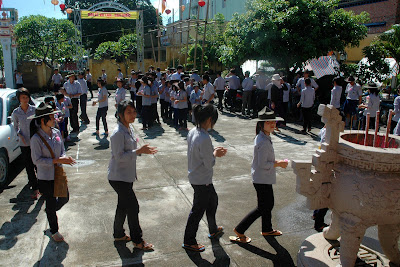 Điều làm chúng tôi bất ngờ nhất là khi 2 chiếc xe đưa đoàn chúng tôi vừa dừng lại, thì tất cả quý anh chị cùng đoàn sinh GĐPT Huệ Hương chạy ra cổng để chào đón chúng tôi, với không khí vui tươi niềm nở.