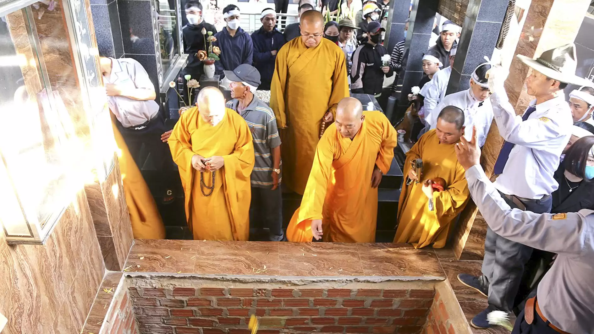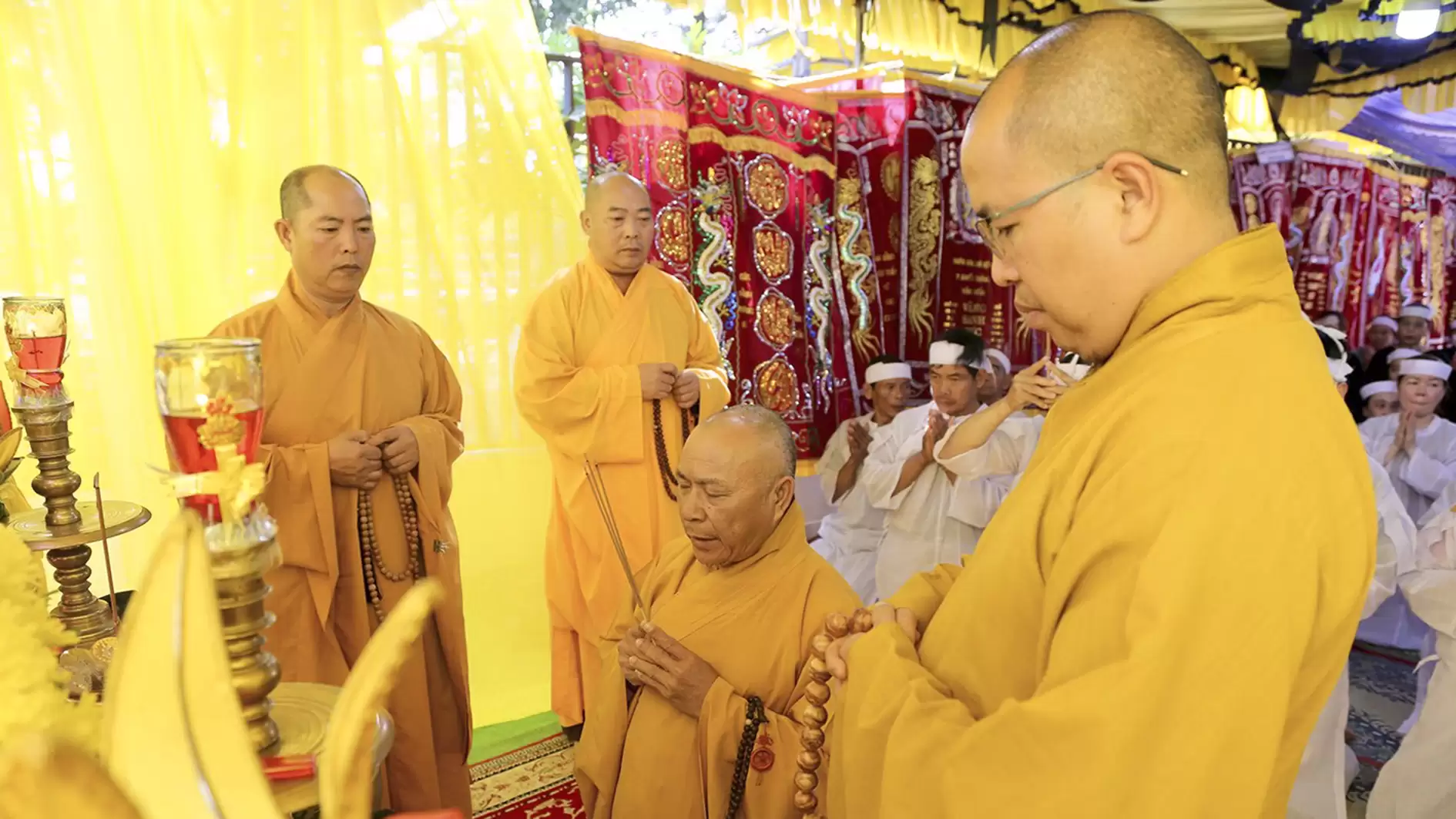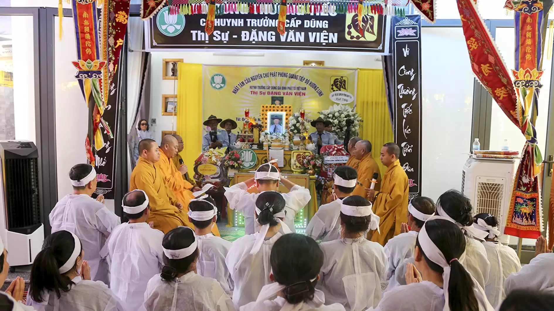 Đúng 15h30, trong giờ phút thiêng liêng chư Tôn đức Giáo phẩm cung tiến giác Linh để niêm hương tưởng niệm. Đại đức Thích Nhuận Thông cùng Ban Nghi lễ thực hiện các pháp sự di quan cố huynh trưởng Thị Sự – Đặng Văn Viên, tang gia hiếu quyến cung thỉnh bát hương, linh vị, di ảnh của cố huynh trưởng cấp Dũng từ từ rời linh đường, cùng cung thỉnh linh cữu rời ngôi nhà nơi cố huynh trưởng gắn bó những năm tháng cùng gia đình. Lễ khiển điện, di quan diễn ra trong không khí trang nghiêm đầm ấm.
