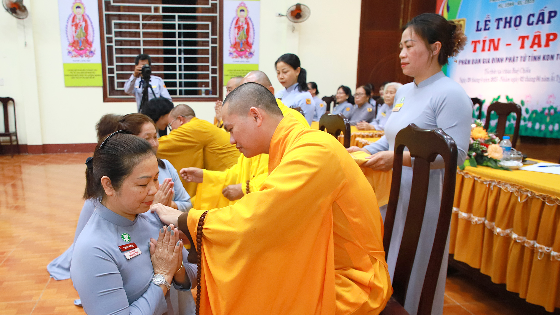 Trong thời khắc thiêng liêng toàn thể Huynh trưởng trang nghiêm thanh tịnh lắng lòng đón nhận lời đạo từ của ĐĐ. Thích Nhuận Pháp thay mặt Chư Tôn Thiền Đức chứng minh, ban lời đạo từ sâu sắc. Đại đức sách tấn: “Huynh trưởng GĐPT là người hộ trì Tam Bảo bằng đời sống phạm hạnh và còn là tấm gương sống động của Giới – Định – Tuệ trong sinh hoạt GĐPT và tinh thần phụng sự. Thọ cấp không chỉ là vinh dự, mà là khởi đầu cho một hành trình dài, cần lấy Chánh Pháp làm kim chỉ nam, sống giản dị, khiêm cung và kiên định lý tưởng. Mong rằng quý Huynh trưởng luôn tinh tấn, phát huy đạo tâm để phục vụ tổ chức và đạo pháp trong giai đoạn mới. Đồng thời, Lễ thọ cấp Tín – cấp Tập hôm nay không chỉ là sự kiện ghi dấu sự trưởng thành của hàng Huynh trưởng tỉnh nhà, mà còn là biểu hiện cho sức sống bền bỉ của tổ chức Gia Đình Phật Tử trong lòng Giáo hội”.
