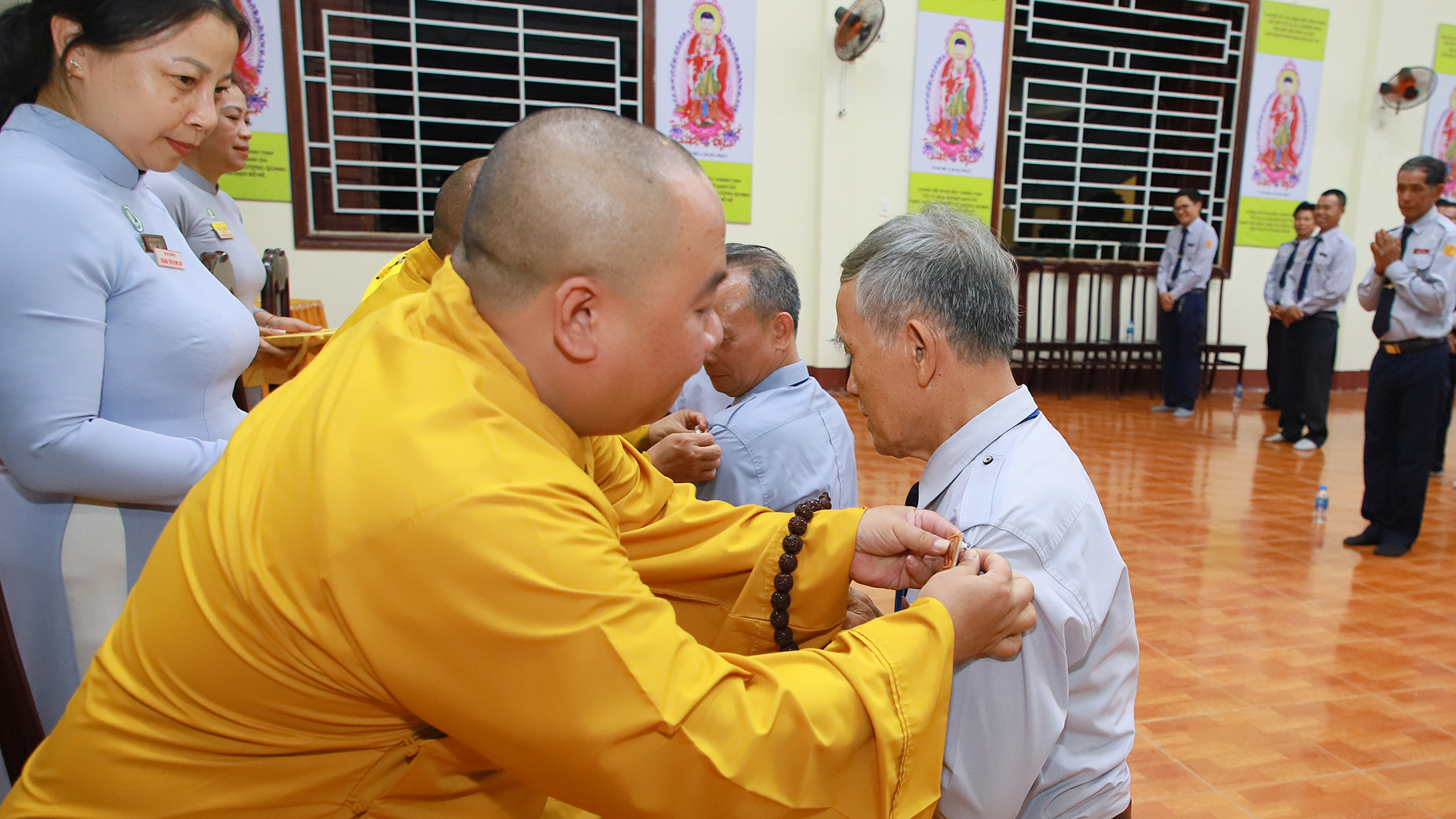Sau nghi thức cung thỉnh Chư Tôn Đức, niêm hương bạch Phật, chú nguyện cấp hiệu và tụng bài Tựa Thủ Lăng Nghiêm, ĐĐ. Thích Nhuận Hiển tuyên đọc Quyết định xếp cấp, chư Tôn đức chứng minh tiến hành gắn cấp hiệu và trao quyết định cho 67 Huynh trưởng thọ cấp.