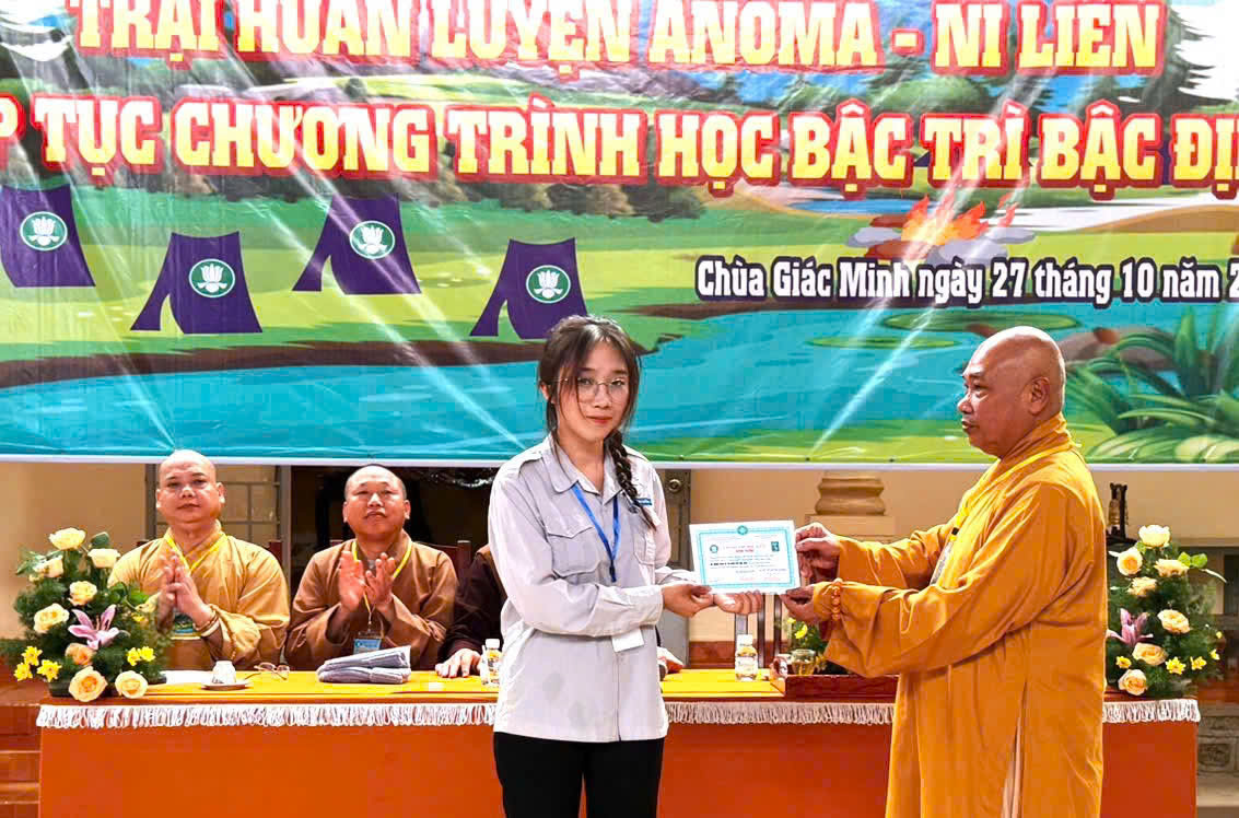 Sau quá trình nỗ lực học tập và rèn luyện, 33 học viên Bậc Kiên đã vinh dự nhận chứng chỉ trúng cách. Đặc biệt, trại sinh Phùng Thị Trà My, đơn vị GĐPT Quang Đức, đạt thủ khoa Bậc Kiên và được Hòa Thượng Thích Đồng Thọ trao chứng chỉ trúng cách tiêu biểu.