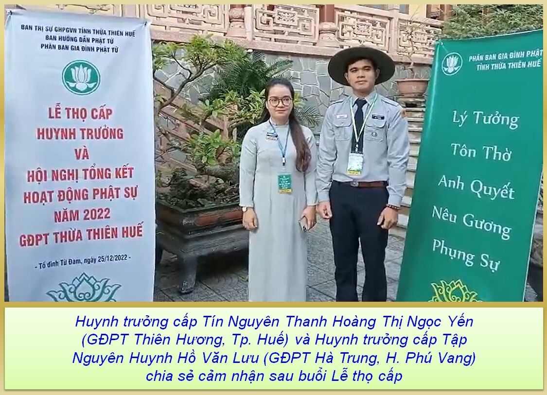 Chia sẻ những cảm nhận sau buổi lễ, Huynh trưởng cấp Tín Nguyên Thanh Hoàng Thị Ngọc Yến (GĐPT Thiên Hương, Tp. Huế) bày tỏ rất vinh dự và hạnh phúc khi được ghi nhận quá trình nỗ lực tu học, huấn luyện và sinh hoạt liên tục gần 20 năm qua thông qua buổi lễ thọ cấp lần này. Được biết chị Yến và chồng đều là những Huynh trưởng trẻ năng động, nhiệt tình và rất tâm huyết với Đạo pháp và tổ chức với tấm lòng “Hy sinh vì đàn em thân yêu”. Thực tế cho thấy trong xã hội hiện nay, trách nhiệm làm công chức, kinh doanh, làm mẹ, làm vợ, làm dâu… là những gánh nặng trên vai những Huynh trưởng nữ thế hệ 8X, 9X như chị Yến nhưng với tinh thần “vì màu Lam thân yêu” và “bồ đề tâm kiên cố”, Huynh trưởng Nguyên Thanh tâm nguyện sẽ cố gắng sinh hoạt GĐPT thường xuyên, nêu cao tinh thần tu tập, học hỏi không ngừng và phấn đấu là một tấm gương về Đời và Đạo để đàn em noi theo.