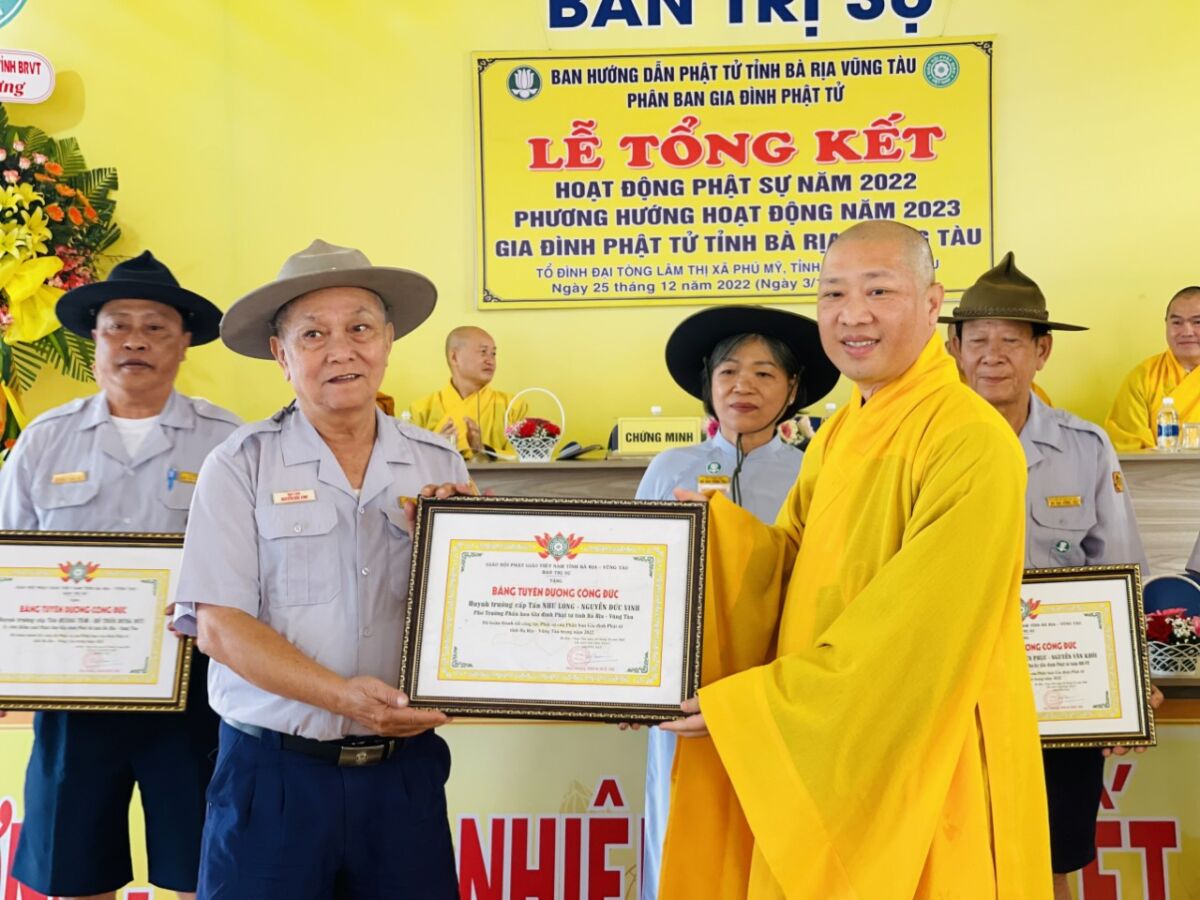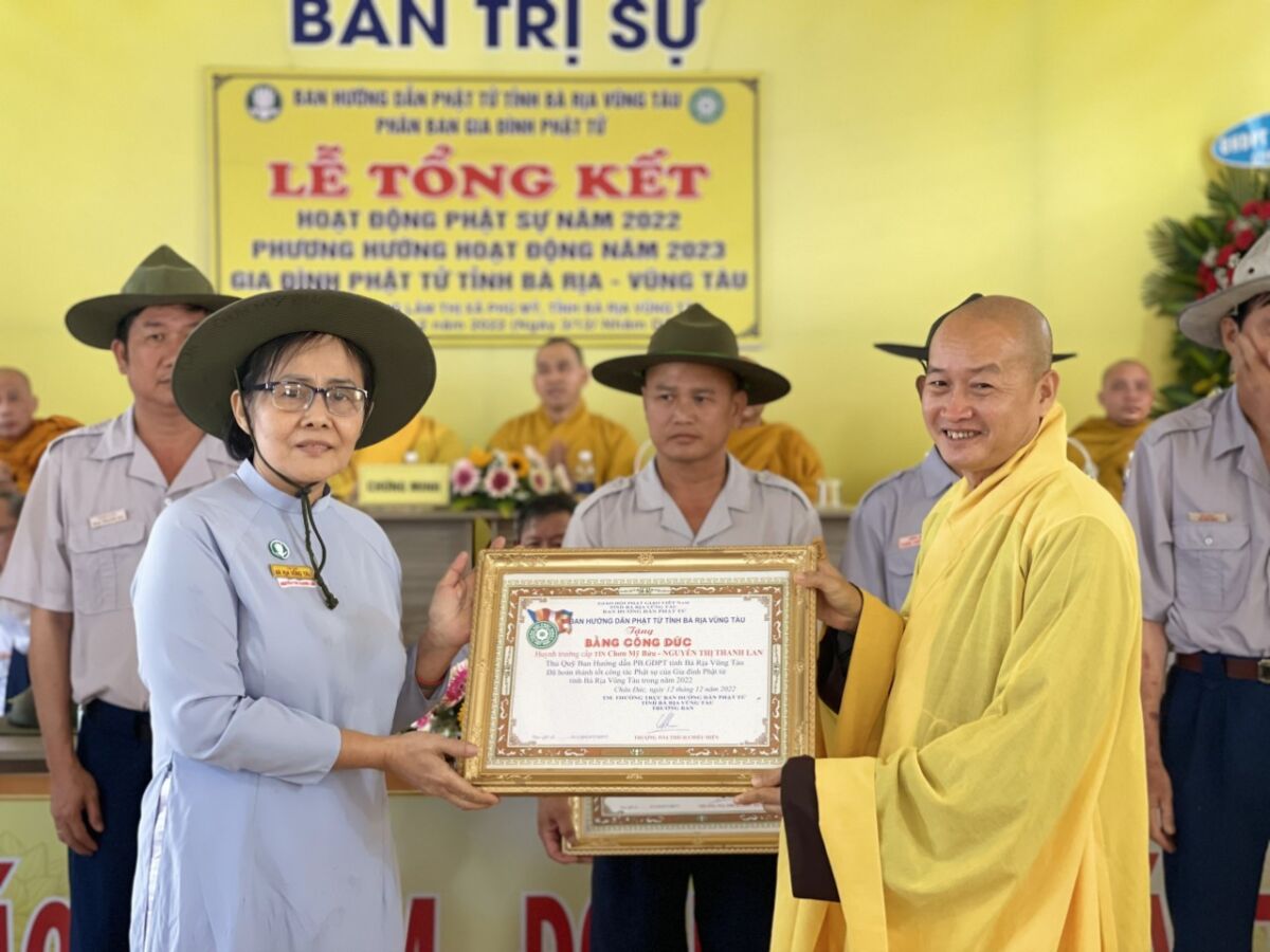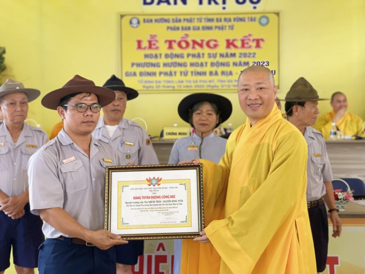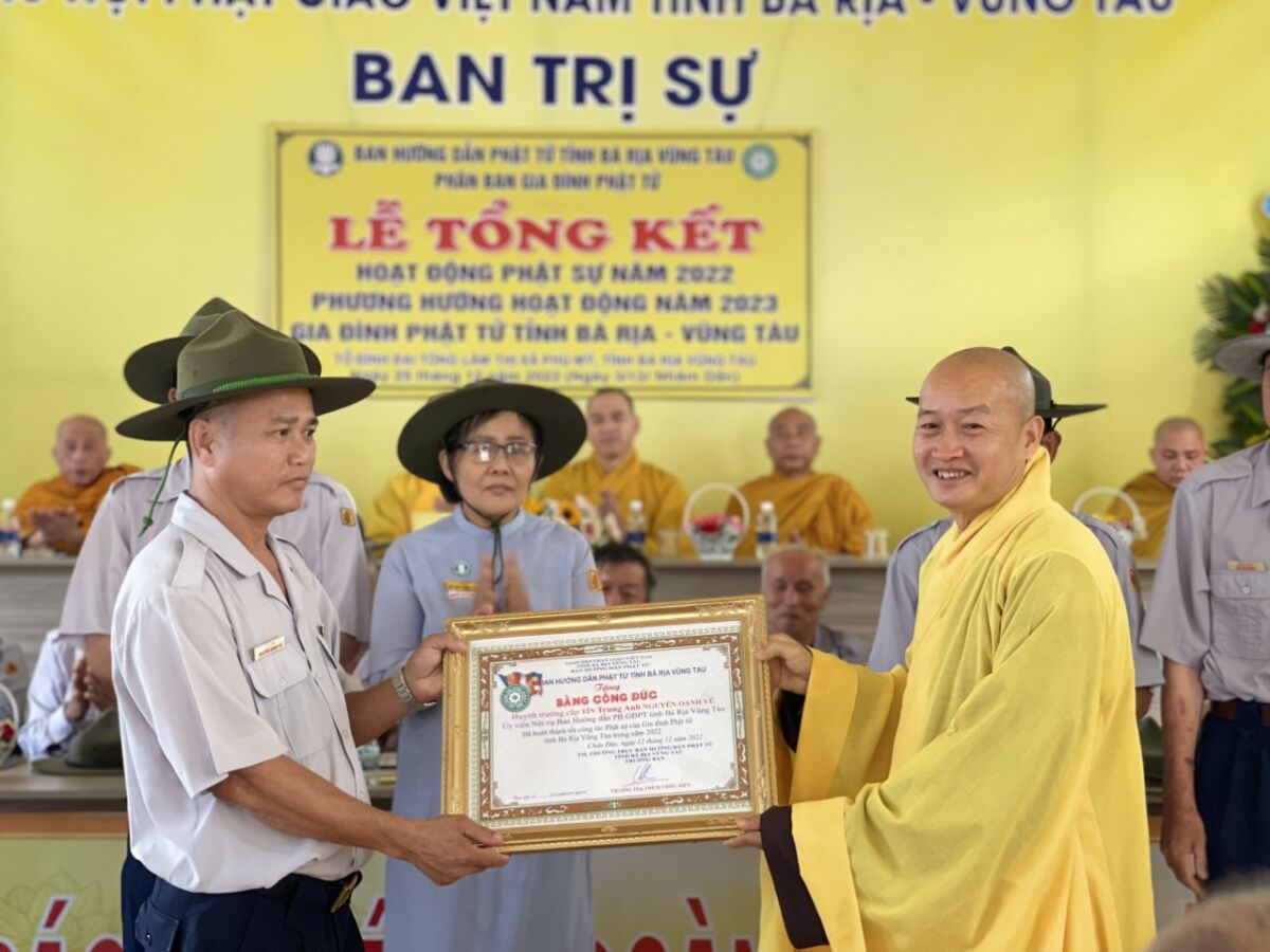 Trong lễ tổng kết công tác Phật sự năm 2022 của Gia đình Phật tử tỉnh, Ban Trị sự GHPG Tỉnh, Ban Hướng dẫn Phật tử Tỉnh đã trao tặng Bằng Tuyên Dương công đức cho tập thể và cá nhân các huynh trưởng trong Tỉnh đã hoàn thành xuất sắc nhiệm vụ được giao. Cũng trong dịp này Phân Ban GĐPT Tỉnh đã trao giấy chứng nhận và tặng hoa cho các huynh trưởng tham dự trại Vạn Hạnh V-2021 do Trung ương tổ chức vừa qua.