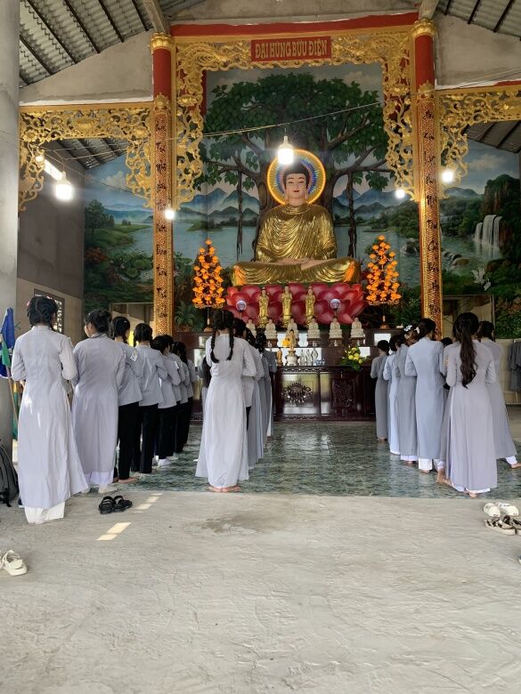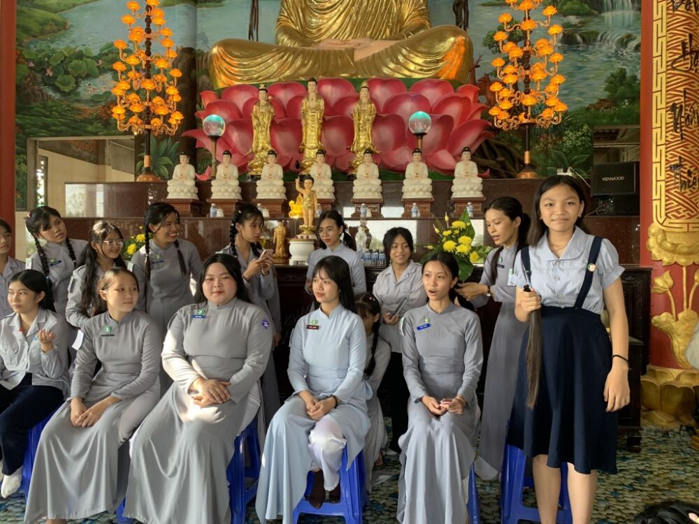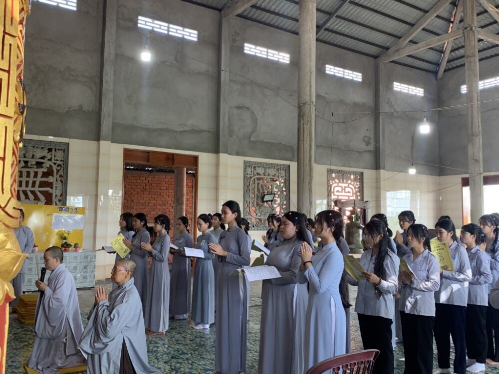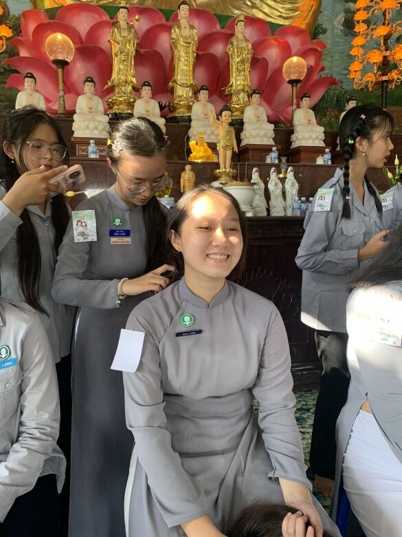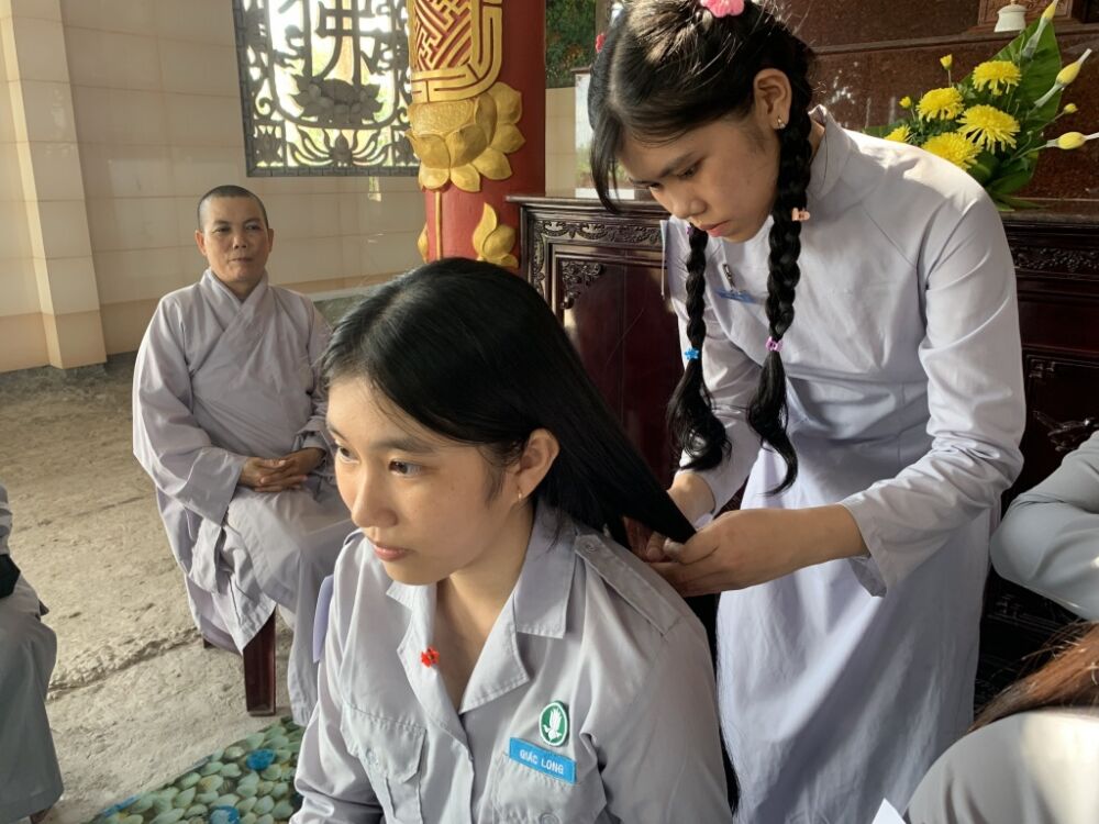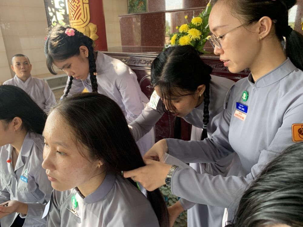 Trong đại hùng bửu điện trang nghiêm, dưới sự chứng minh của Sư Cô Thích Nữ Diệu Tâm và Sư Cô Thích Nữ Trí Hiền, mái tóc của các em được cắt trong những ánh mắt hân hoan, xúc động và mang lại nhiều xúc cảm cho các em đoàn sinh.