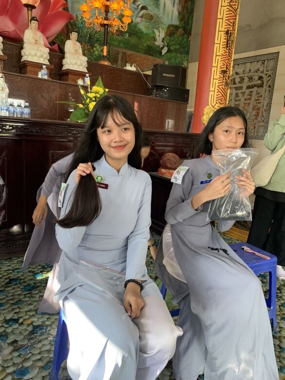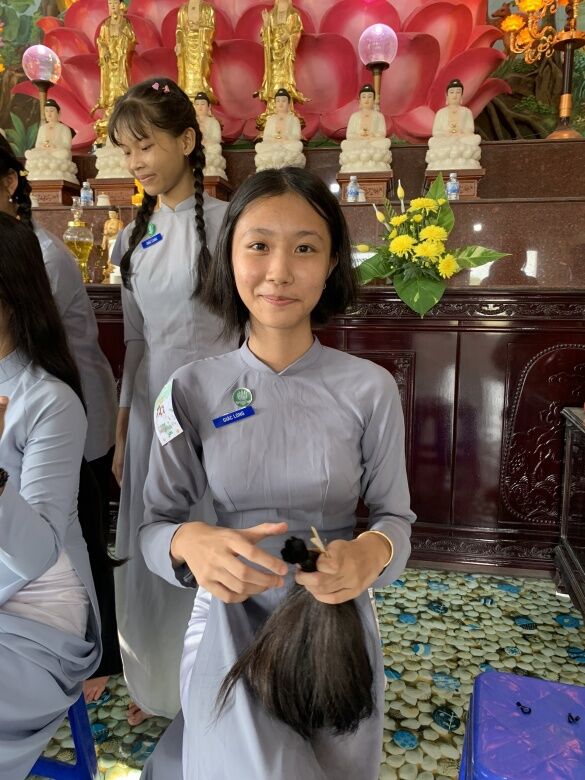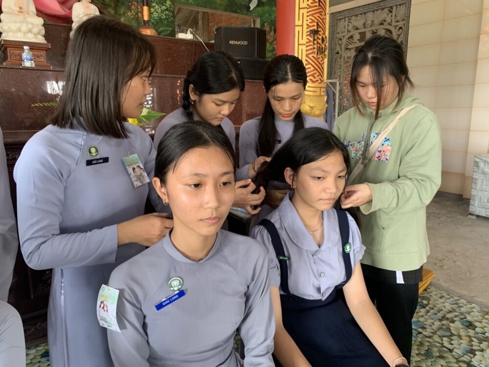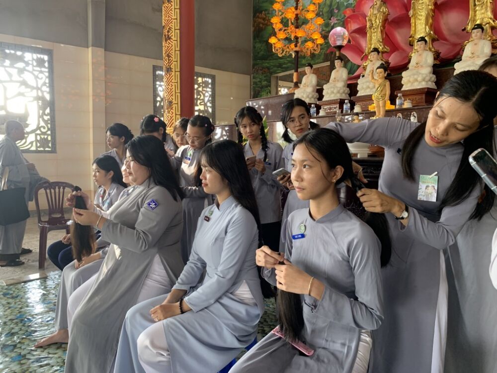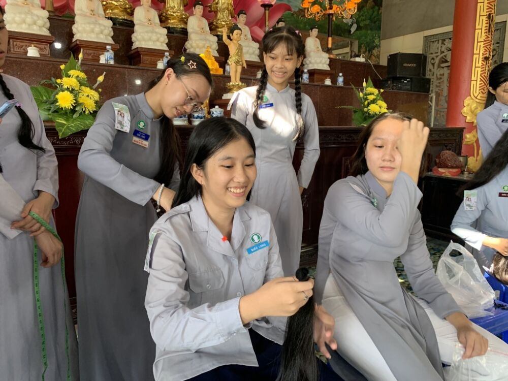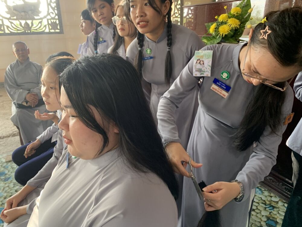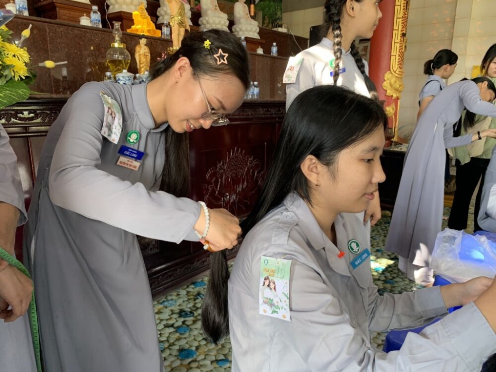 Nương theo hạnh từ bi của Bồ tát Quán Thế Âm, hoạt động đã được Đoàn phổ biến từ đầu năm để các em phát nguyện nuôi và giữ tóc để hiến. Chị Đoàn Trưởng Thiếu Nữ GĐPT Bửu Long đã chia sẻ “Tóc và móng tay chúng ta rồi sẽ dài ra rất nhanh. Nhưng với bệnh nhân ung thư, đó là một điều xa xỉ. Tóc giả từ nilon thì rất khó chịu, còn tóc thật thì… Các em hiến tóc, chính là bố thí nội tài, là sự buông xả không chấp niệm, là một hành động cao đẹp đáng tôn vinh.” –