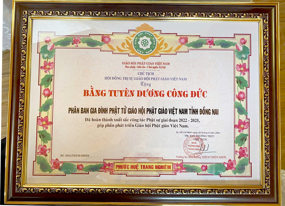 Nhân dịp này, Phân ban Gia đình Phật tử tỉnh Đồng Nai đã vinh dự đón nhận Bằng tuyên dương công đức do Hội đồng Trị sự GHPGVN trao tặng. Đây không chỉ là sự ghi nhận cho những nỗ lực phụng sự bền bỉ, vô úy trong suốt thời gian qua, mà còn là nguồn động lực to lớn, đồng thời cũng đặt ra những kỳ vọng và trách nhiệm mới cho Phân ban trong nhiệm kỳ sắp tới.