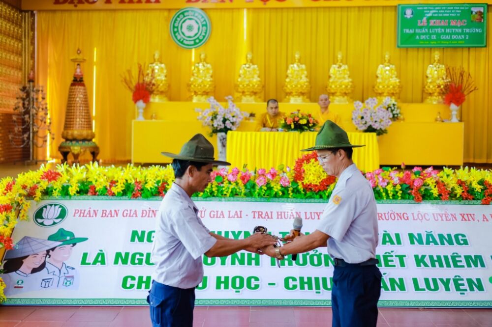 Huynh trưởng Cấp Tấn Quảng Dự Nguyễn Tường Vinh, Trưởng Phân ban GĐPT tỉnh trong phần huấn từ đã bày tỏ lòng tri ân đến ĐĐ. Thích Đồng Giải và chư Tôn Đức trú xứ chùa Vạn Phật đã yêu thương và tạo điều kiện tốt nhất để GĐPT tỉnh Gia Lai có thể tổ chức trại. Anh cũng khuyến tấn Ban quản trại, Ban giảng huấn phải là những người mô phạm trong kỳ trại, lấy thân giáo để cho trại sinh noi theo. Anh khích lệ các trại sinh đã dành thời gian, sắp xếp công việc cá nhân để tham gia và hoàn thành 2 giai đoạn của trại huấn luyện huynh trưởng A Dục IX và chúc các anh chị học tập thật chăm, hoàn thiện thêm các kỹ năng còn khuyết để về xây dưng đơn vị sở tại phát triển hơn.