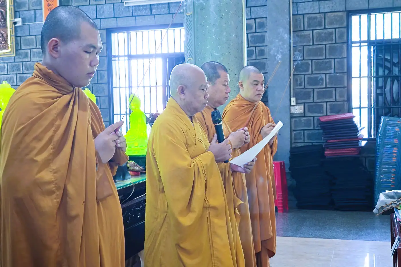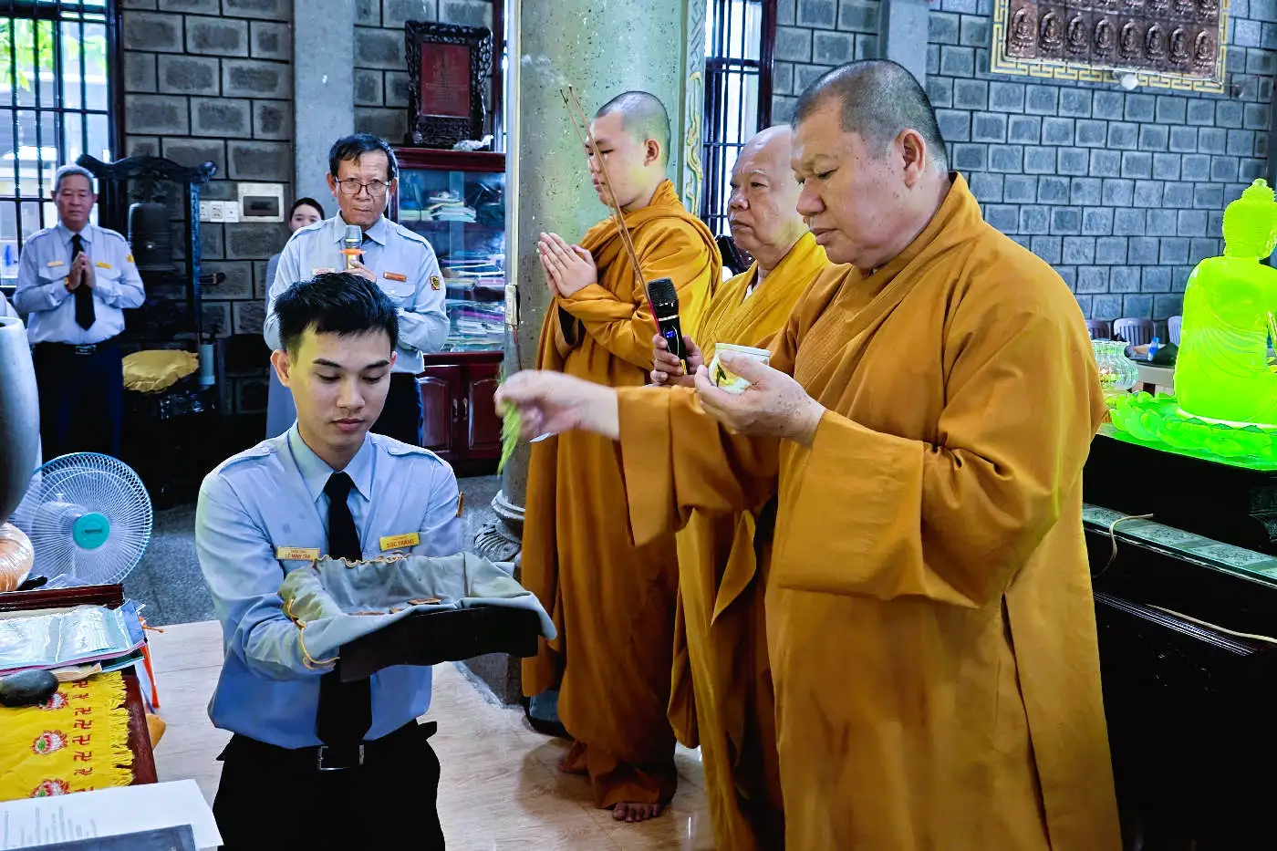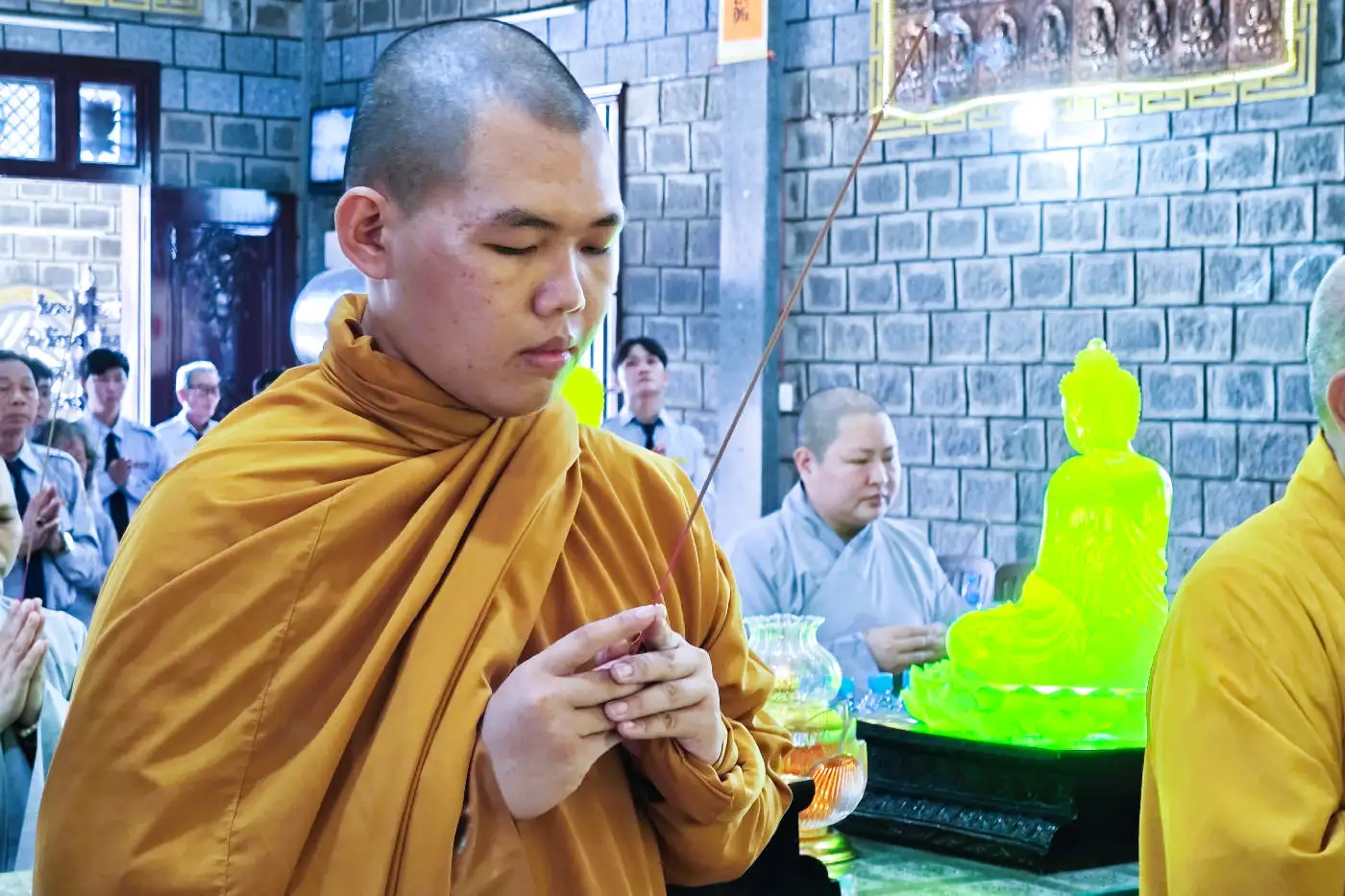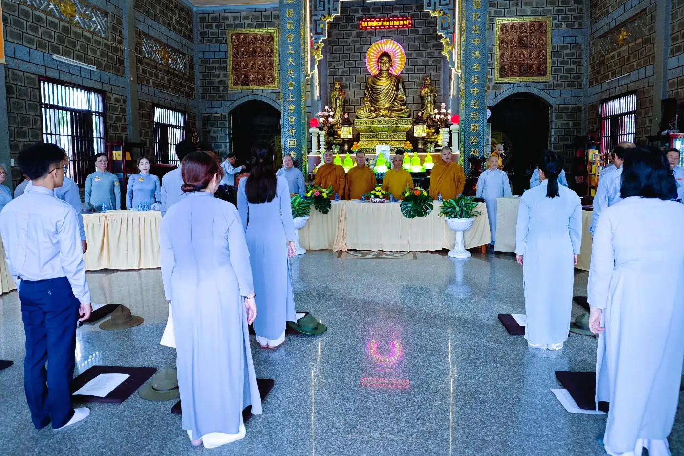 Buổi lễ bắt đầu với phần chú nguyện và tụng Thủ Lăng Nghiêm do Chư Tôn Đức chủ lễ. Trong khói trầm lan tỏa, bài Tựa chú Lăng Nghiêm vang lên như lời thệ nguyện “Ngũ-trược ác-thế thệ tiên nhập” của các anh chị tân thăng.