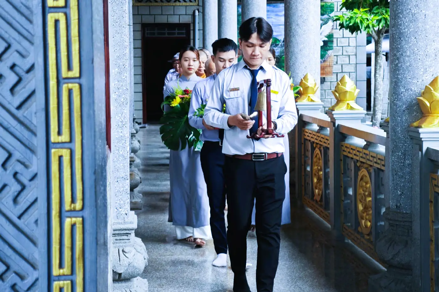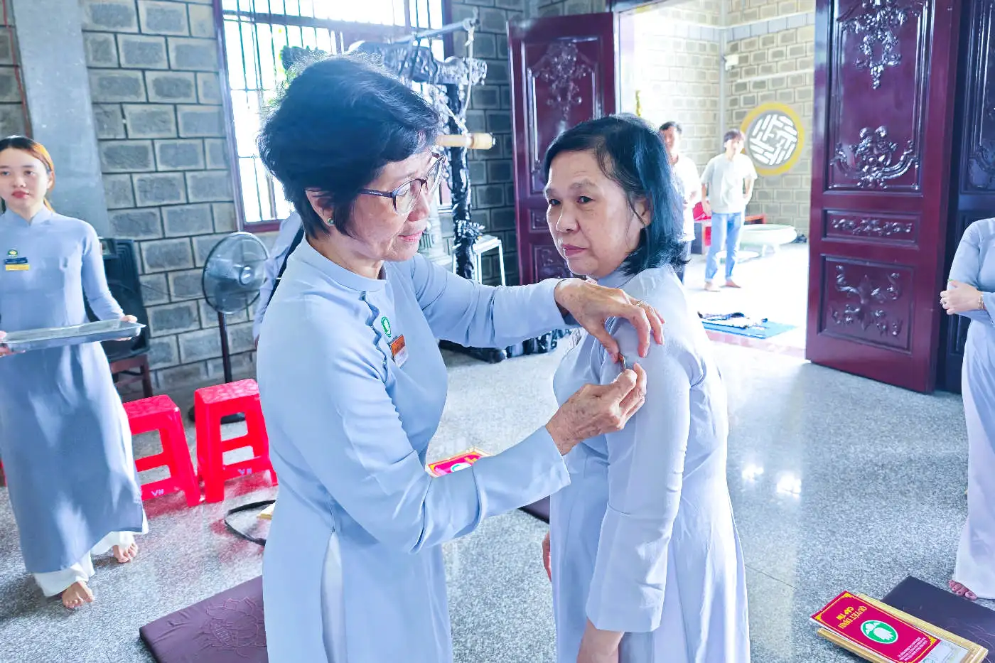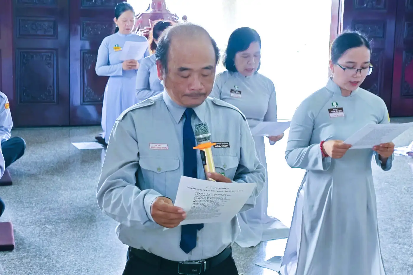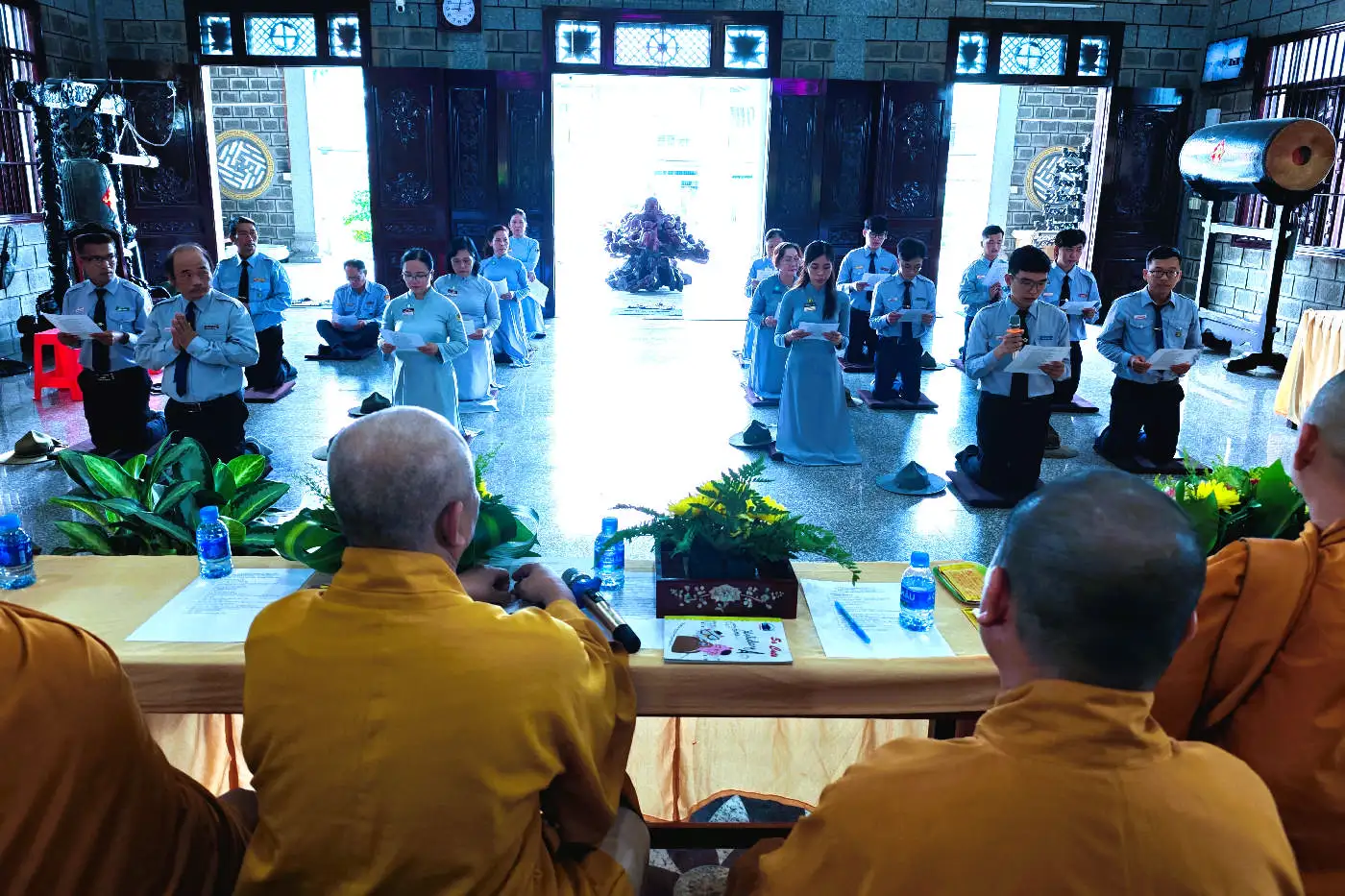 Buổi lễ bắt đầu với phần chú nguyện và tụng Thủ Lăng Nghiêm do Chư Tôn Đức chủ lễ. Trong khói trầm lan tỏa, bài Tựa chú Lăng Nghiêm vang lên như lời thệ nguyện “Ngũ-trược ác-thế thệ tiên nhập” của các anh chị tân thăng.