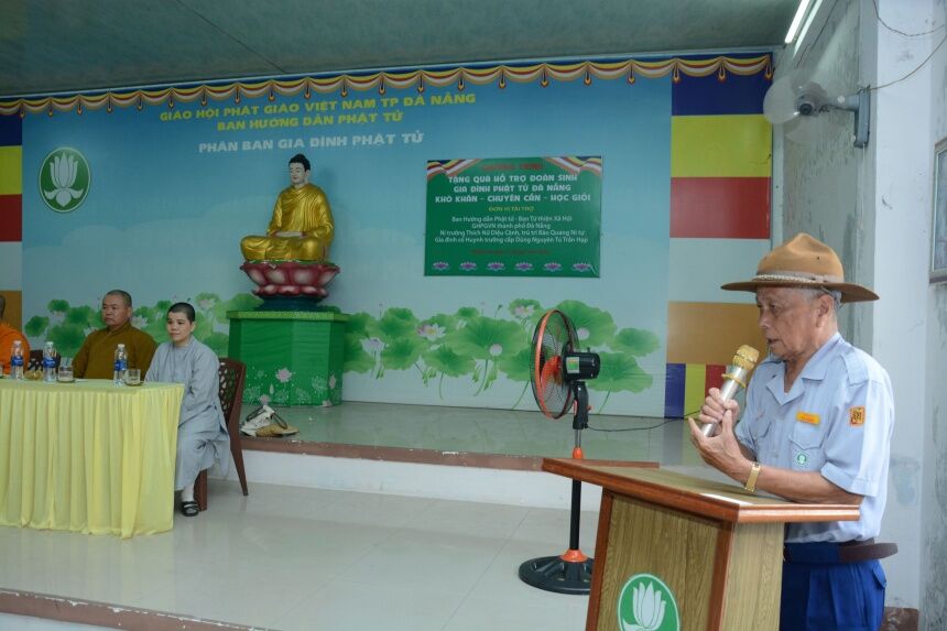 Huynh trưởng Thị Sơn Huỳnh Ngọc Lâm đã thay mặt Phân ban GĐPT Đà Nẵng phát biểu cảm tạ Chư Tôn Đức Tăng Ni và gia đình Cố huynh trưởng Nguyên Tú Trần Hạp đã chia sẻ tặng quà cho các đoàn sinh GĐPT, tạo động lực để các em tiếp tục gắn bó cống hiến cho tổ chức.