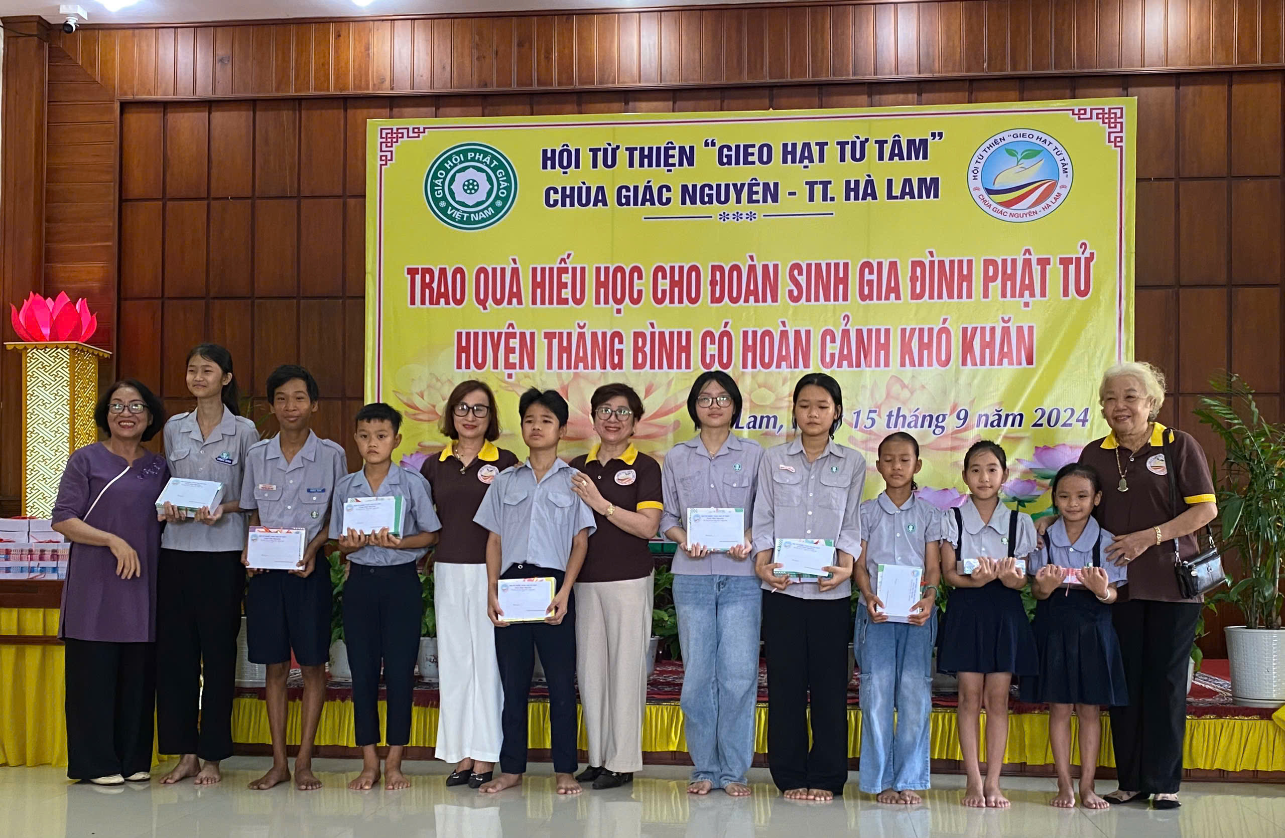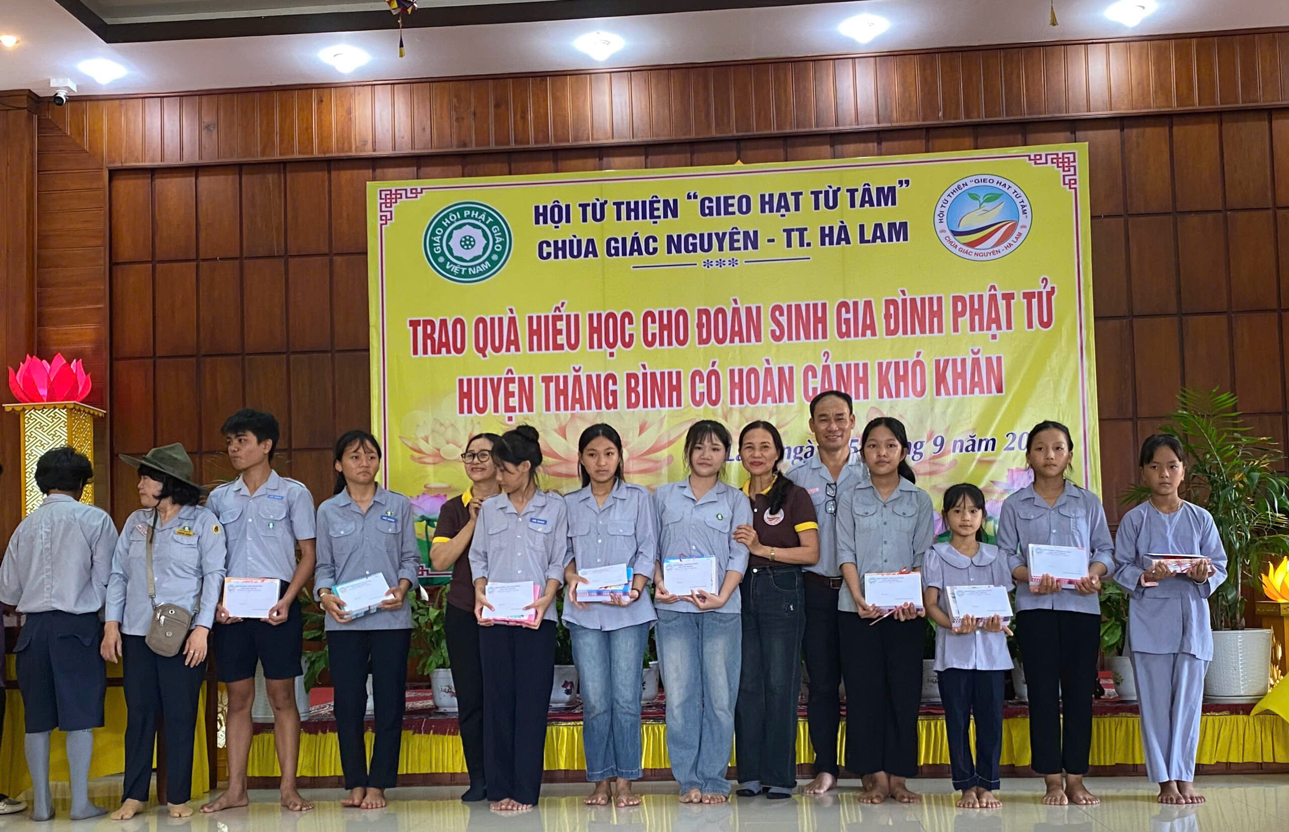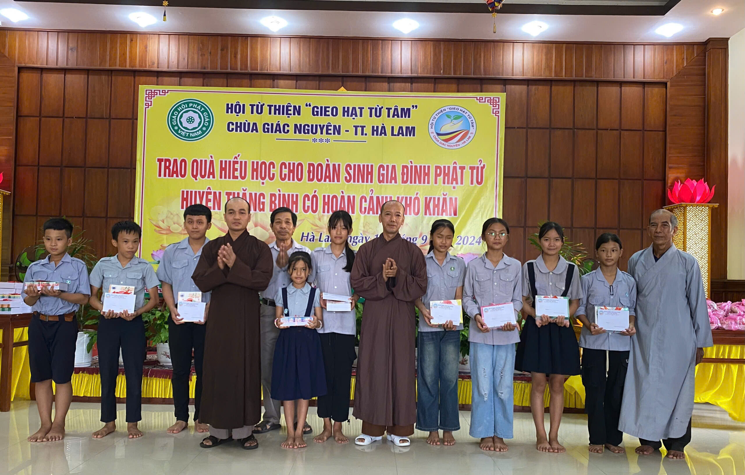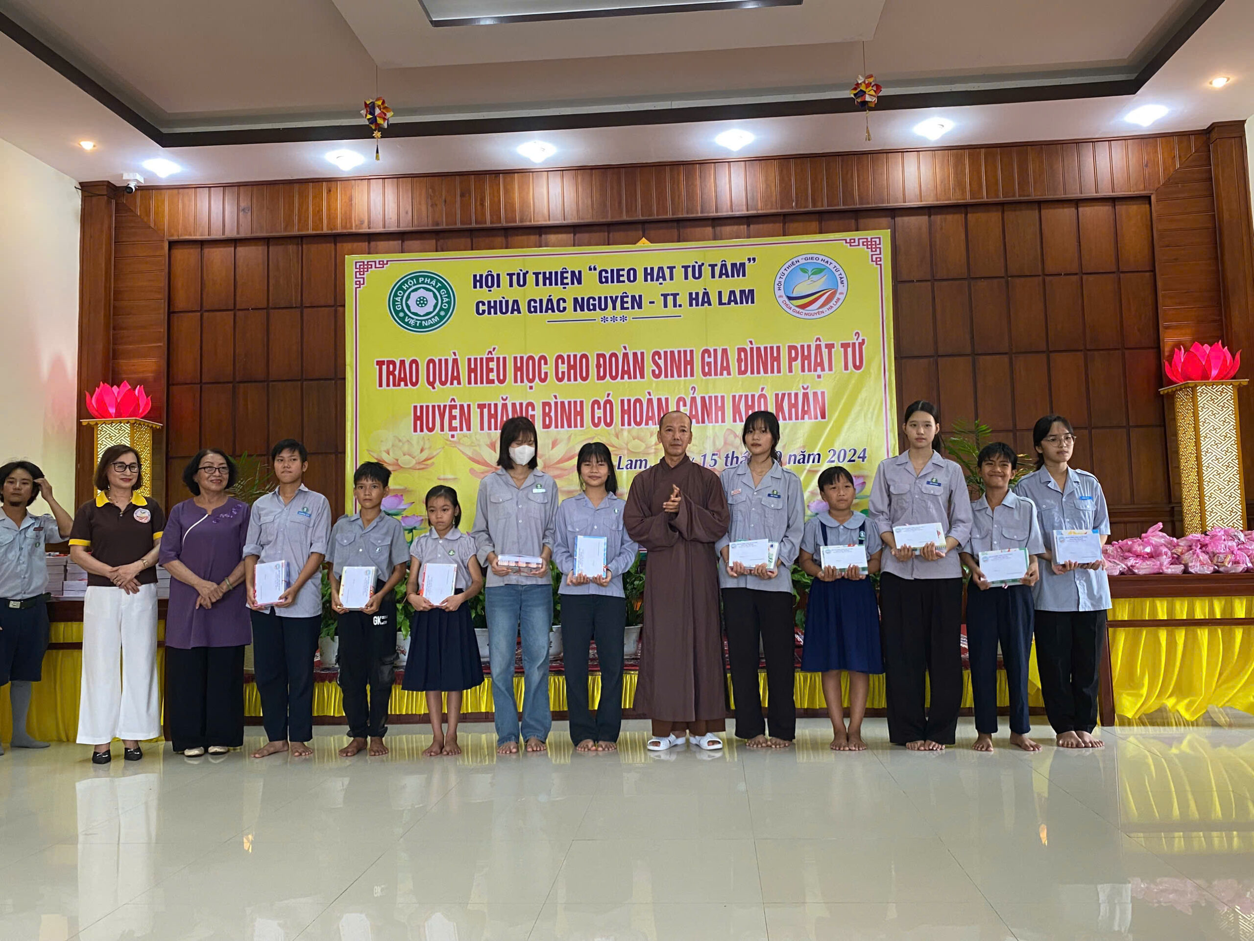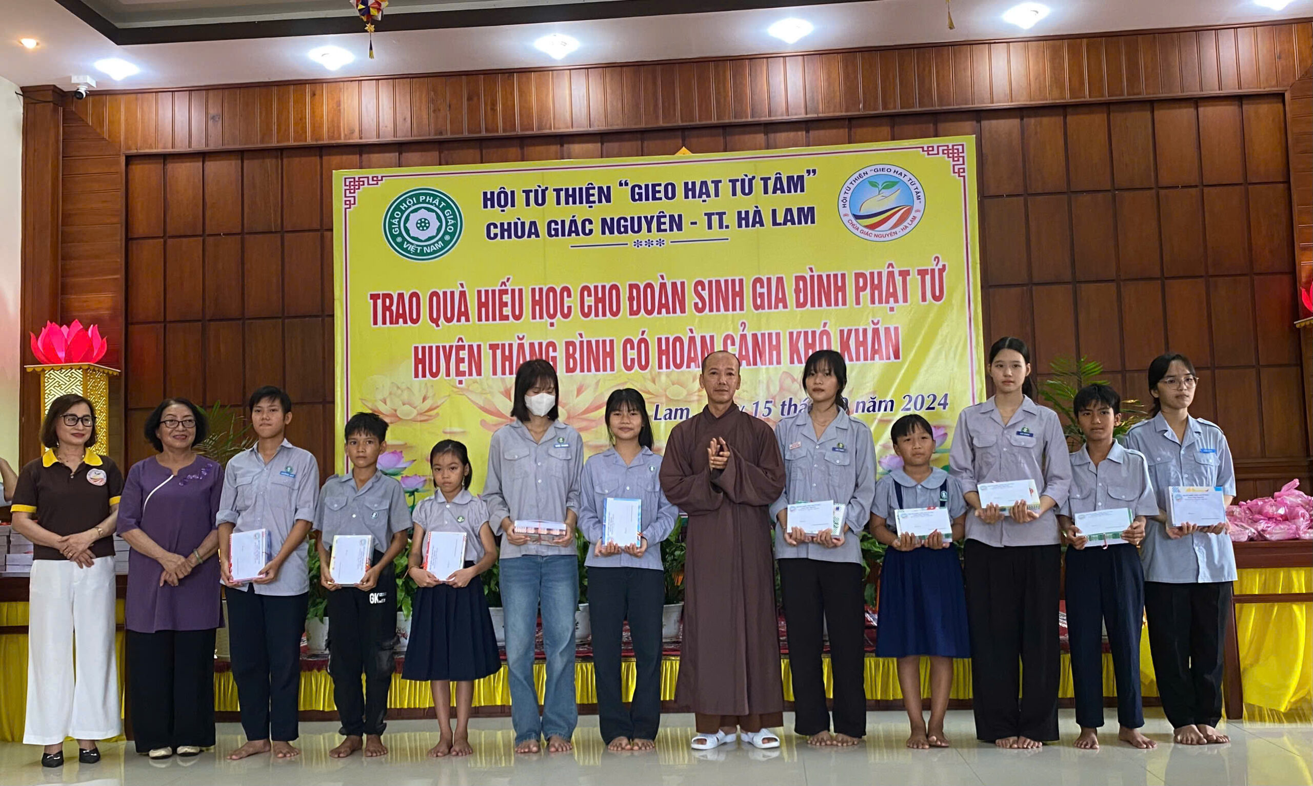 Trong bối cảnh xã hội ngày càng phát triển, giáo dục trở thành chìa khóa quan trọng giúp mỗi cá nhân mở ra cánh cửa tương lai để vững bước vào đời. Học tập không chỉ là con đường dẫn đến kiến thức mà còn là nền tảng giúp các em học sinh rèn luyện kỹ năng, xây dựng nhân cách và chuẩn bị hành trang cho cuộc sống, tuy nhiên, không phải đoàn sinh GĐPT nào cũng có điều kiện thuận lợi để theo đuổi con đường học tập. Xuất phát từ nổi niềm trăn trở đó, chiều ngày 15/9/2024 (nhằm ngày 13/8 năm Giáp Thìn), Thượng toạ Thích Tánh Thông – UV Thường trực BTS GHPG VN tỉnh Quảng Nam, Trưởng Ban Trị sự GHPG VN huyện Thăng Bình, Trụ trì chùa Giác Nguyên thị trấn Hà Lam, hội từ thiện “Gieo Hạt Từ Tâm” đã trao đã trao tặng 44 xuất quà khuyến học cho đoàn sinh GĐPT trên toàn huyện có hoàn cảnh khó khăn (Mỗi phần quà trị giá 350 nghìn đồng).