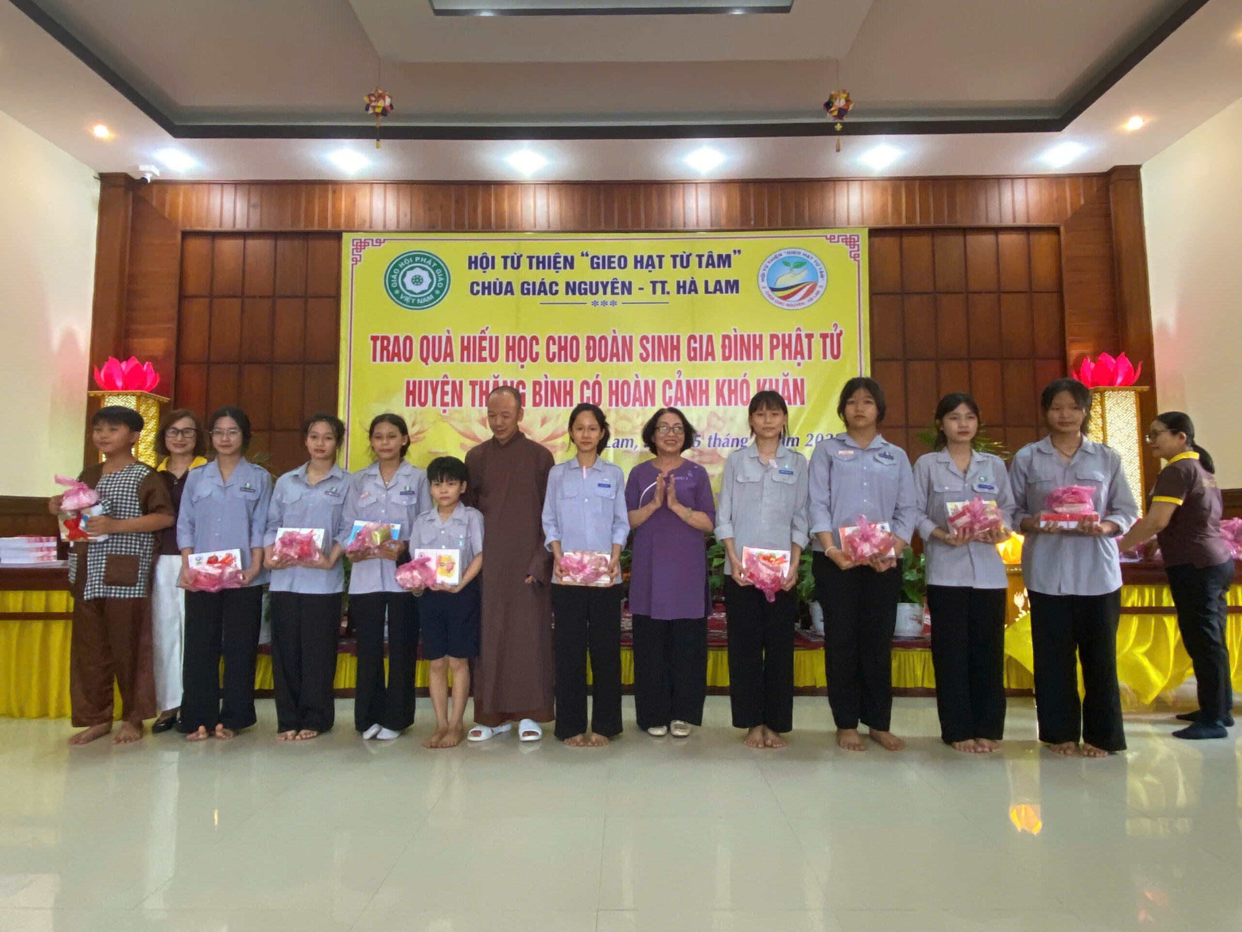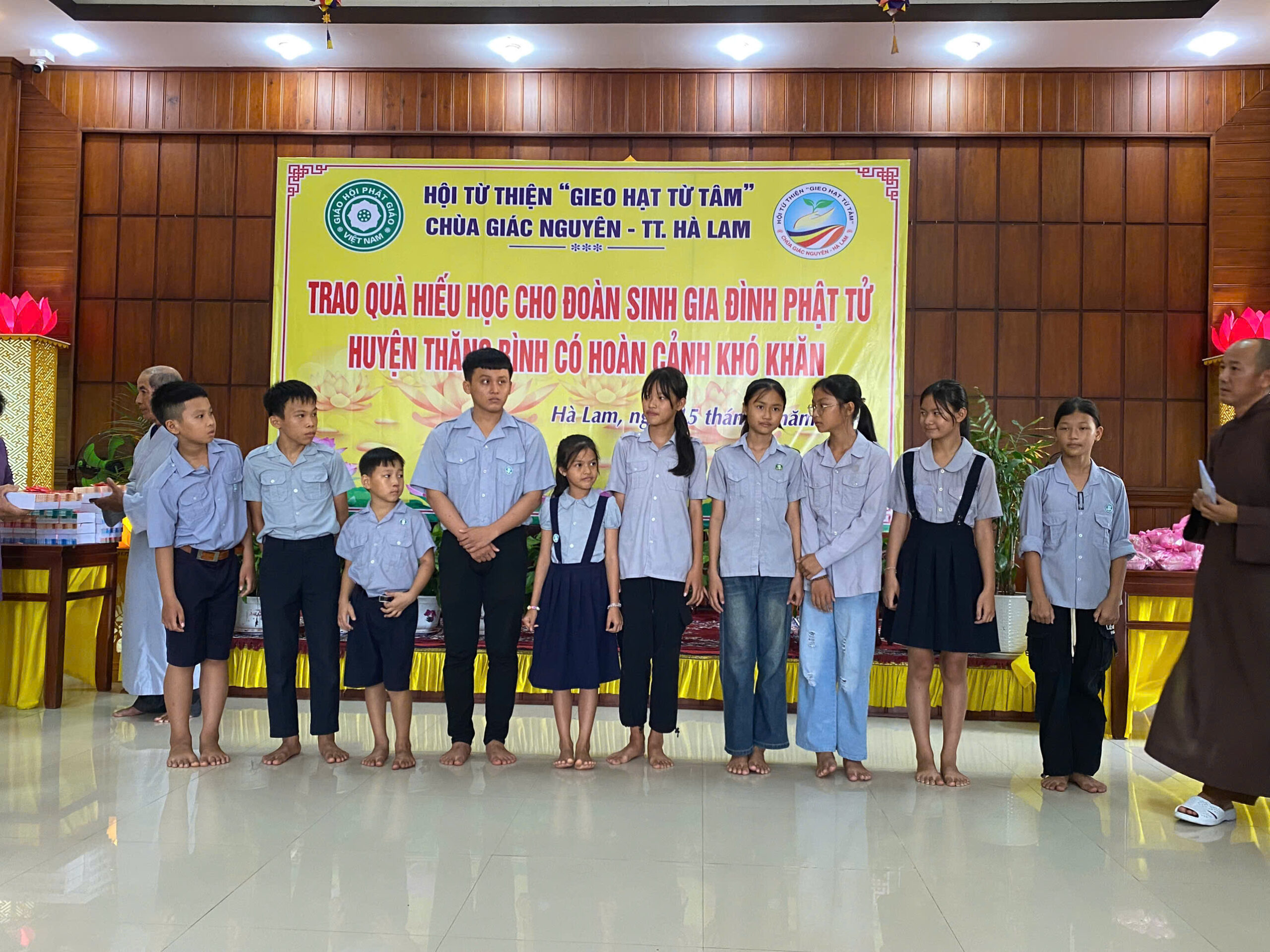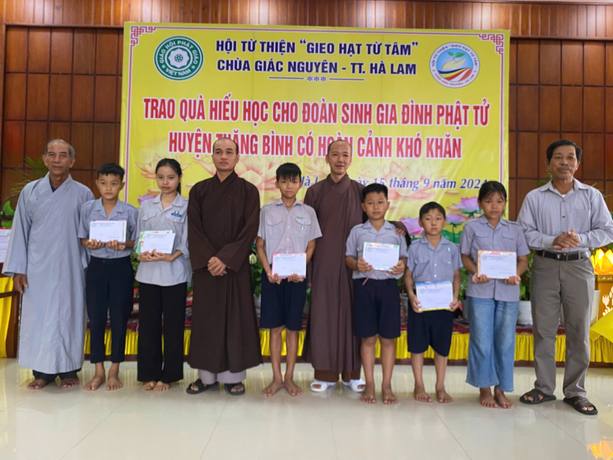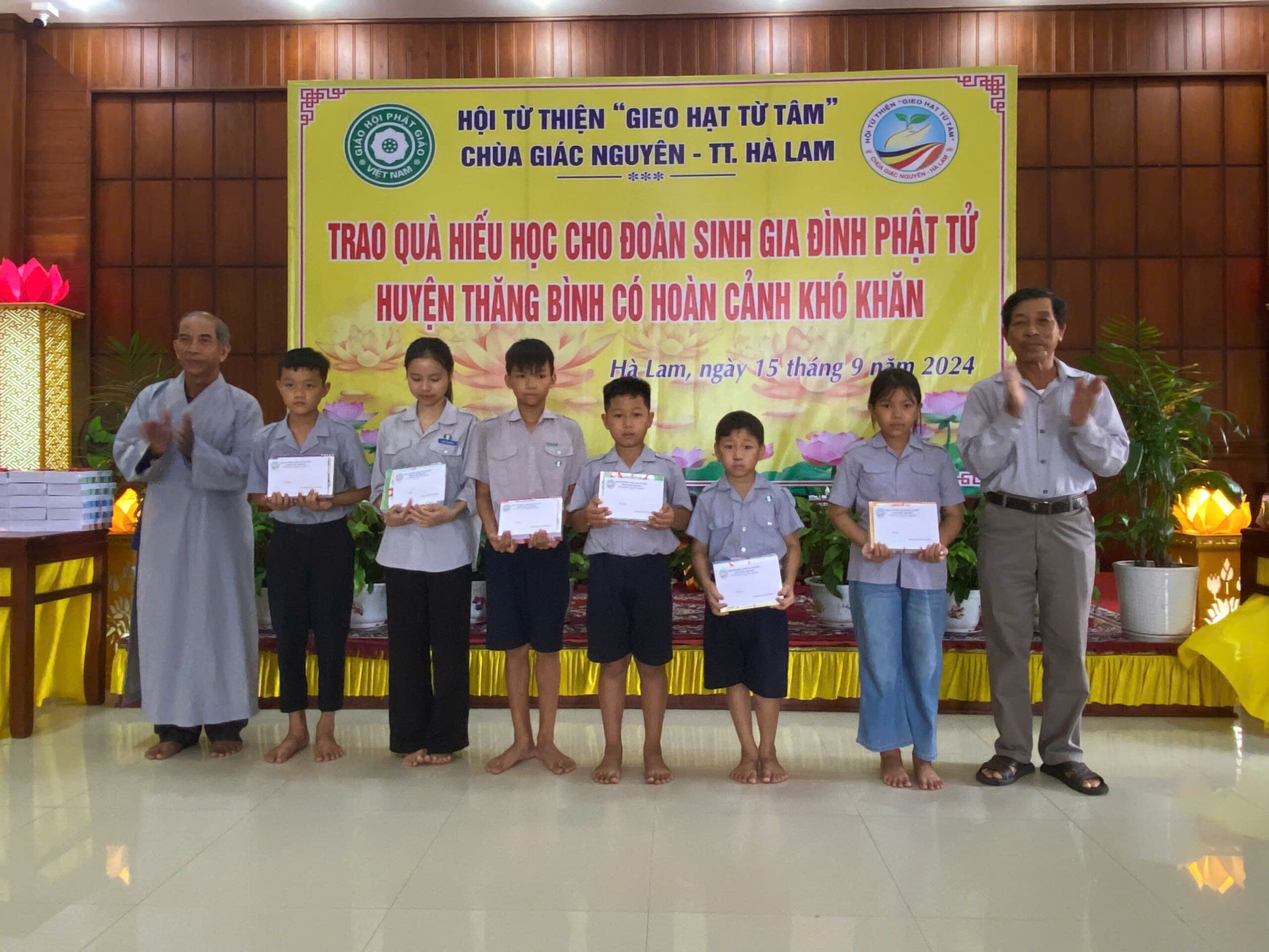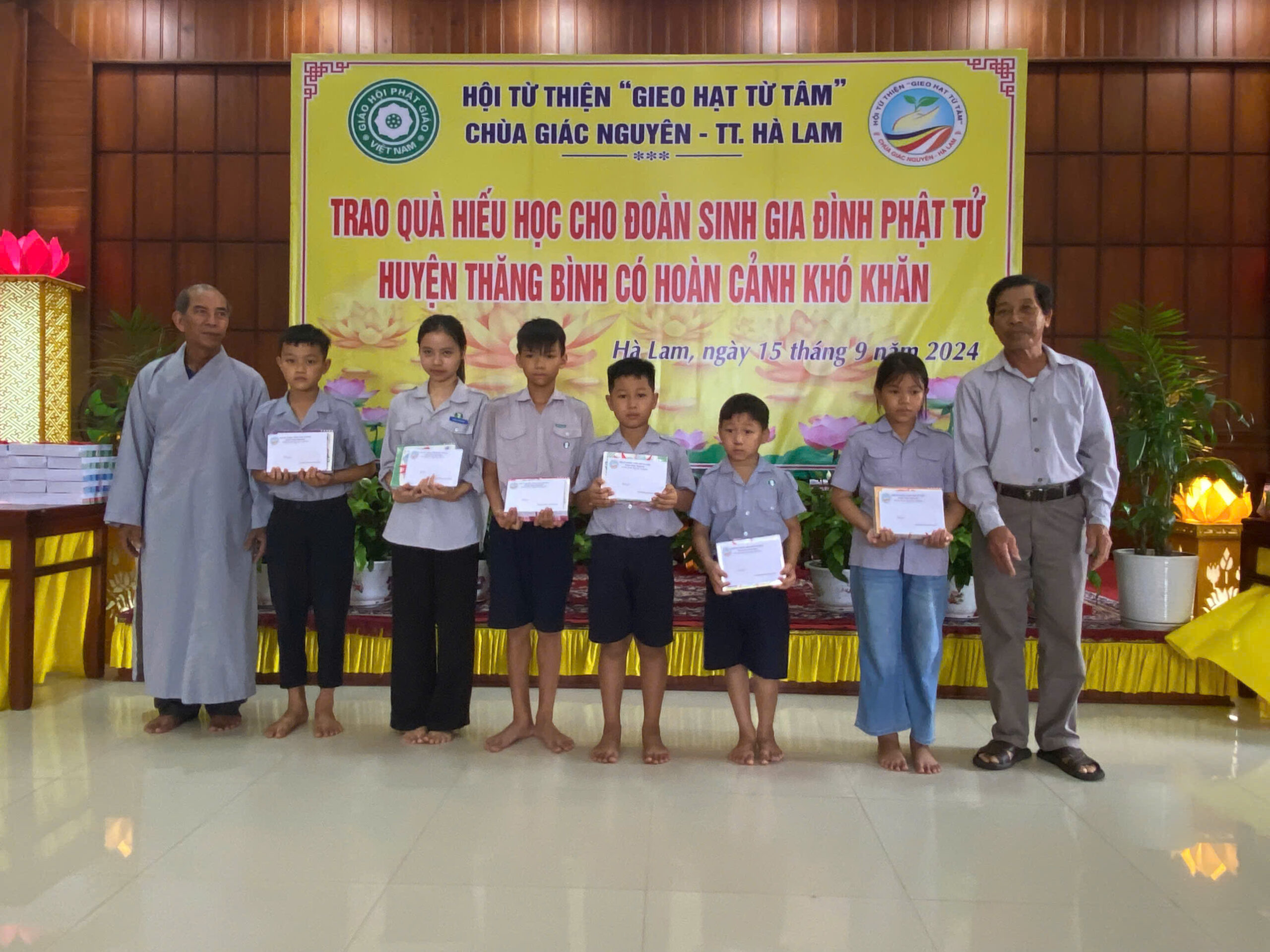 Trong bối cảnh xã hội ngày càng phát triển, giáo dục trở thành chìa khóa quan trọng giúp mỗi cá nhân mở ra cánh cửa tương lai để vững bước vào đời. Học tập không chỉ là con đường dẫn đến kiến thức mà còn là nền tảng giúp các em học sinh rèn luyện kỹ năng, xây dựng nhân cách và chuẩn bị hành trang cho cuộc sống, tuy nhiên, không phải đoàn sinh GĐPT nào cũng có điều kiện thuận lợi để theo đuổi con đường học tập. Xuất phát từ nổi niềm trăn trở đó, chiều ngày 15/9/2024 (nhằm ngày 13/8 năm Giáp Thìn), Thượng toạ Thích Tánh Thông – UV Thường trực BTS GHPG VN tỉnh Quảng Nam, Trưởng Ban Trị sự GHPG VN huyện Thăng Bình, Trụ trì chùa Giác Nguyên thị trấn Hà Lam, hội từ thiện “Gieo Hạt Từ Tâm” đã trao đã trao tặng 44 xuất quà khuyến học cho đoàn sinh GĐPT trên toàn huyện có hoàn cảnh khó khăn (Mỗi phần quà trị giá 350 nghìn đồng).