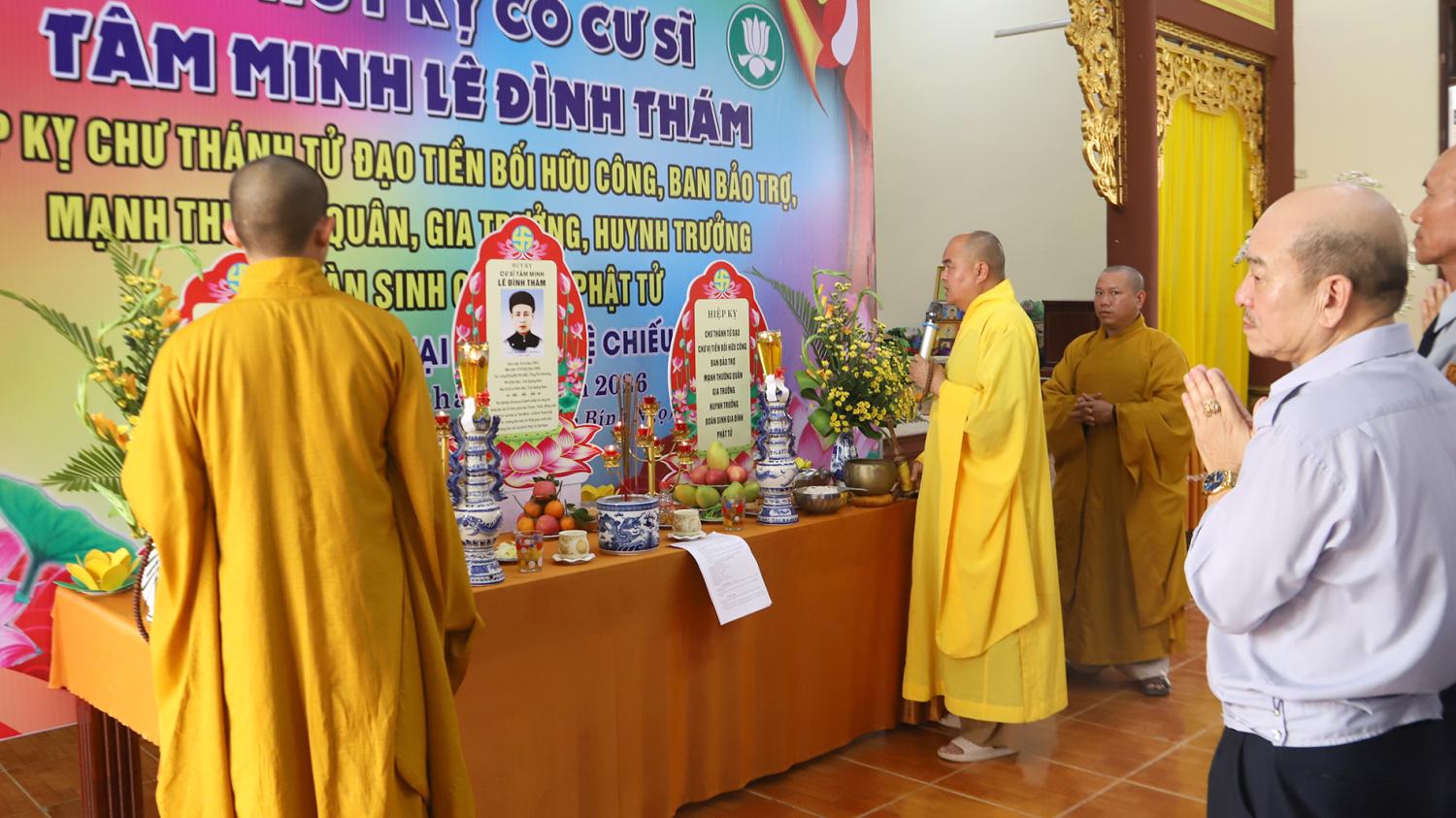 Tiếp đó, Huynh trưởng cấp Tấn Thị Tùng Nguyễn Huy Vũ, đã trang nghiêm dâng lời tưởng niệm, ôn lại cuộc đời, sự nghiệp và công hạnh cao quý của Cư sĩ Tâm Minh Lê Đình Thám. Qua lời tưởng niệm, hình ảnh một bậc cư sĩ trí thức, tận tụy với Đạo pháp, hết lòng vì sự nghiệp giáo dục thanh thiếu niên theo tinh thần Phật giáo được khắc họa sâu sắc.