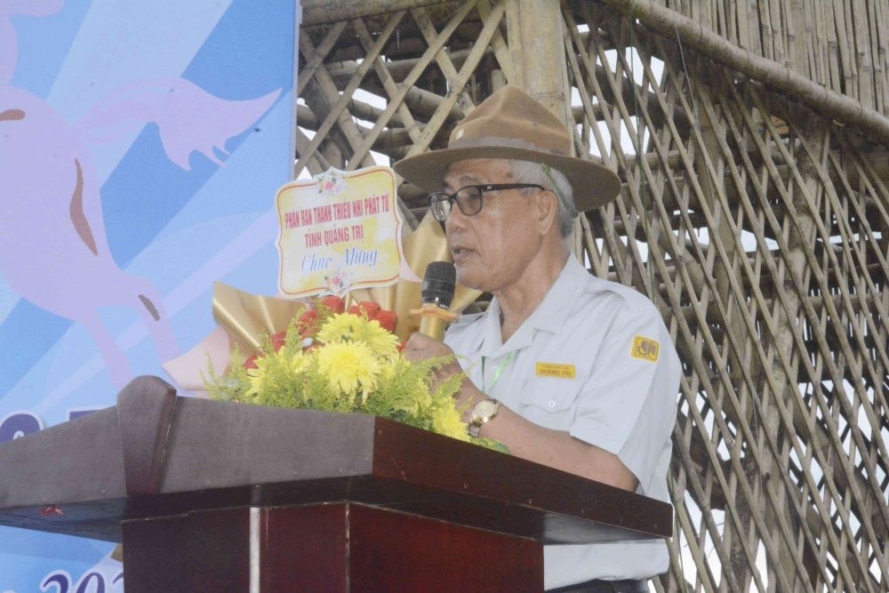 Phát biểu chỉ đạo Huynh trưởng Trưởng Phân ban GĐPT Tỉnh đã thành kính đảnh lễ cung nghinh Chư Thượng Tọa, Chư Đại đức Tăng, Chư Đại Đức Ni Thường trực Ban Trị sự – Ban HDPT GHPGVN Tỉnh và các Huyện, Thị xã, Thành Phố. Mặc dù giữa mùa an cư kiết hạ, thời tiết khắc nghiệt, Phật sự lại bộn bề nhưng vì long bi mẫn mà Chư Tôn Thiền Đức đã quang lâm Chứng minh Phật sự của GĐPT chúng con sáng hôm nay. Trân trọng chào mừng quỵ vị đại biểu chính quyền mặt trận các cấp, và quý Huynh trưởng và đoàn sinh Ngành Thiếu trong toàn tỉnh về tham dự hội trại này. Đồng thời Anh cũng tán dương tinh thần cố gắng, khắc phục khó khăn trở ngạị cá nhân, trở về đây cùng nhau vui ngày hội trại, họp mặt, tình Lam, chia sẽ học hỏi un đúc thêm nghị lực, ý chí tiến thủ để làm hàng trang tiếp bước ngày mai. Các em là những đoàn sinh Ngành thiếu ưu tú, có kiến thức năng lực chuyên môn, có niềm tin và đạo hạnh, là những thế hệ tương lai của Ban Hướng dẫn kỳ vọng là những nhân tố tiếp nối anh chị đi trước,tiếp tục giữ gìn truyền thống GĐPT, duy trì ổn định và không ngừng phát triển. Vì vậy các em cần phải tinh tấn, nổ lực nhiều hơn nữa trong tu học huấn luyện, nâng cao năng lực, không ngừng rèn luyện tu dữơng đạo đức phẩm hạnh, xây dựng cho mình lới sống hướng thiện, hướng thượng, người đoàn viên mẫu mực, người công dân gương mẫu, làm lợi lạc cho bản thân, gia đình và xã hội, đem hết tâm sức của mình phụng sự đạo pháp và xây dựng xã hội an lac, chung tay hiệp lực xây dựng mái nhà lam Quảng Trị luôn mãi vững bền, xứng tầm vị thế, vai trò của GĐPT, tổ chức thanh thiếu nhi Phật giáo trong lòng GHPGVN.