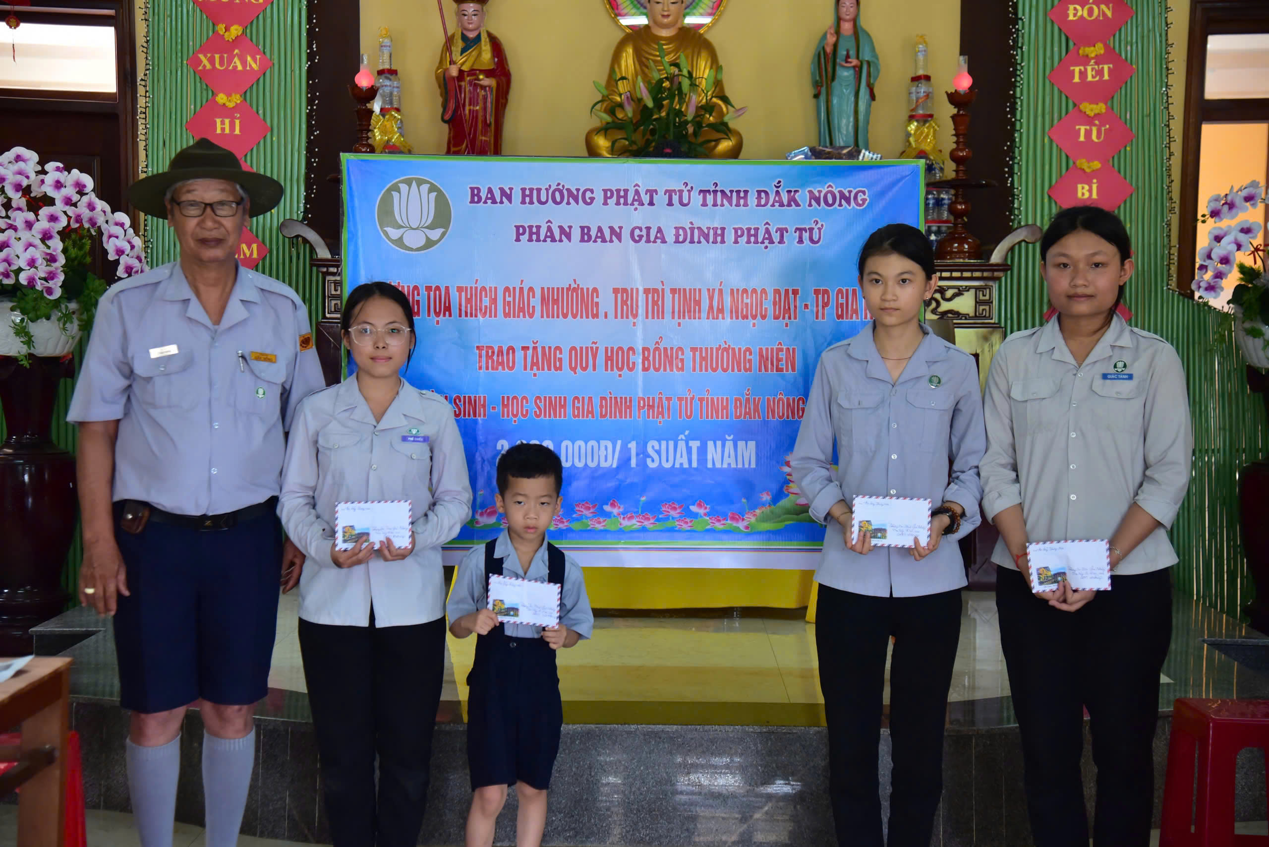 Thay mặt cho Thượng Tọa Htr. cấp Tấn- Thị Vân- Lê Văn Tuyển- UV PB GĐPT Trung Ương- UV TT BTS GHPGVN tỉnh Đắk Nông – Phó Trưởng BHD PT, Trưởng PB GĐPT tỉnh Đăk Nông. đã trao 4 phần quà khuyến học cho đoàn sinh GĐPT vượt khó vươn lên trong học tập (Mỗi phần quà trị giá 2.000.000 đồng), tổng số tiền tài trợ là 8 000 000 đồng