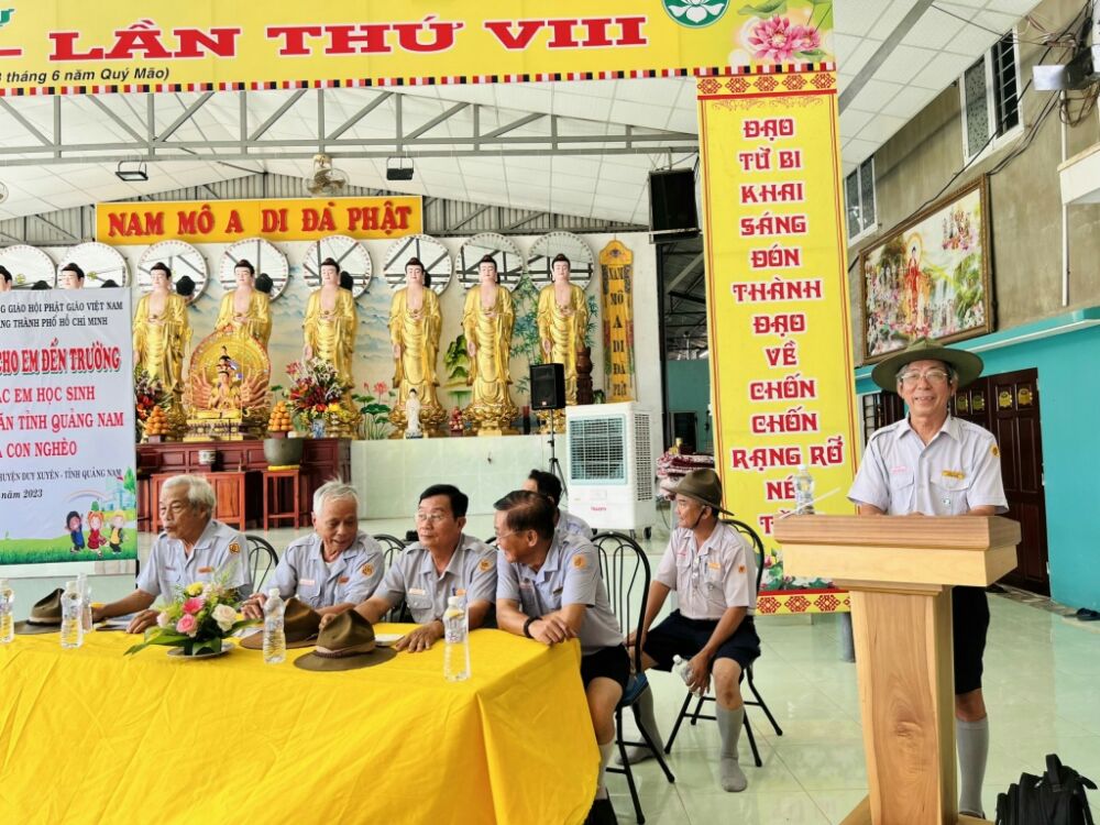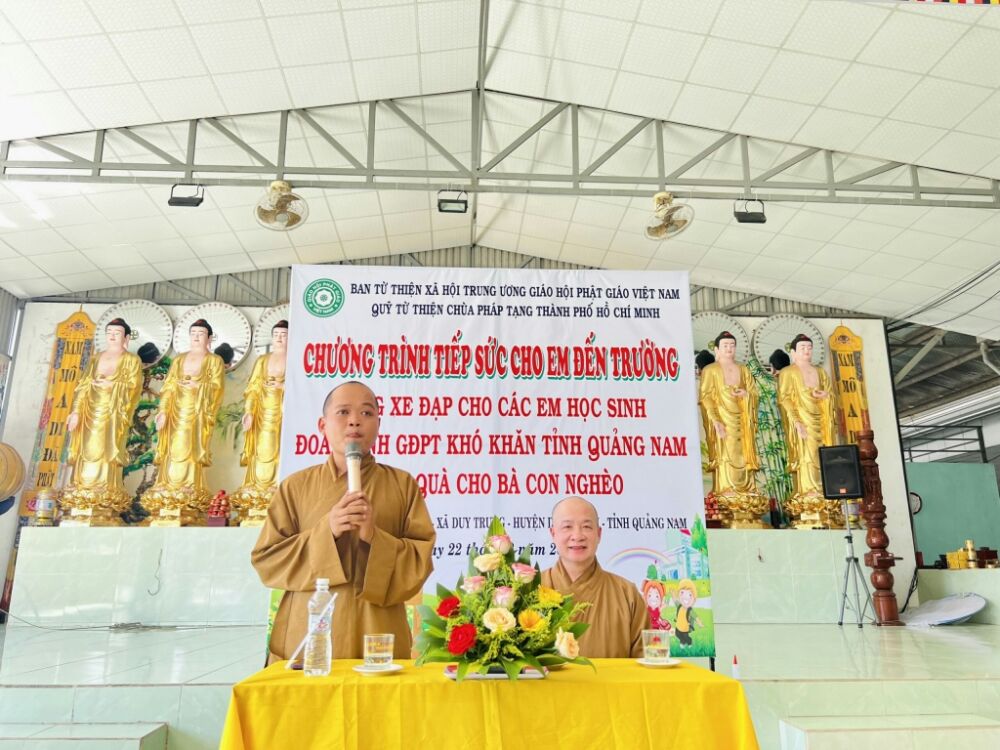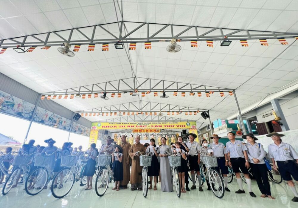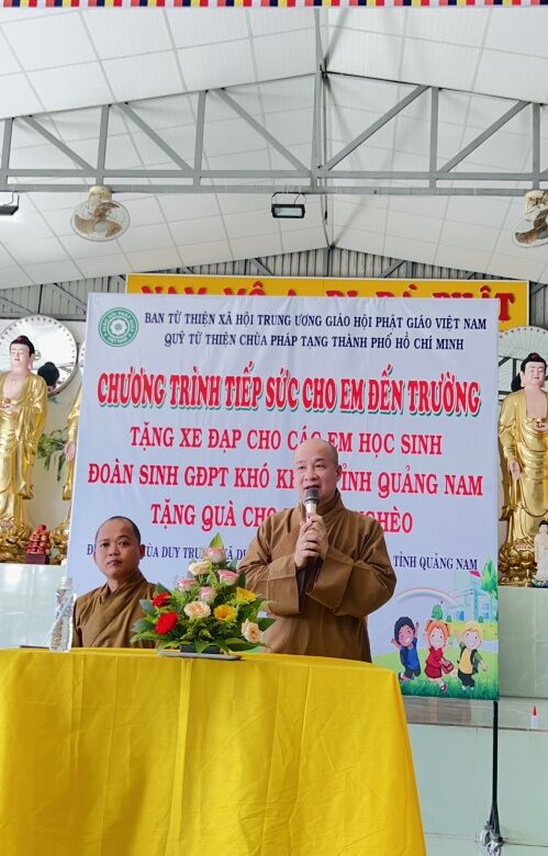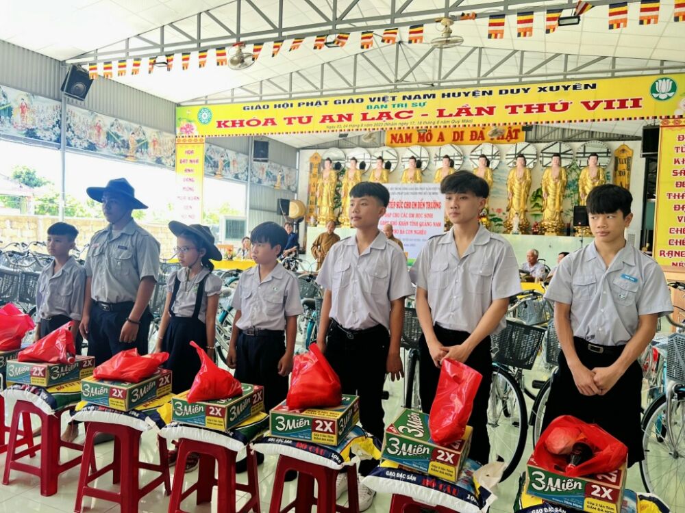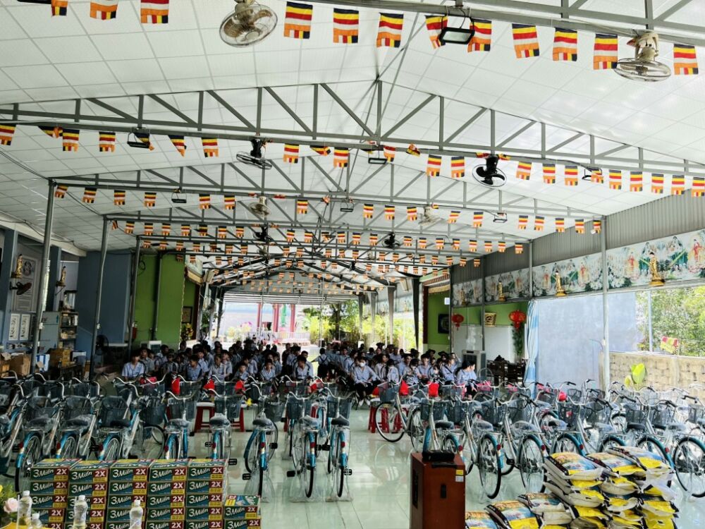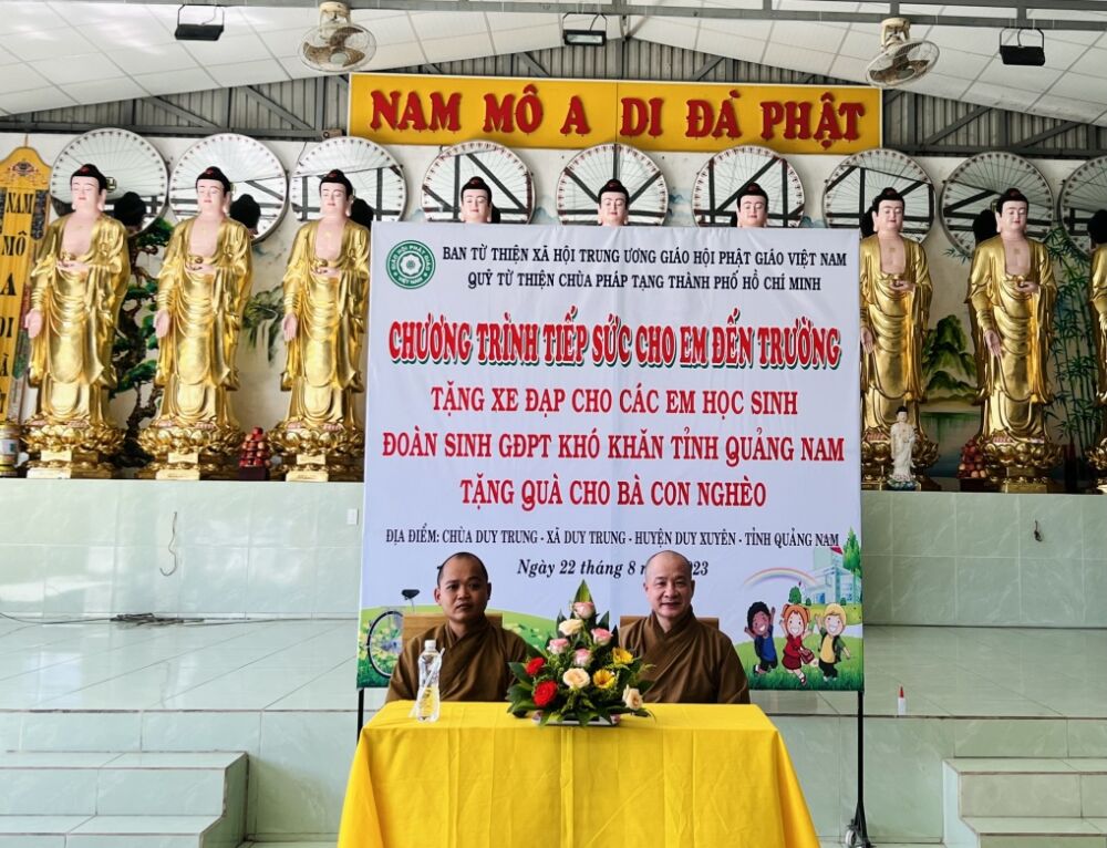 Sáng 22/8/2023 (mồng 7/7/Quý mão) tại giảng đường chùa Duy Trung , huyện Duy Xuyên – Tiểu Ban TTXH PB GĐPT TW & Quỹ từ thiện Chùa Pháp Tạng Tp HCM phối hơp cùng BHD Phân Ban GĐPT Quảng Nam tổ chức Tặng 50 phần quà & 50 chiếc xe đạp (trong Chương Trình tiếp sức đến trường) cho các em Đoàn Sinh của 11 Huyện Thị , Thành phố thuộc GĐPT Quảng Nam.