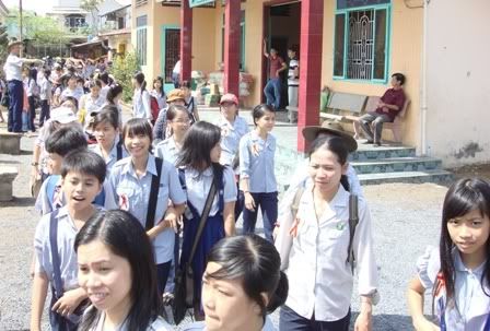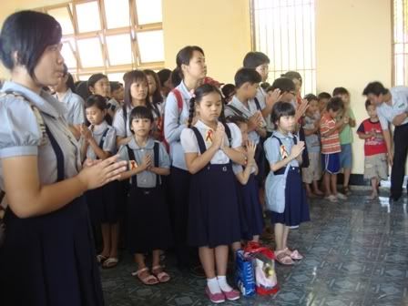 Tặng quà của đoàn sinh cho các em ở trong trường