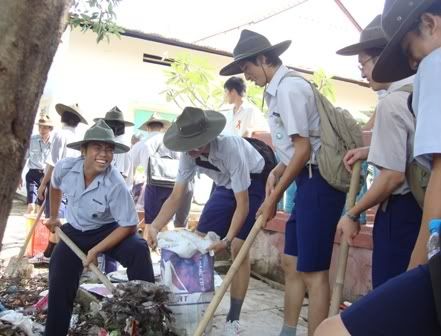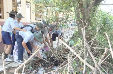 Sau lễ khai mạc, các Đoàn sinh ngành Nam đã thực hiện công tác vệ sinh khu vực xung quanh chùa, phát quang bụi rậm… và giao lưu vui chơi, tặng quà cho các em tại đây.