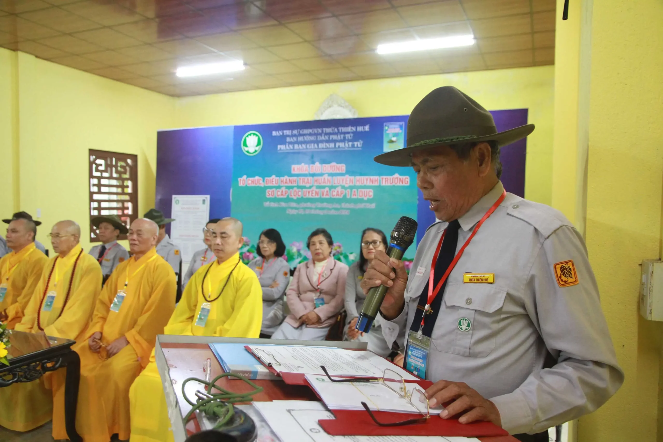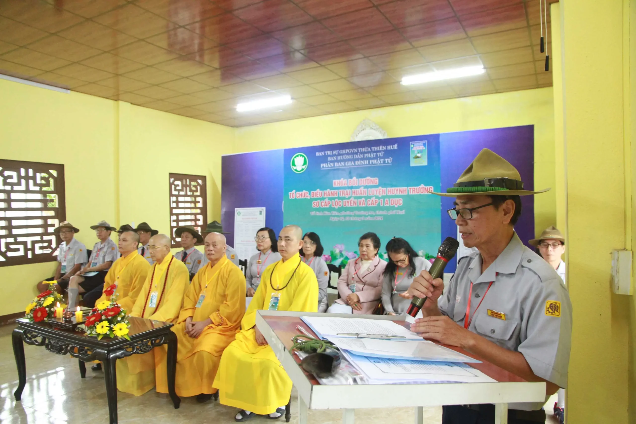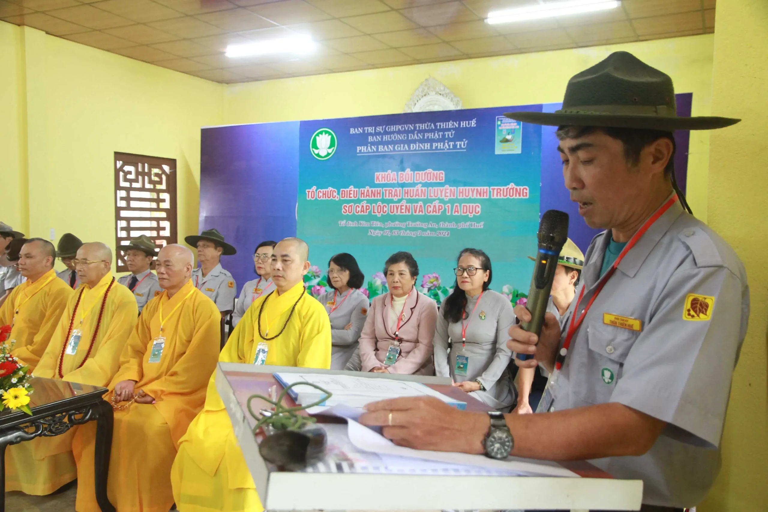 Phát biểu tại lễ khai mạc, Huynh trưởng cấp Dũng Tâm Chánh – Lê Quang Cự, Trưởng Ban Hướng dẫn Phân Ban GĐPT tỉnh cho biết khóa bồi dưỡng lần này ngoài việc tập huấn các kỹ năng chuyên môn để điều hành tốt một khóa trại huấn luyện, còn chú trọng sâu đến công tác rèn luyện, bồi dưỡng phẩm chất, đạo hạnh của một người Huynh trưởng của tổ chức Gia đình Phật tử. Anh mong rằng các Huynh trưởng học viên tham dự sẽ nhìn nhận được trọng nhiệm của mình, ý thức tinh thần tu học rèn luyện để trở thành người đại diện cho tổ chức truyền trao ngọn lửa đến các “Áo lam sen trắng” tiếp nối.