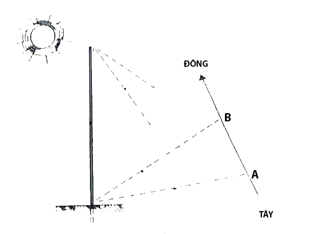 Lúc 13 giờ, bóng gậy lại chạm vào cung tròn đã vẽ tại điểm (B). Nối AB ta có hướng TÂY ĐÔNG chính xác, hay nối chân gậy với trung điểm của AB ta có hướng BẮC NAM.