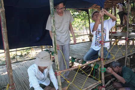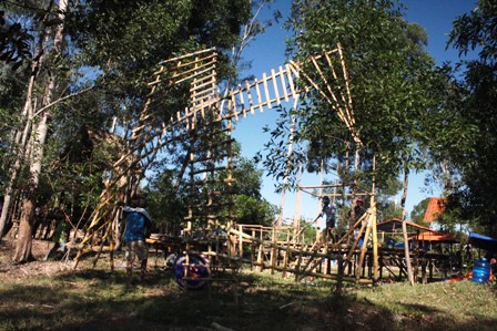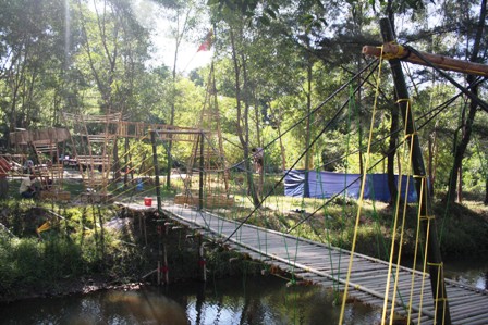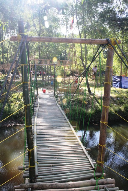 Đầu tiên, chúng tôi đến thăm trại của Gia đình Phật tử Thiên Hương, một ngôi trại sàn được thiết kế bằng tre đang dần được hình thành bên bờ con suối rất đẹp, một chiếc cầu treo cũng bằng tre bắc ngang qua con suối trông rất duyên dáng. Chúng tôi được các anh Huynh trưởng hướng dẫn đi trên chiếc cầu “lắc lư” mà lòng đầy hoan hỷ. Phía trước chiếc cầu, một chiếc cổng cũng bằng tre đang được trang trí và cũng dần hoàn thành. Nhìn chung, khi hoàn thành chắc chắn đây là một khu trại đẹp, liên hoàn và rất duyên dáng.