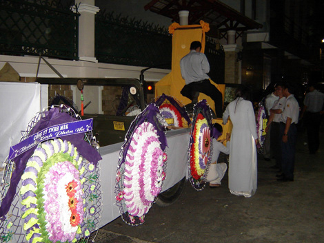 Bên ngoài không gian lễ truy niệm của Gia đình Phật tử Việt Nam, các Huynh Trưởng và Đoàn sinh GĐPT Tp.HCM đang tích cực chuẩn bị phương tiện, trang trí xe Di Đà phóng quang, xe ảnh triệu… để sáng hôm sau (14/3) đưa tiễn Anh đến an nghỉ tại nghĩa trang Quảng Bình, Gò Dưa, Thủ Đức. Không khí làm việc rất tích cực, khẩn trương và kéo dài suốt đêm với tất cả những tình cảm sâu sắc của anh chị em áo lam dành cho người anh cả của GĐPT Việt Nam mà không ai có thể có được như anh.